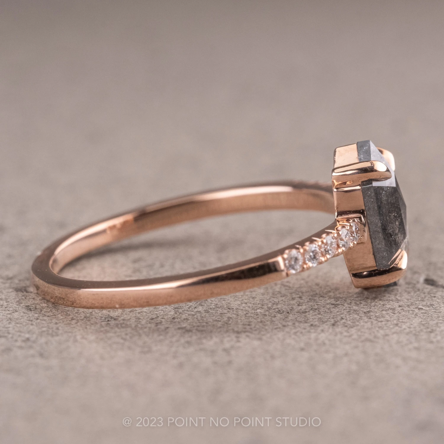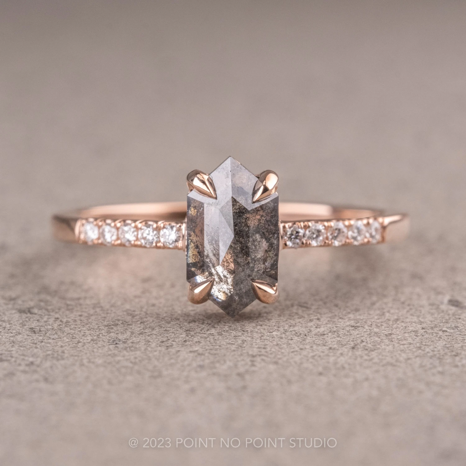 This ring features a beautiful .95 carat natural semi translucent black hexagon shaped diamond. The diamond is a top quality un-enhanced diamond; it is semi-translucent with unique speckling and facets that catch the light. The diamond is set into an open back setting which allows you to see and admire the unique inner structure, tones, and marbling of the diamond.