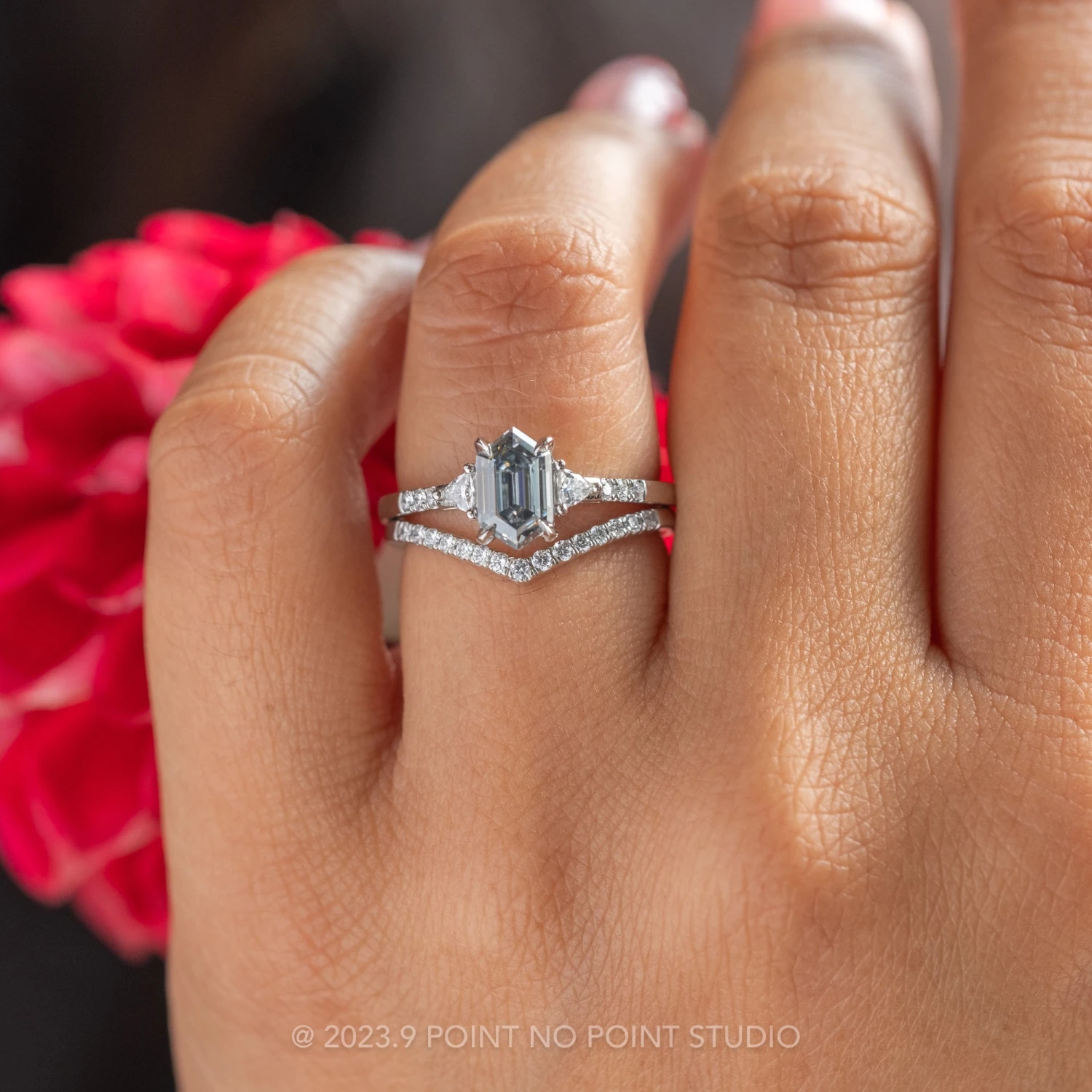 This engagement ring features a mesmerizing 1 carat grey hexagon moissanite. Flanked on both sides by white trillion moissanites, followed by three smaller white round brilliant cut moissanite stones set into the ring band.