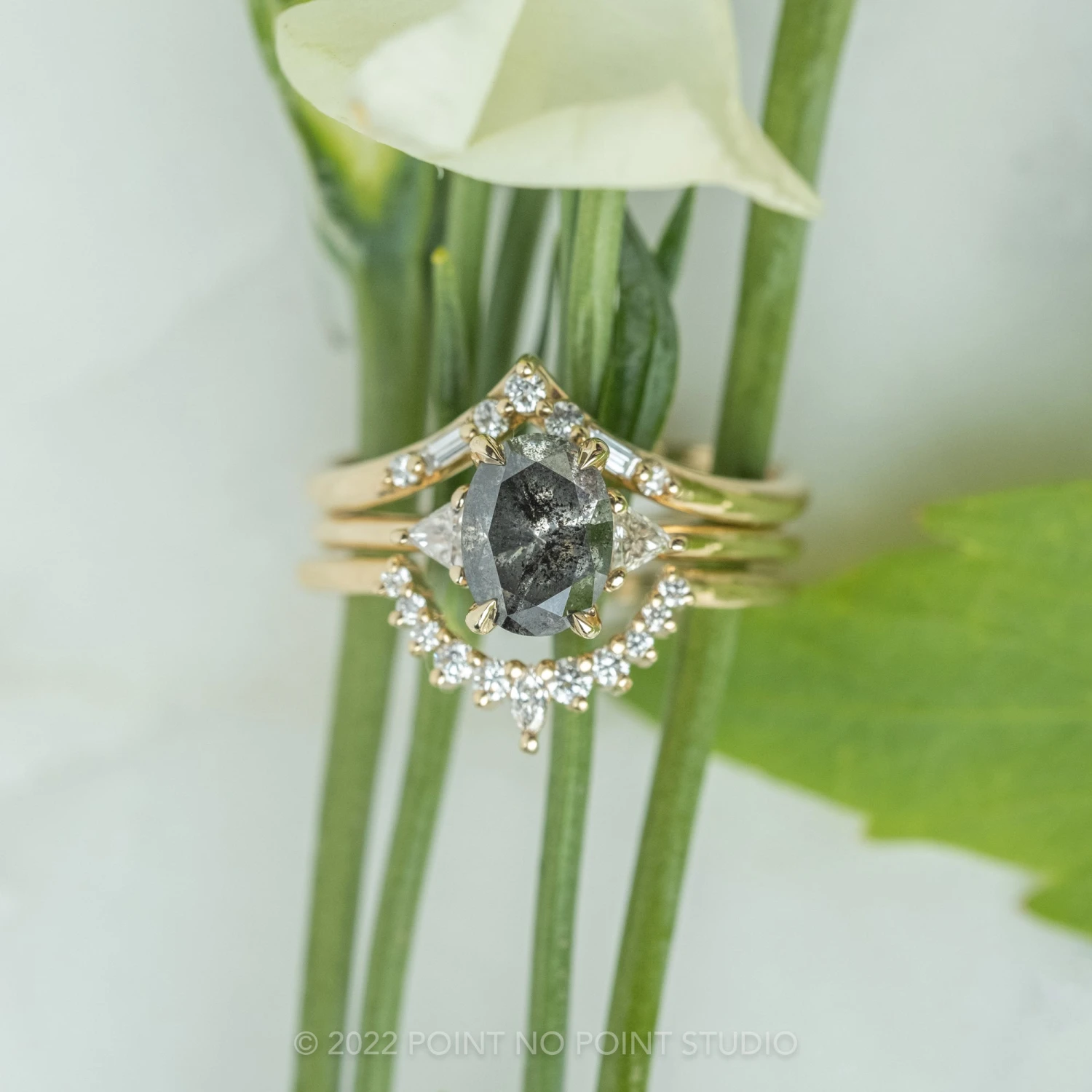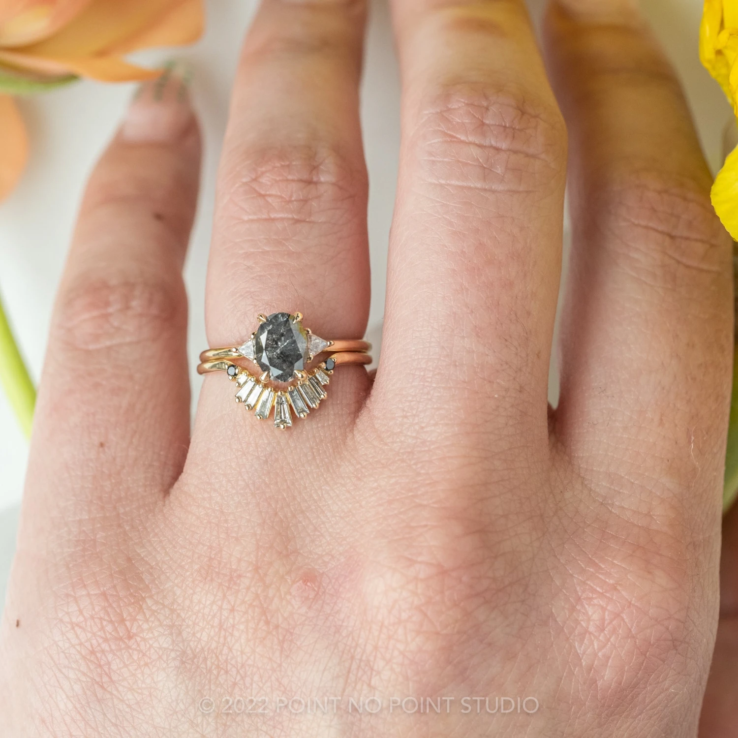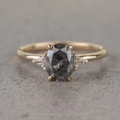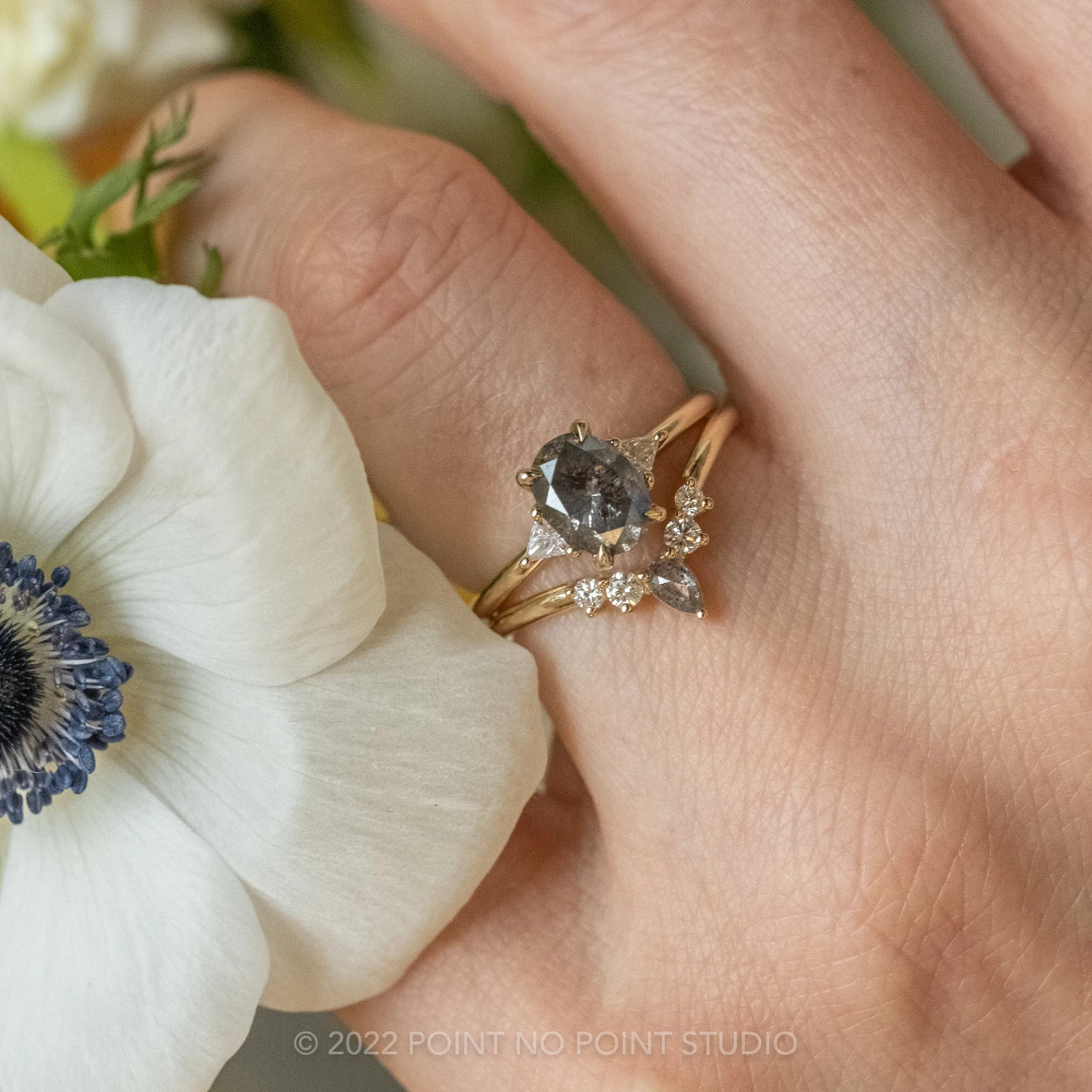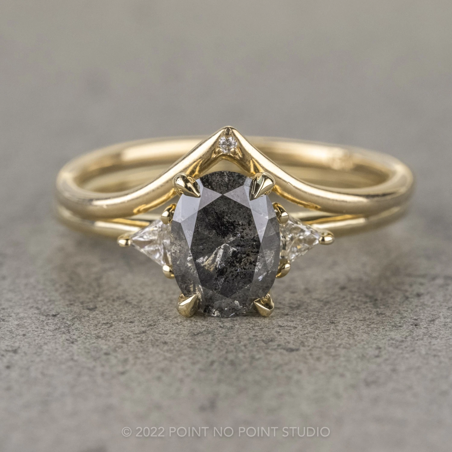 This ring features a beautiful 1.07 carat salt and pepper double cut oval shaped diamond. The diamond is a top quality all-natural diamond; free from heat treatment or enhancing. Set directly on either side of the center stone are GHSI white triangle accent diamonds.