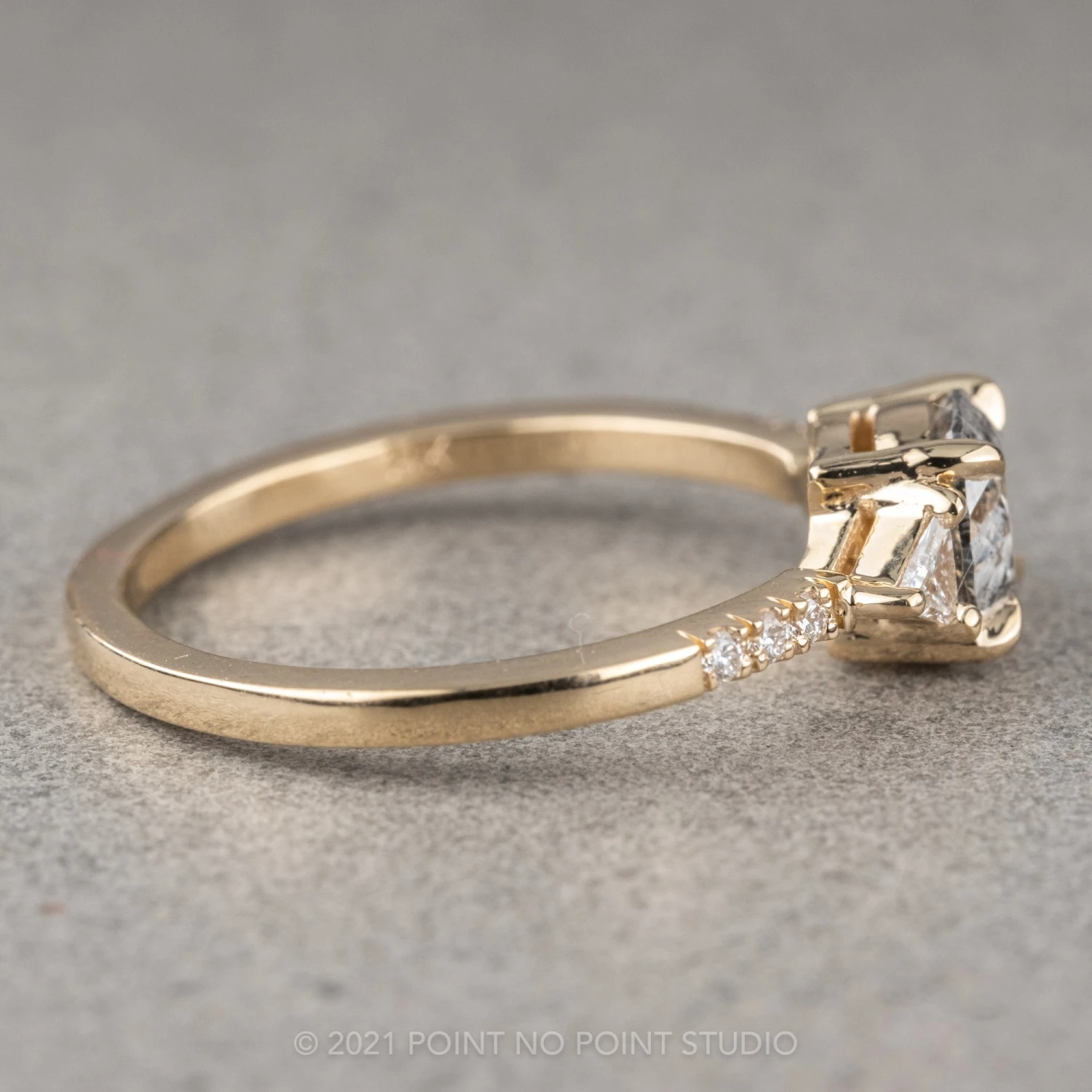 This engagement ring features a mesmerizing and incredibly sparkly 1.05 carat salt and pepper brilliant cut diamond, flanked on either side by white triangle diamonds and accent diamonds in the band. The setting for the diamond sits directly on the finger.