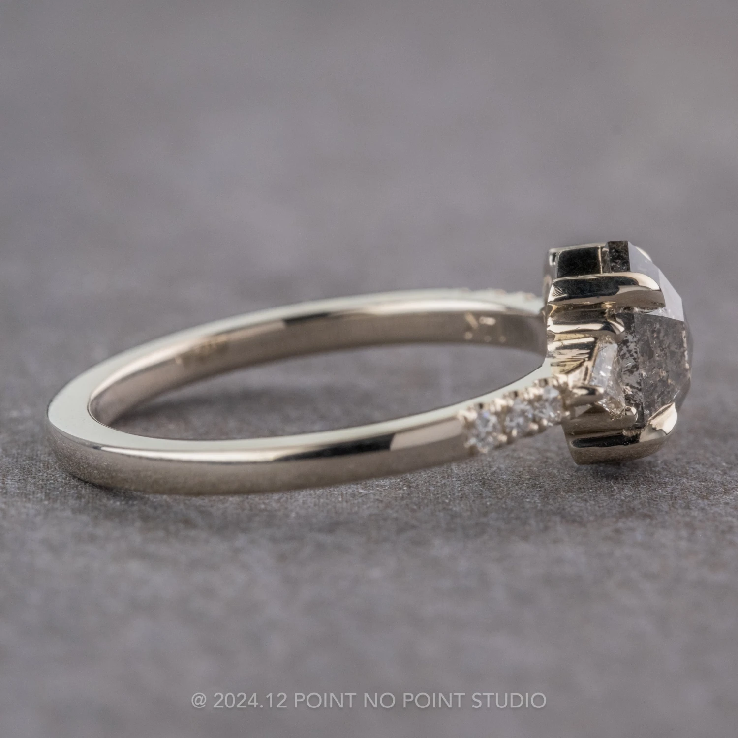 This engagement ring features a mesmerizing 1.07 carat salt and pepper rose cut hexagon diamond. The diamond is a top quality un-enhanced diamond; it is semi-translucent with unique tones and facets that catch the light. Flanked on either side by GHSI white triangle diamonds, followed by GHSI white round accent diamonds set into the band for that extra sparkle!