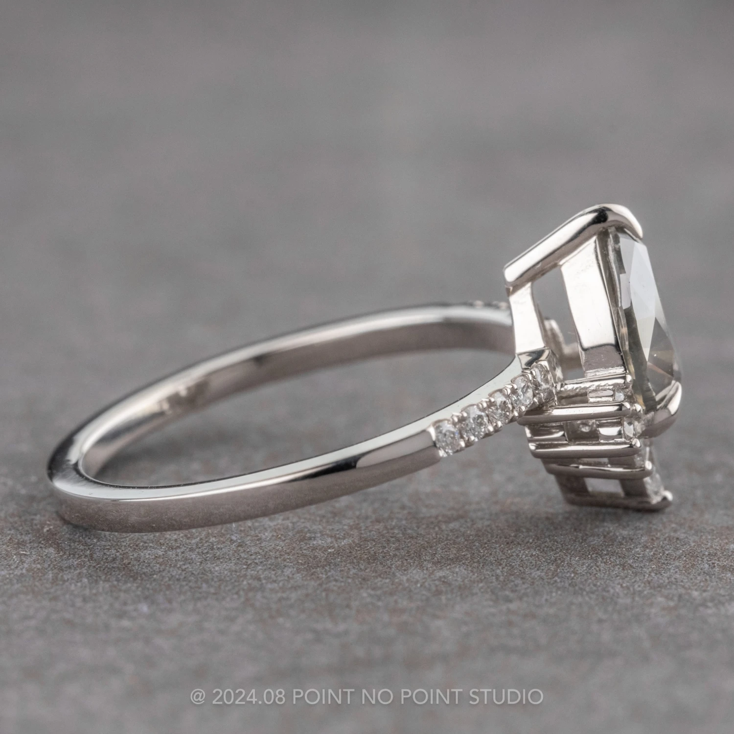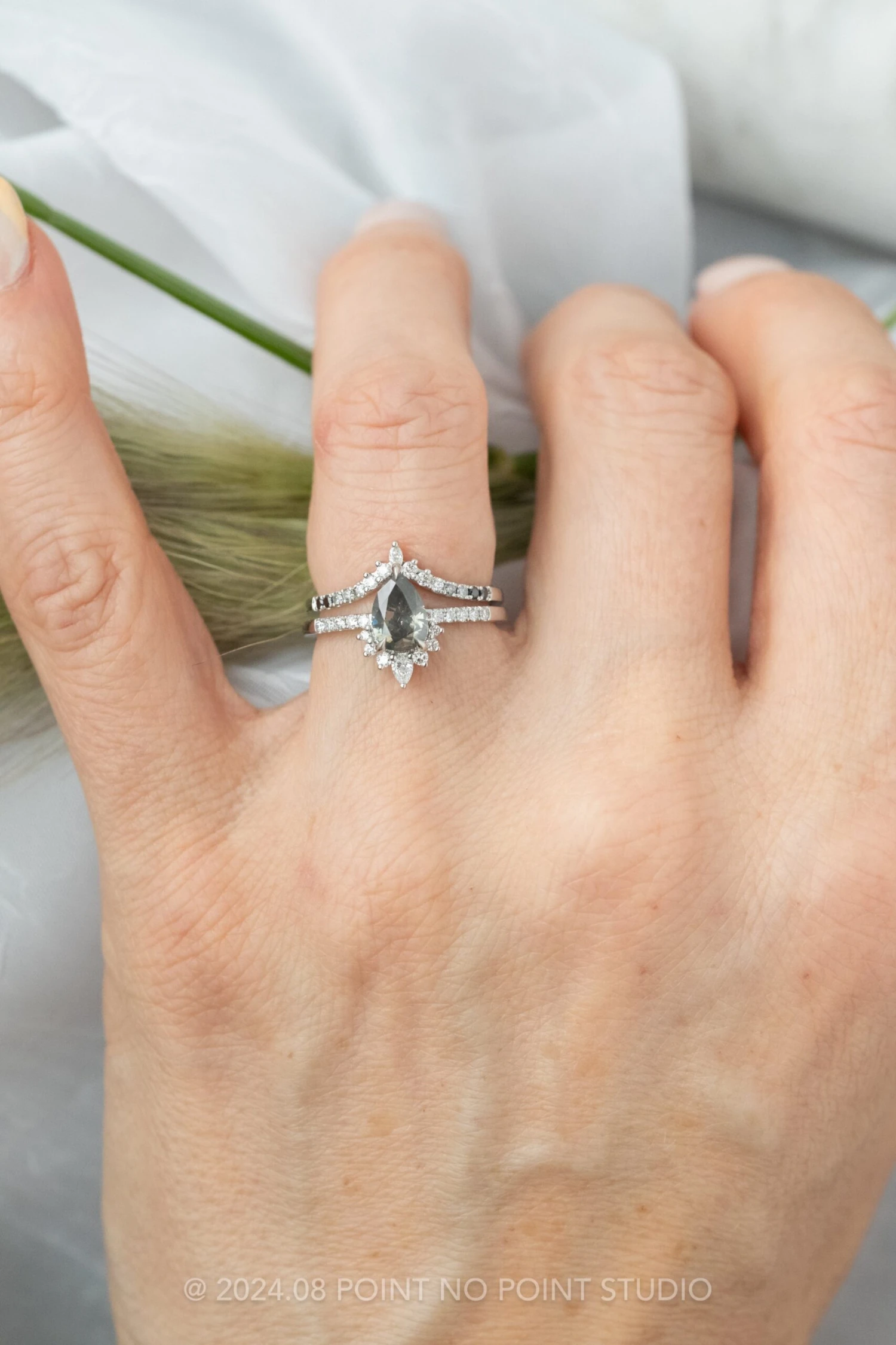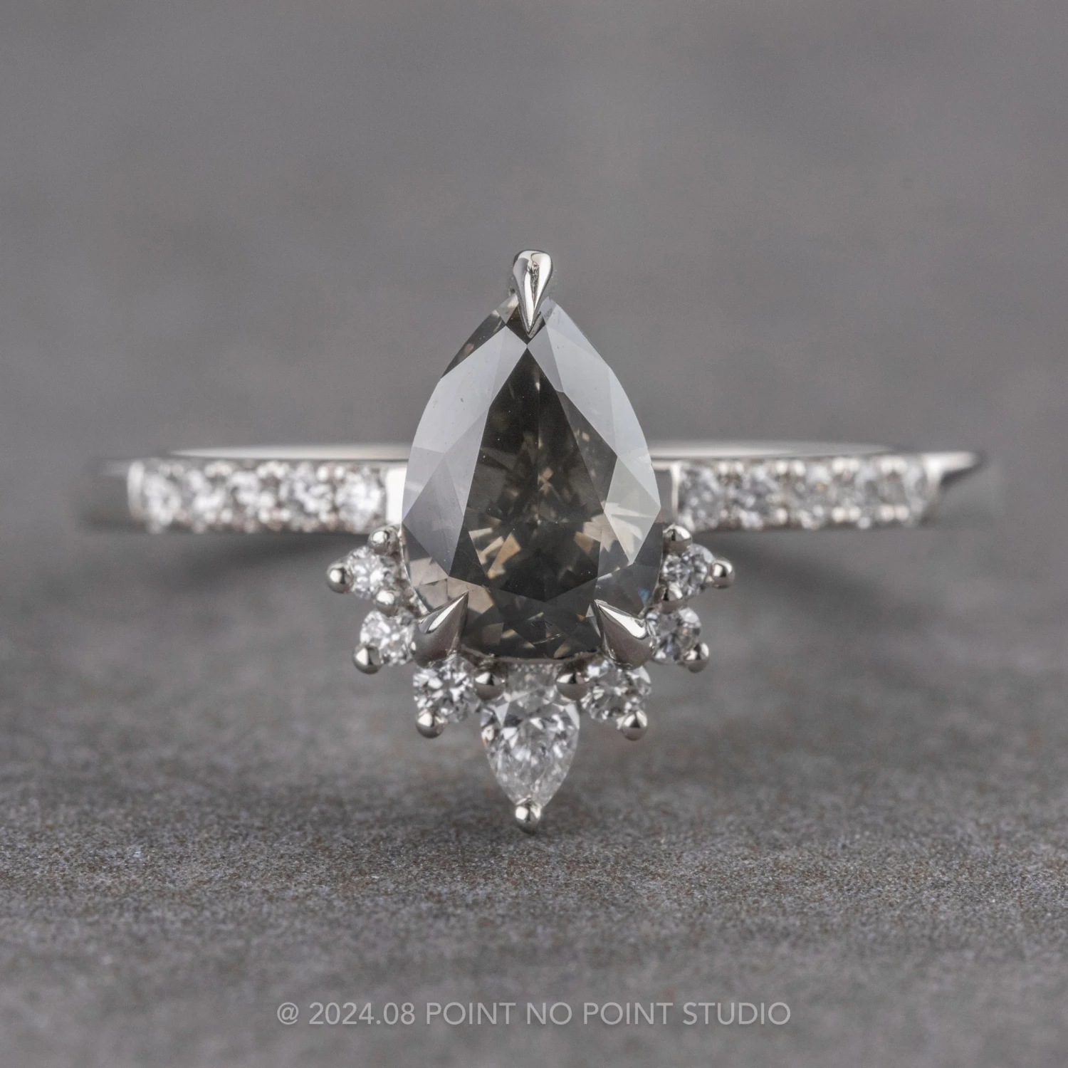 This timeless engagement ring features a STUNNING 1.01 carat fancy grey brilliant cut pear diamond. The diamond is a top quality un-enhanced natural diamond; it is semi-translucent with unique tones and facets that catch the light. The pear diamond sits on top of a sparkly half-halo of GHSI faceted white diamonds with the focal point being a white pear diamond. Set into the band are five GHSI faceted white diamonds to complete the look!