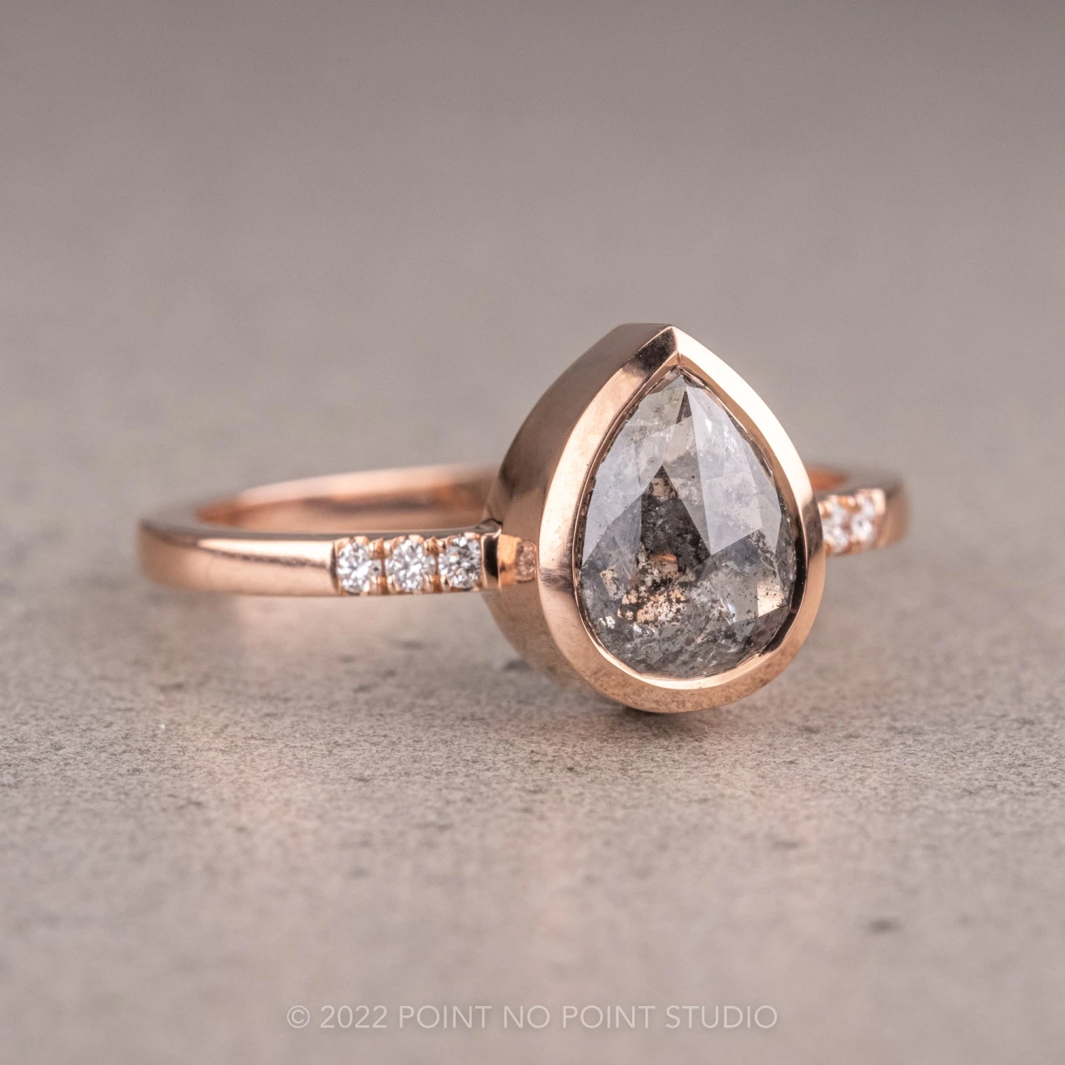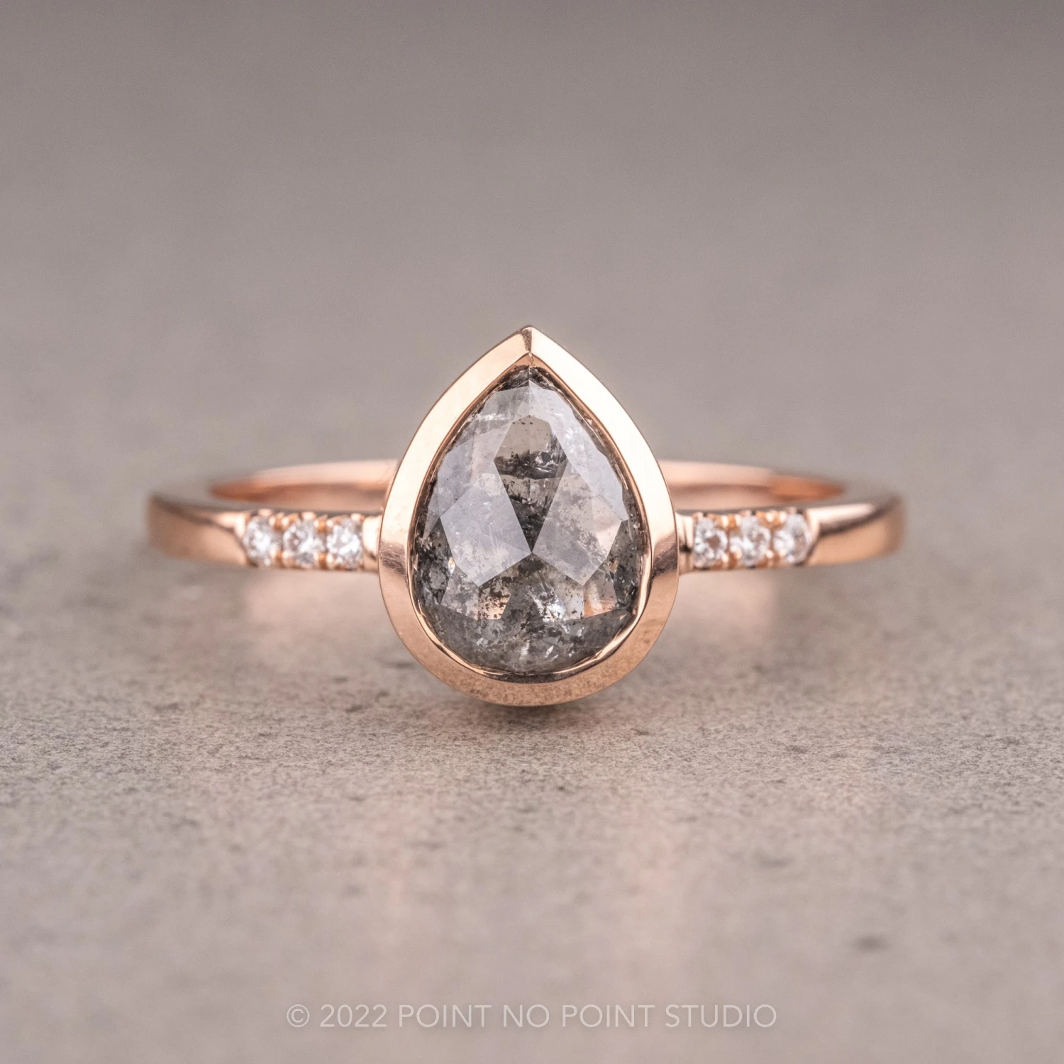 The rose cut pear diamond has been set in a low-profile bezel setting. The bezel fully encompasses the pear diamond. The entire ring is made of recycled 14k rose gold and sits directly on the finger and extremely comfortable to wear.