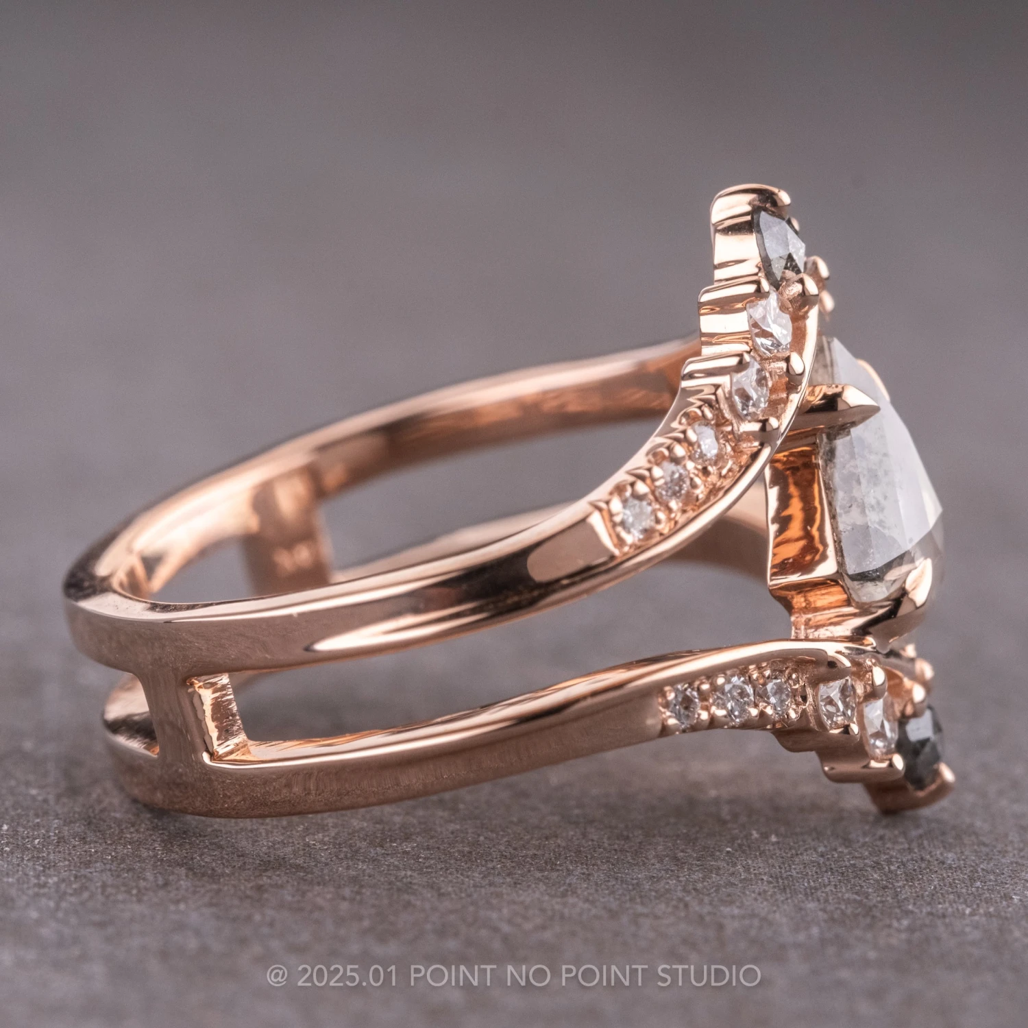 This amazing ring features a gradient tone of natural diamonds. The center stone is a hand cut, 1.01 carat, natural icy salt and pepper kite rose cut diamond. The double band design features grey and white natural diamonds. The kite center diamond is flanked on either side by two crown like diamond setting bands. The entire ring is made of recycled 14k rose gold.