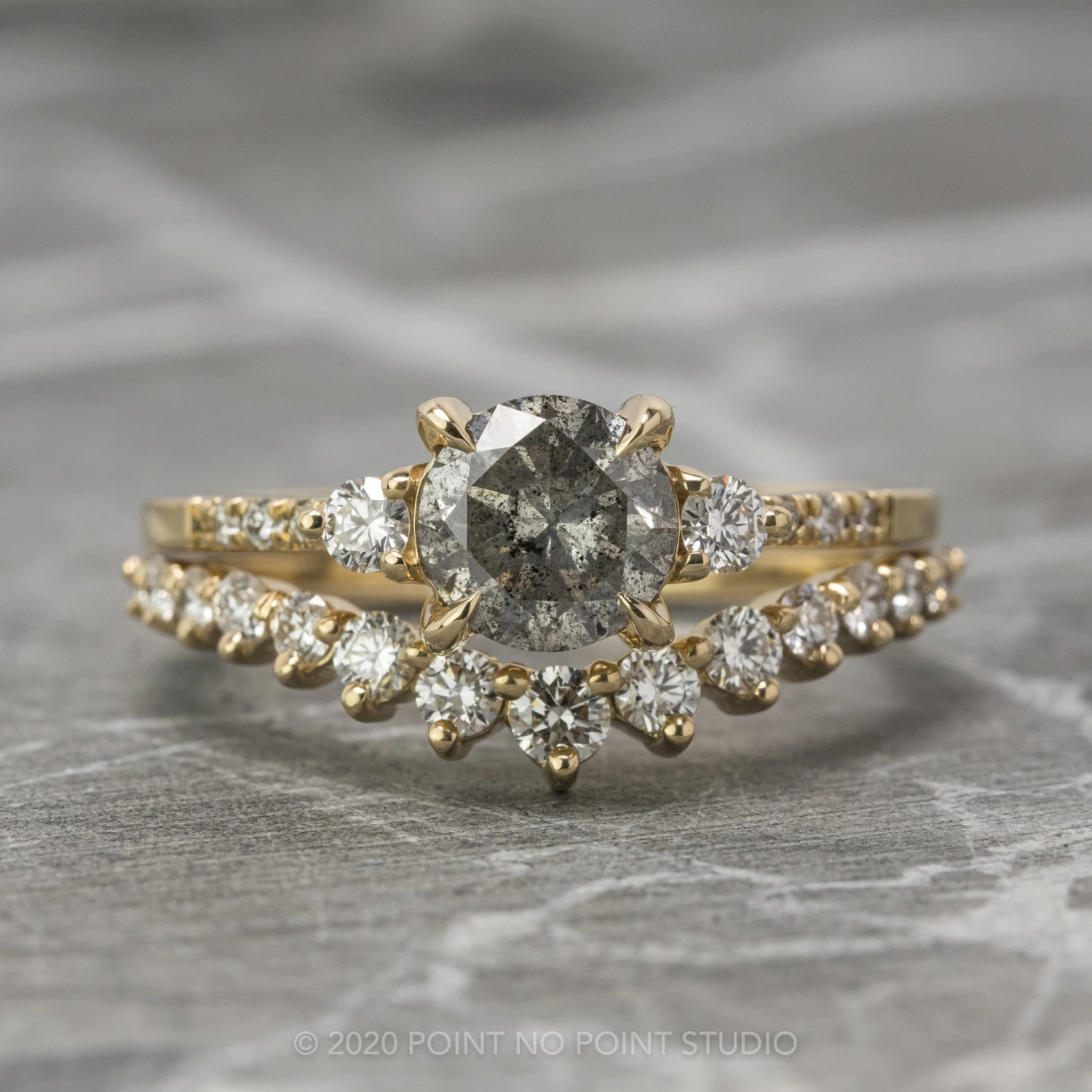 This engagement ring features a mesmerizing and incredibly sparkly 1.15 carat salt and pepper brilliant cut round diamond. The diamond is a top-quality, all-natural stone that has not been heated or treated in any way; it is semi-translucent with unique tones and facets that catch the light beautifully. Flanked on either side by sparkly GHSI white round diamonds, followed by three smaller GHSI white round diamonds set into the band to complete the look!