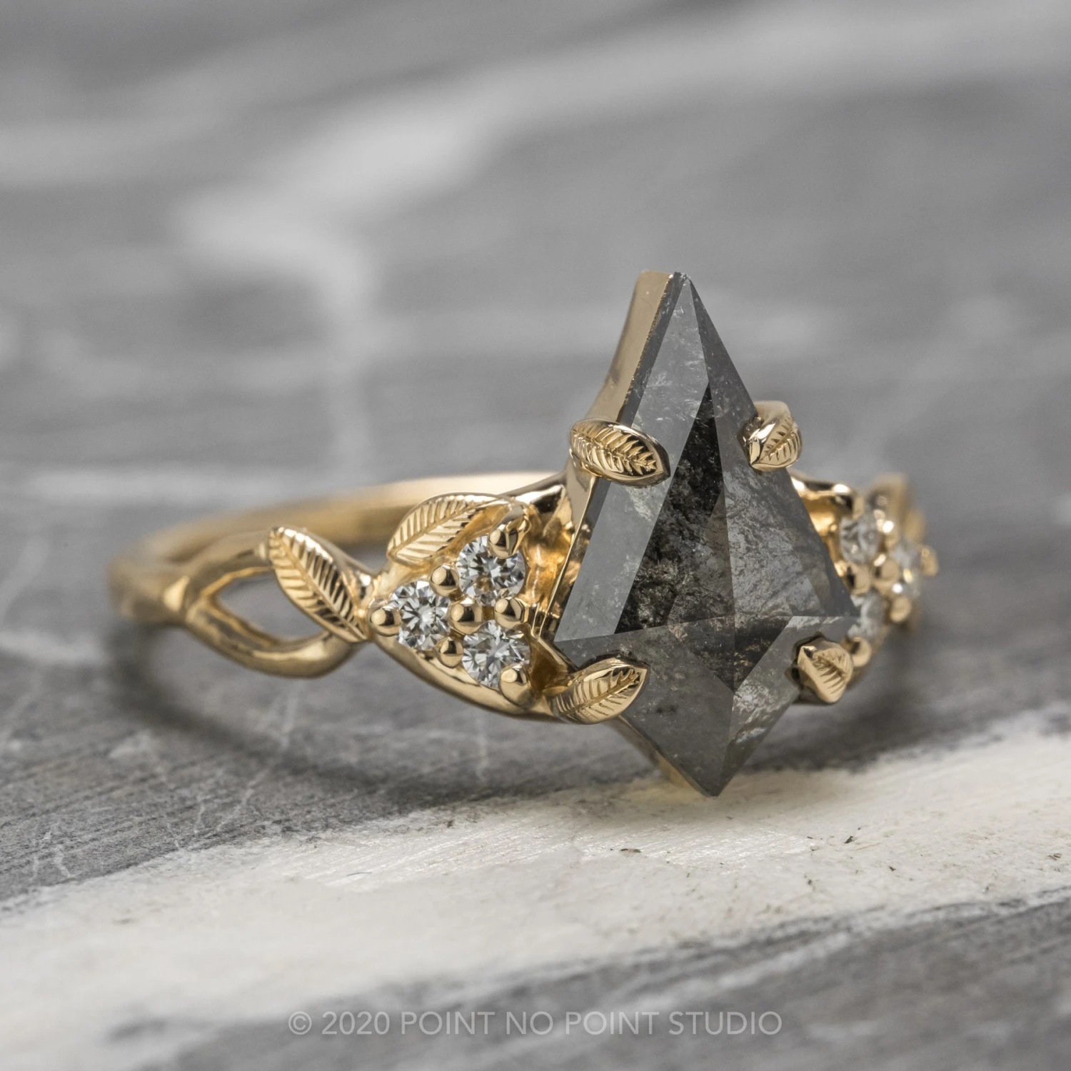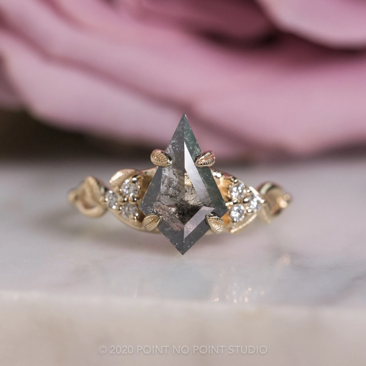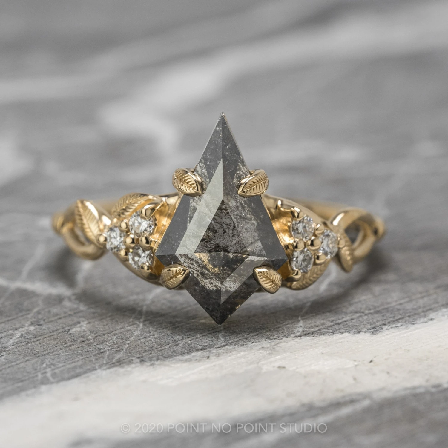 The ring features a 1.28 carat black speckled kite shaped diamond. The kite shaped diamond and the diamonds in the setting are all conflict free. This vintage inspired setting has a leaf pattern that has been hand engraved with a cluster of GH-SI brilliant cut white round diamonds on either side of the center stone.