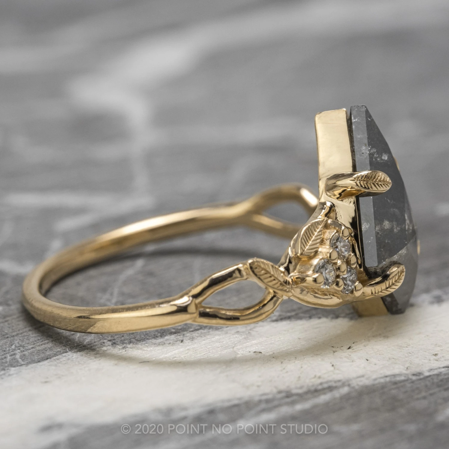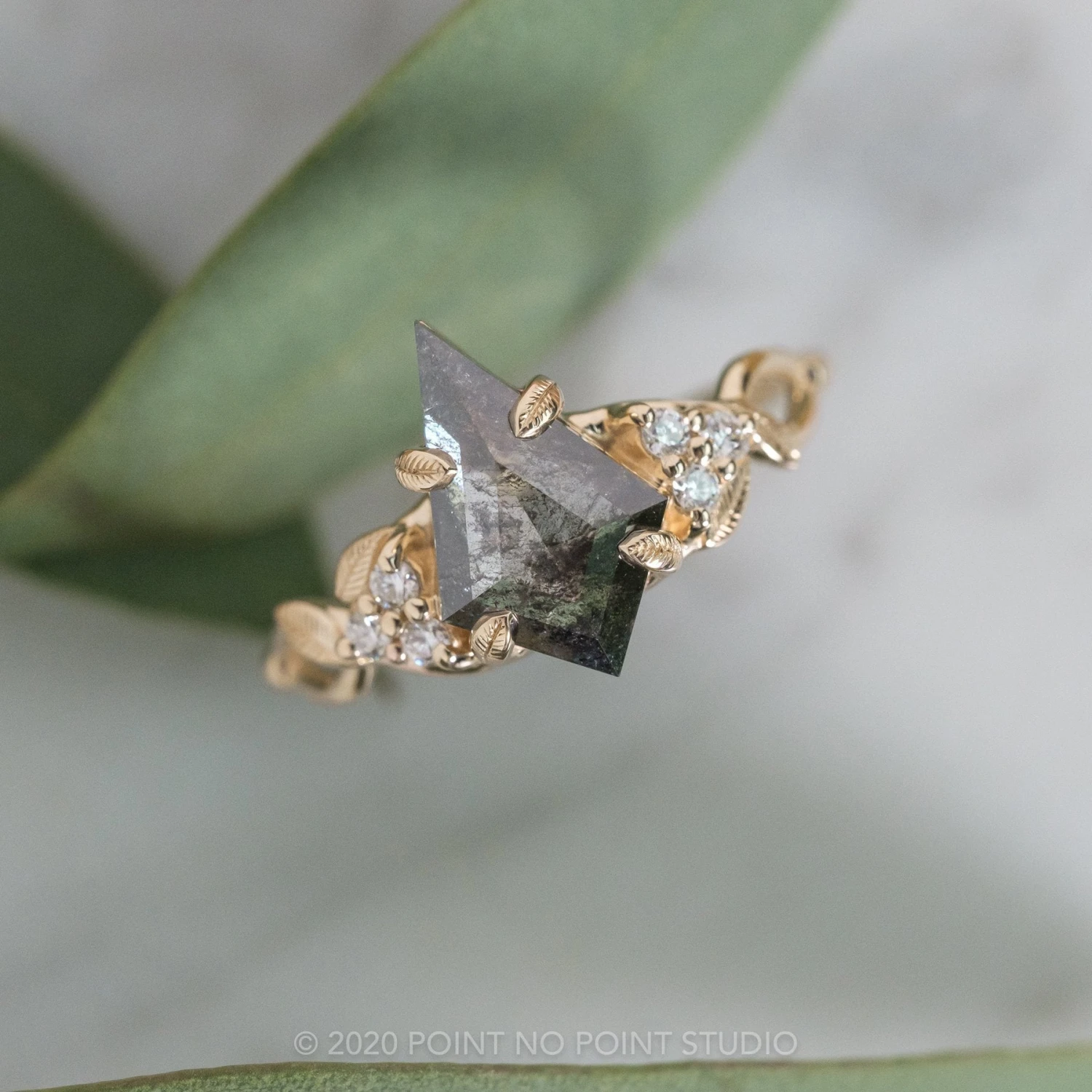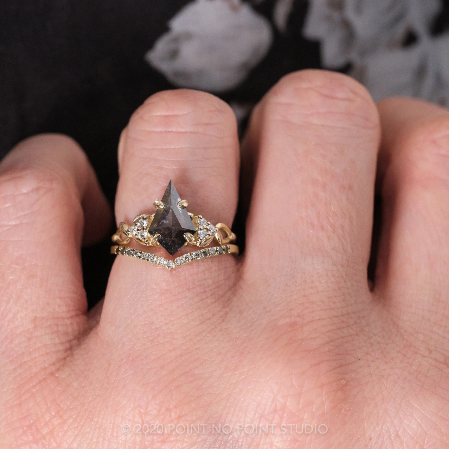The ring features a 1.28 carat black speckled kite shaped diamond. The kite shaped diamond and the diamonds in the setting are all conflict free. This vintage inspired setting has a leaf pattern that has been hand engraved with a cluster of GH-SI brilliant cut white round diamonds on either side of the center stone.