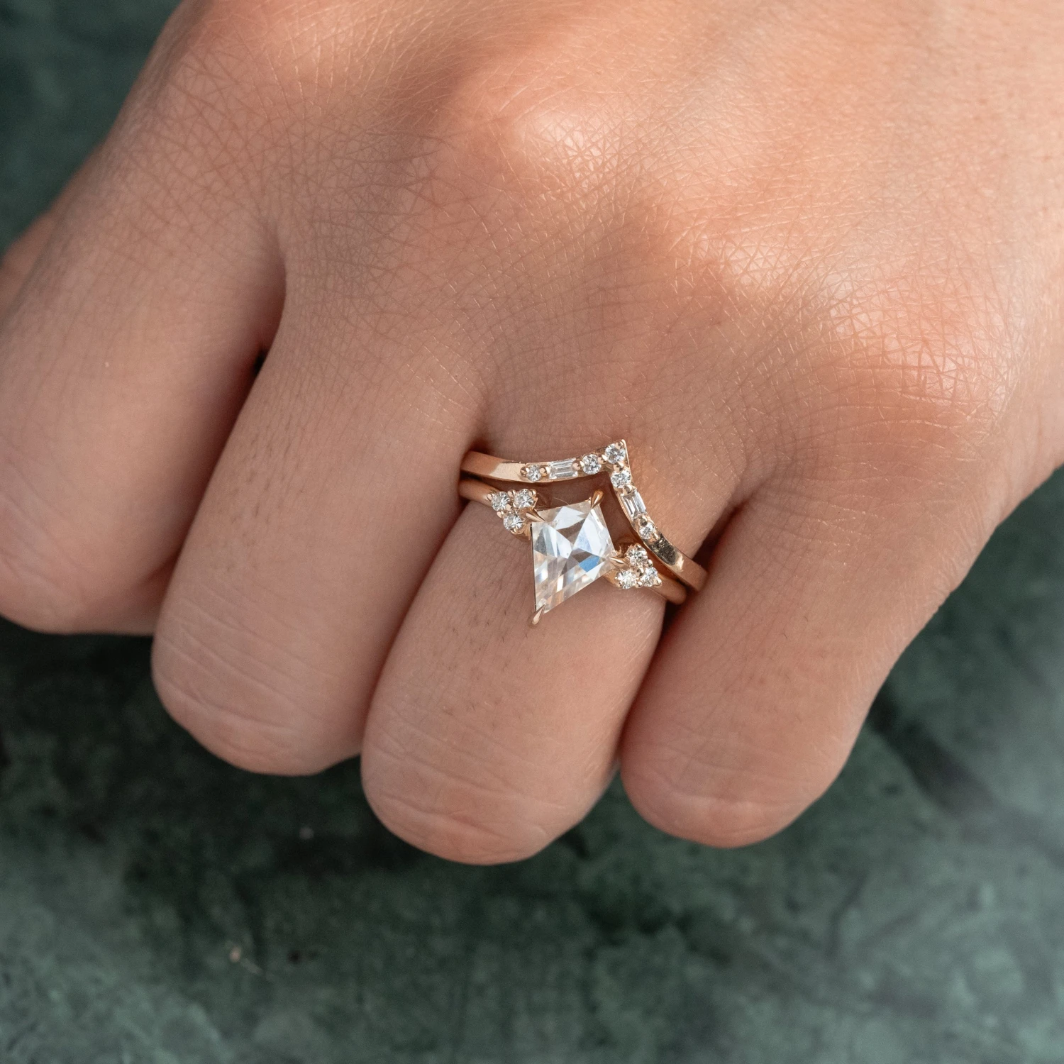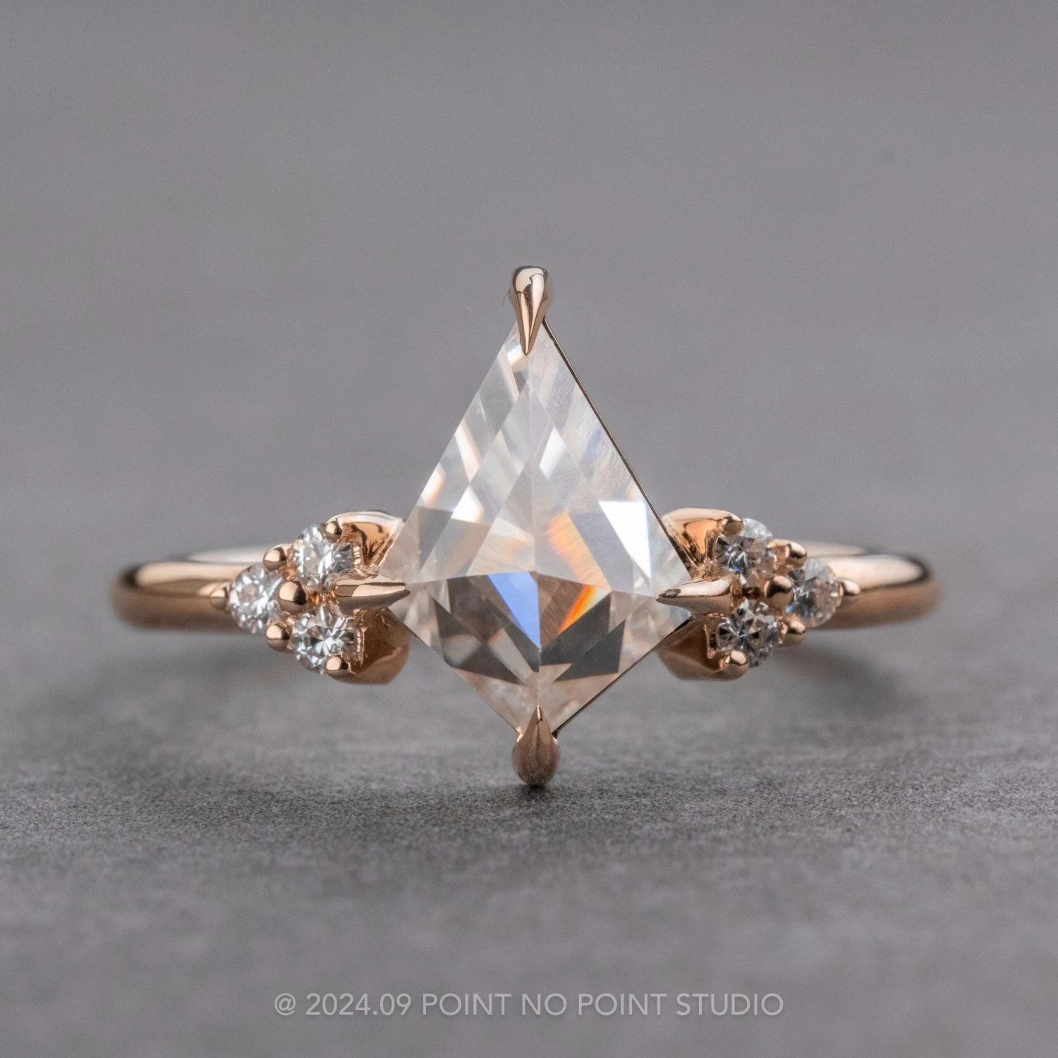 This timeless and unique engagement ring features a striking 1.30 carat rose cut kite shaped moissanite. The kite is flanked on either side by a cluster of sparkly GHSI white round accent diamonds that taper seamlessly into the rings band!