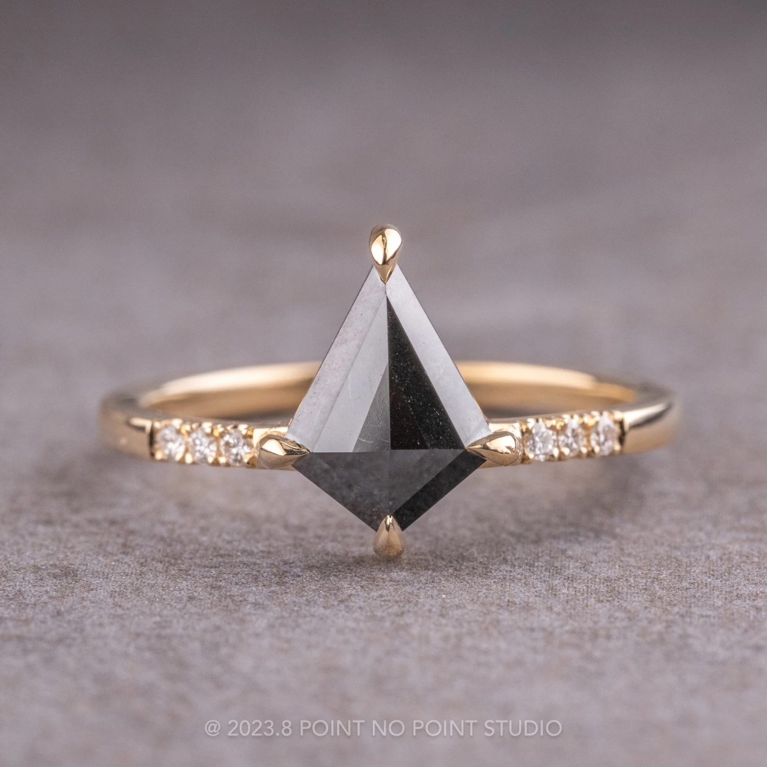 This ring features a beautiful 1.34 carat natural black kite diamond. The diamond is a top quality un-enhanced diamond; it is opaque with unique facets that catch the light. Set into the band on each side of the kite diamond are 3 GHSI white diamonds for that extra sparkle!