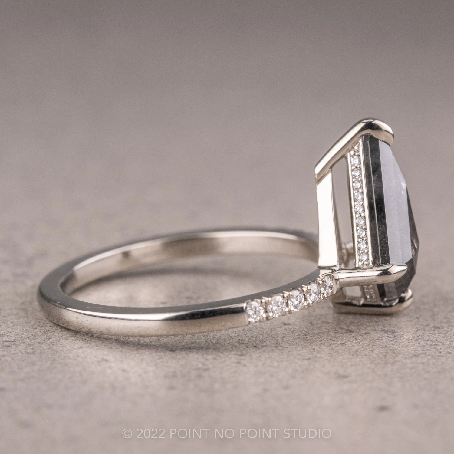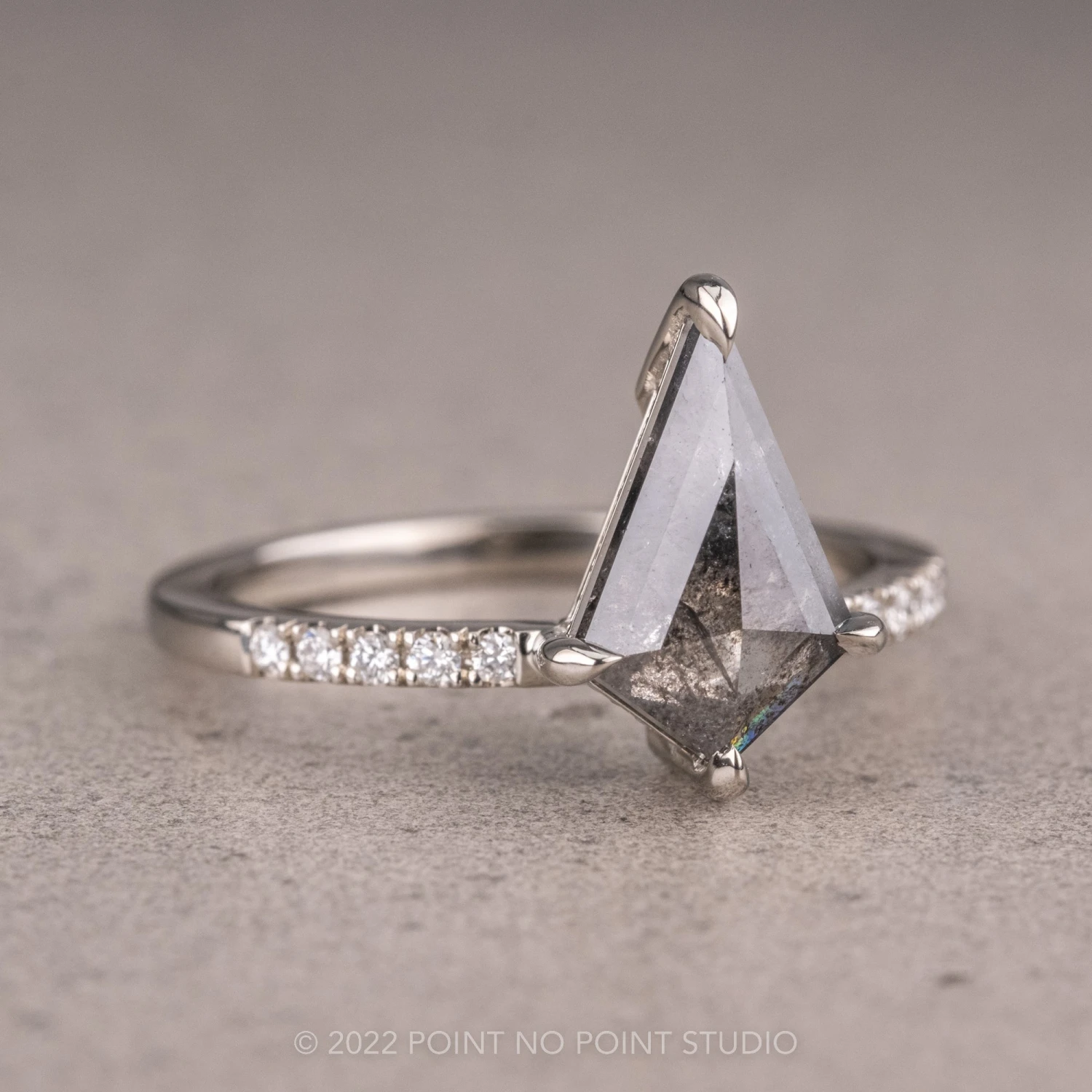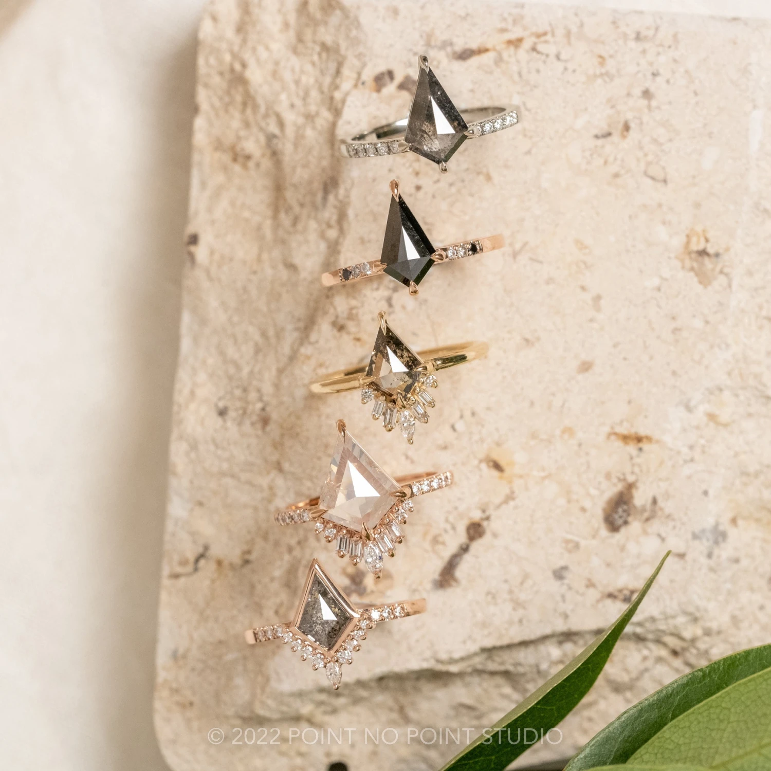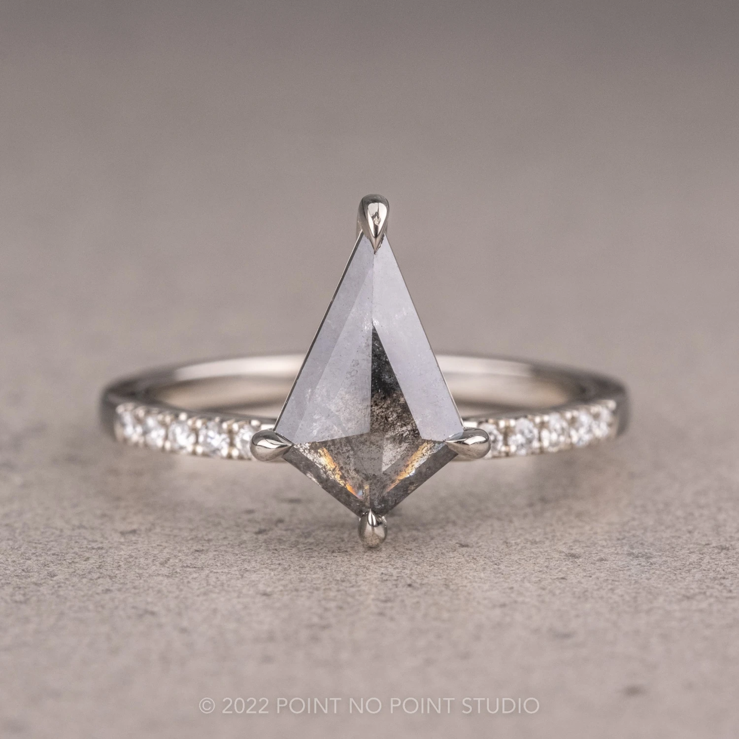 This captivating kite diamond engagement ring is a stunner! The ring features a gorgeous 1.29 carat rosecut salt and pepper kite shaped diamond. The diamond is a top quality natural stone, the color of the diamond is semi-translucent with speckled tones of dark charcoal grey. This unique setting has diamonds micro paved around the center diamond basket giving the ring an extra hidden sparkle! Down each side of the band are 5 white round accent diamonds.