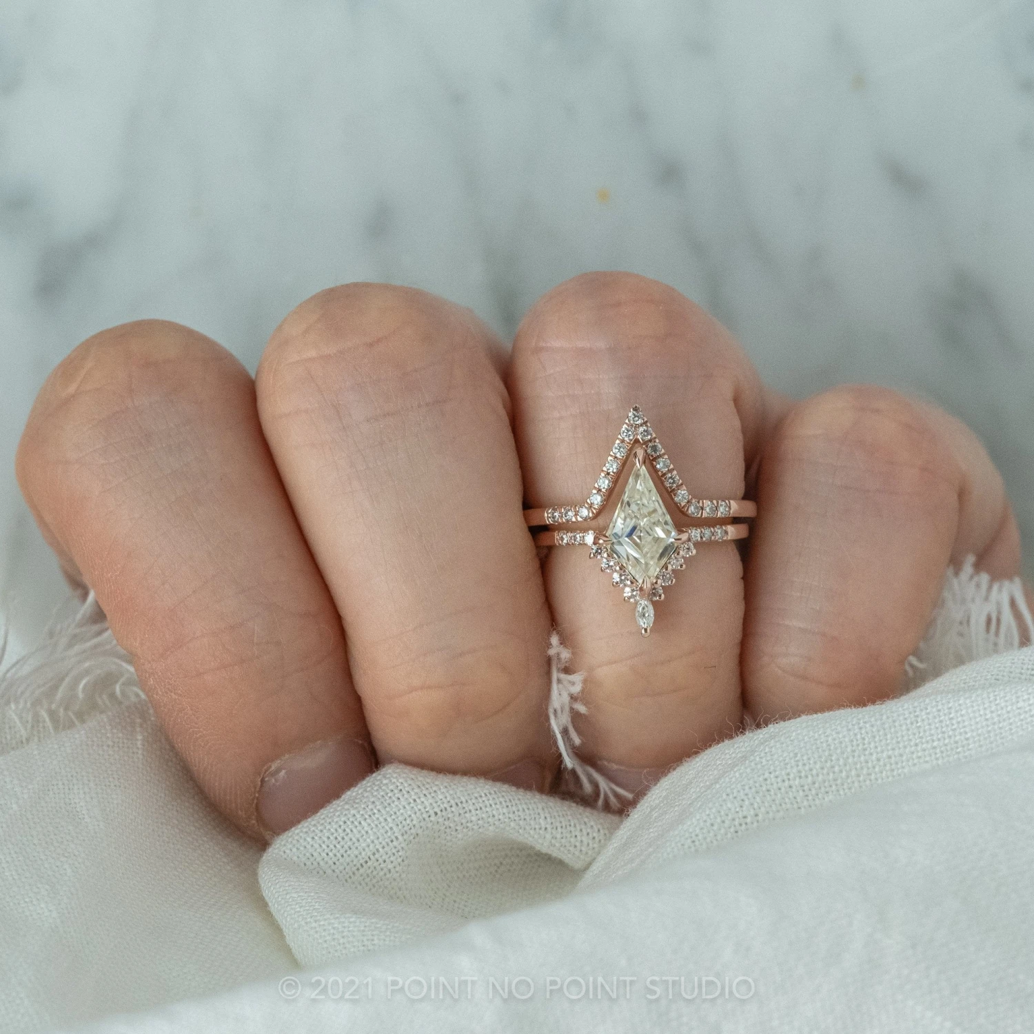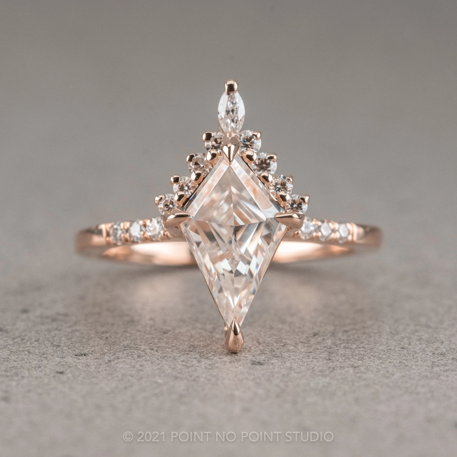 This timeless engagement ring features a stunning kite moissanite. The moissanite has been set in a low profile prong setting with a half-halo of faceted white moissanite. The entire ring is made of 14k rose gold.