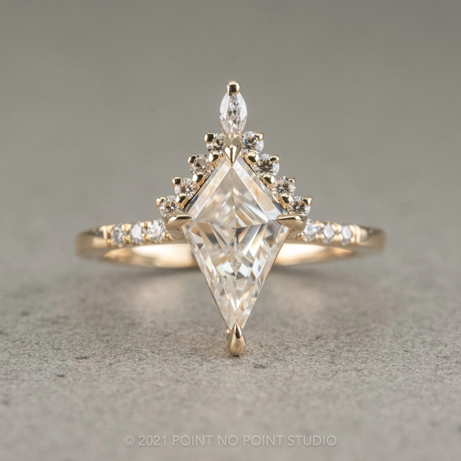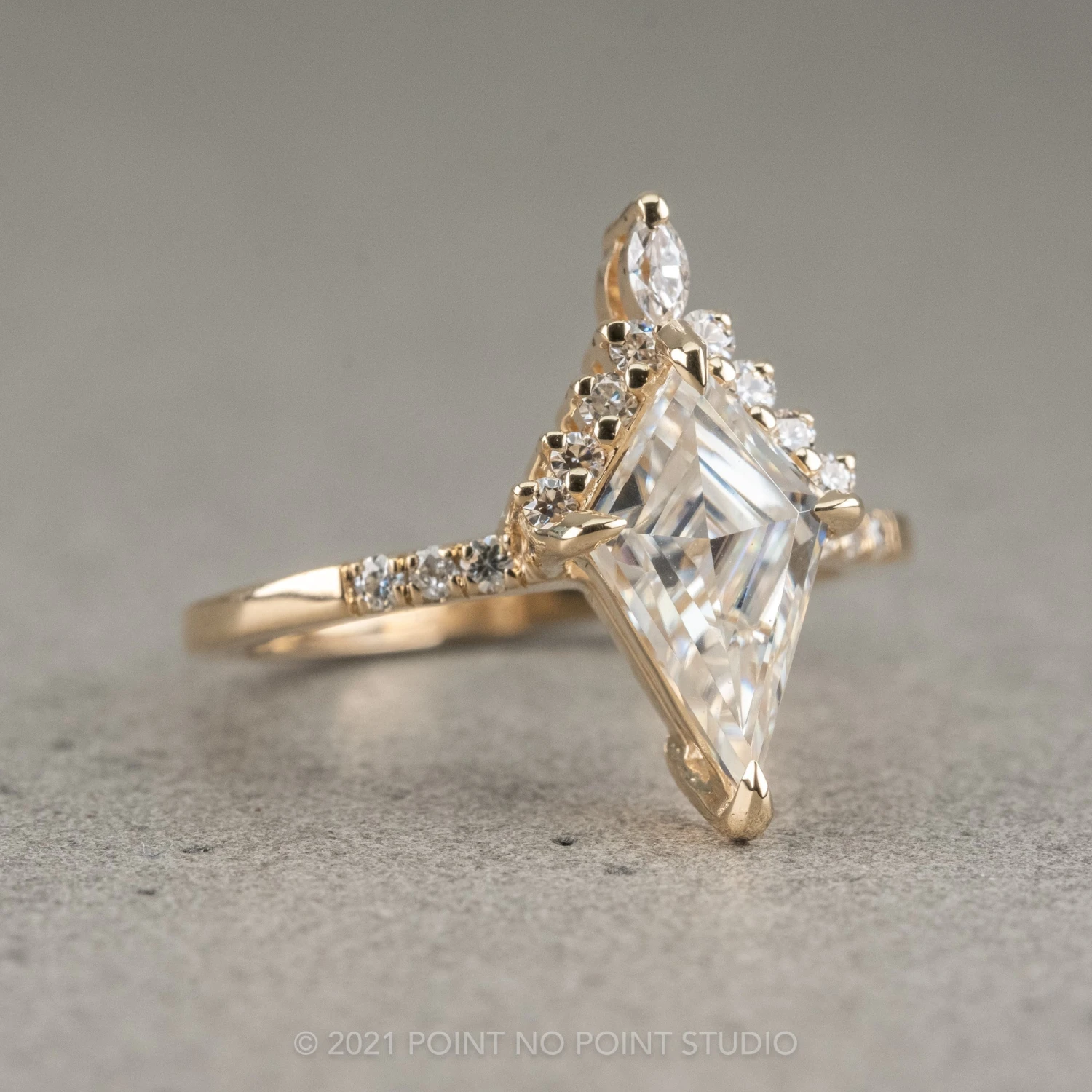 This timeless engagement ring features a stunning kite moissanite. The moissanite has been set in a low profile prong setting with a half-halo of faceted white moissanite. The entire ring is made of 14k yellow gold.