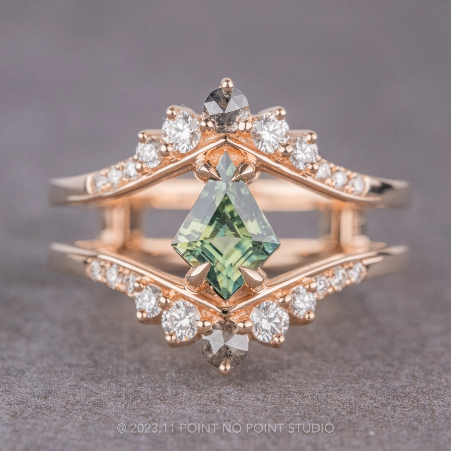 This amazing ring features a gradient tone of natural diamonds. The center stone is a natural 1.03 carat brilliant cut green kite sapphire. The double band design features grey and white natural diamonds. The geometric center sapphire is flanked on either side by two crown like diamond setting bands. The entire ring is made of recycled 14k rose gold.