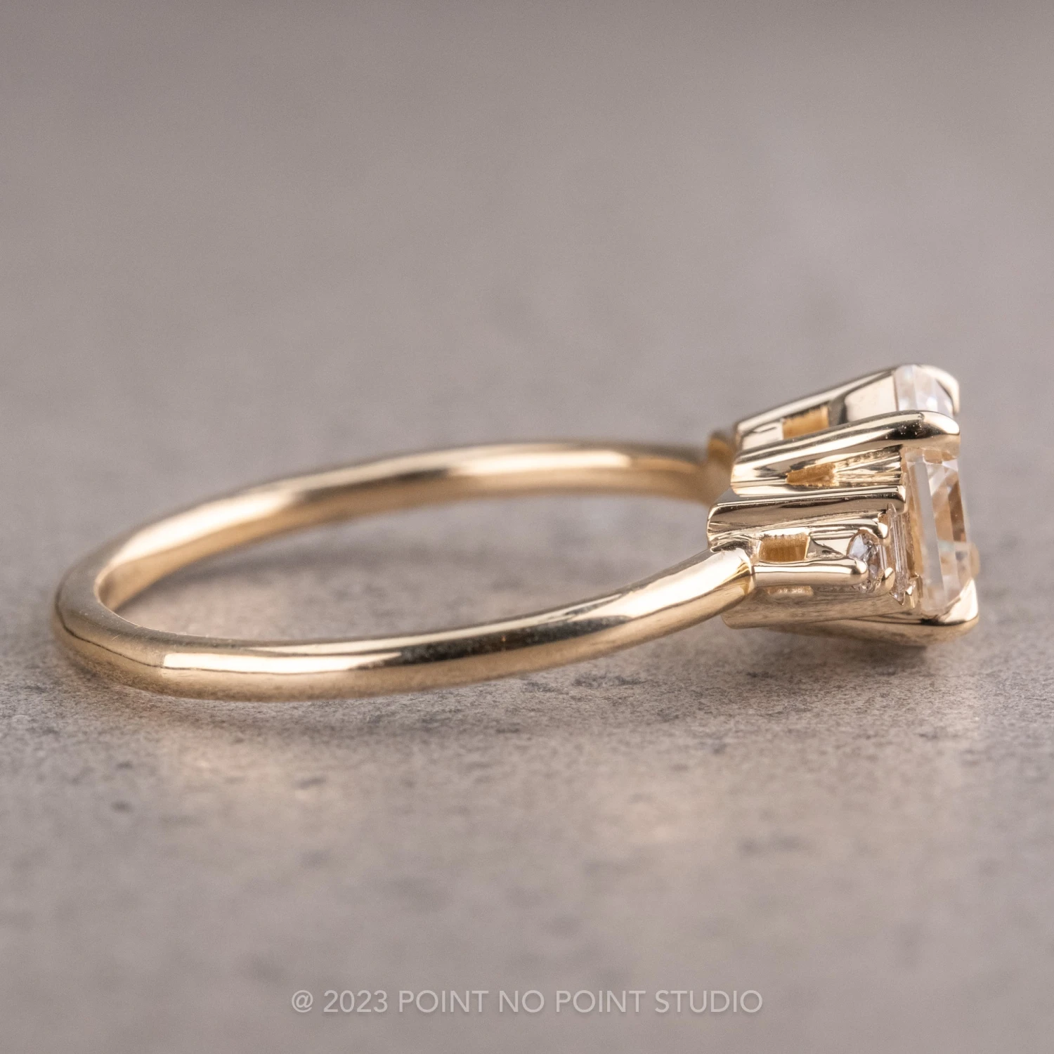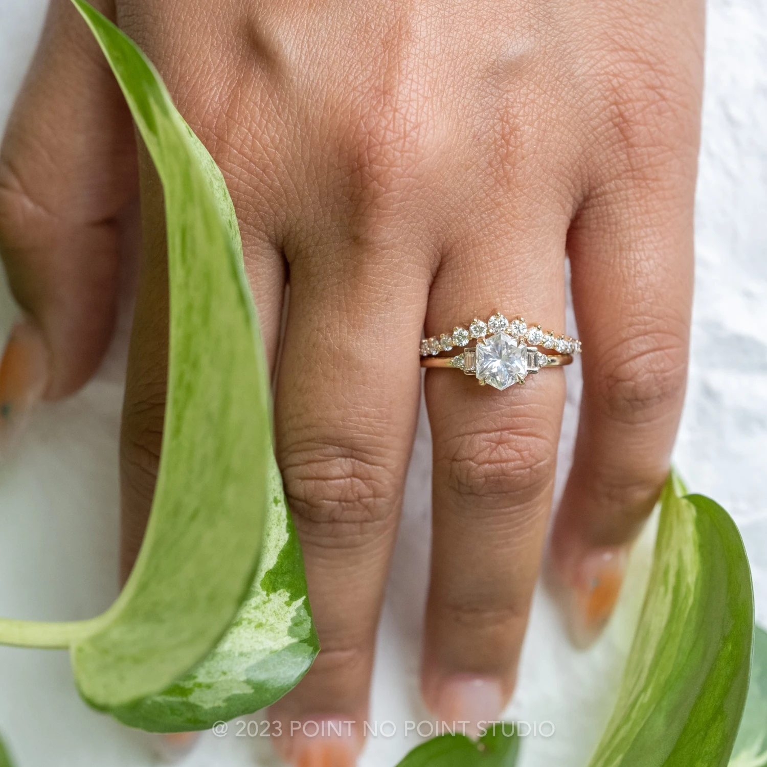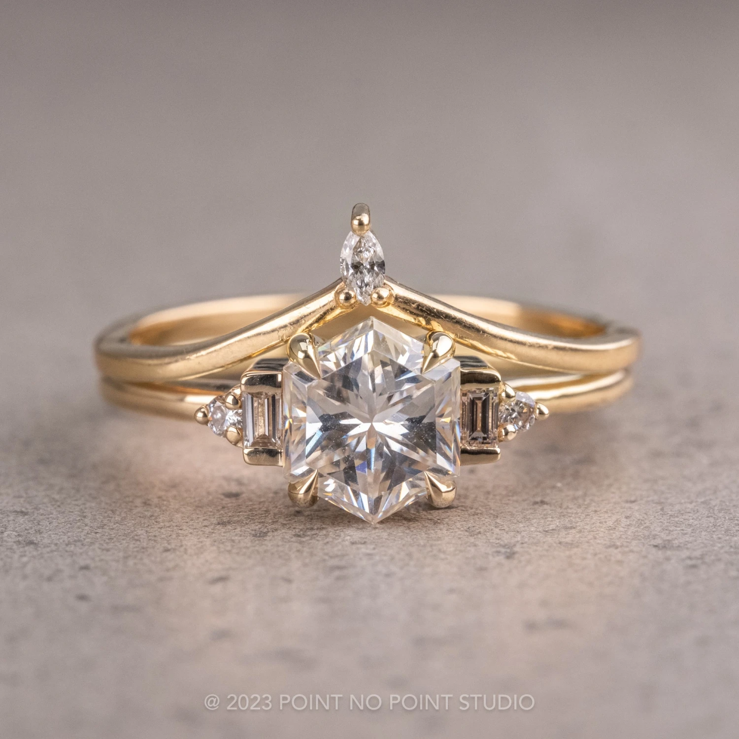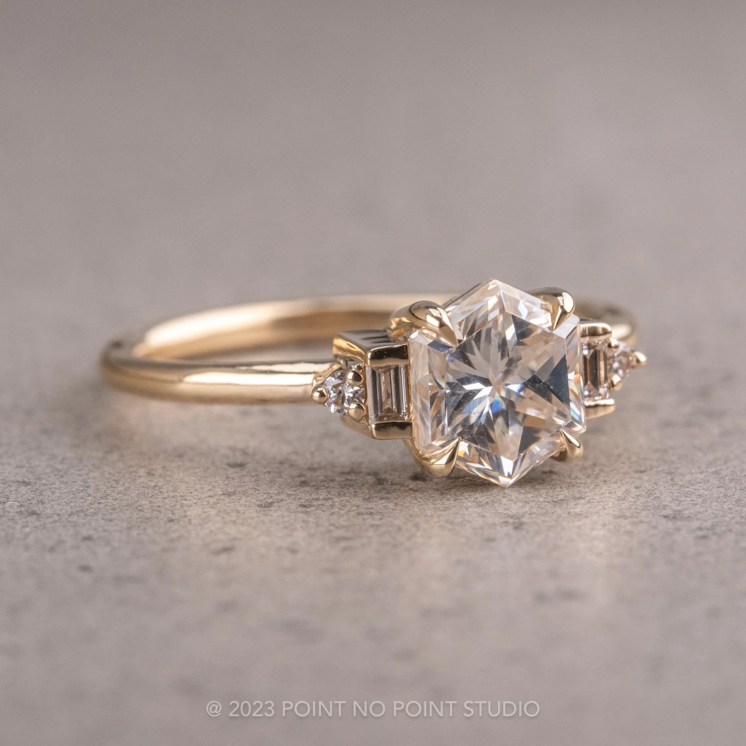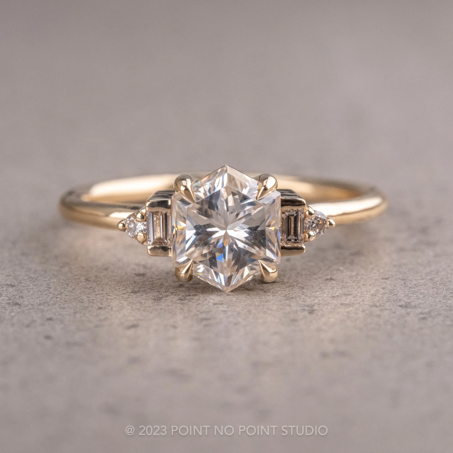 This ring features a stunning 1.46 carat hexagon brilliant cut moissanite. Set on either side of the center stone are GHSI white baguette diamonds, as well as round white diamonds to complete the look.
