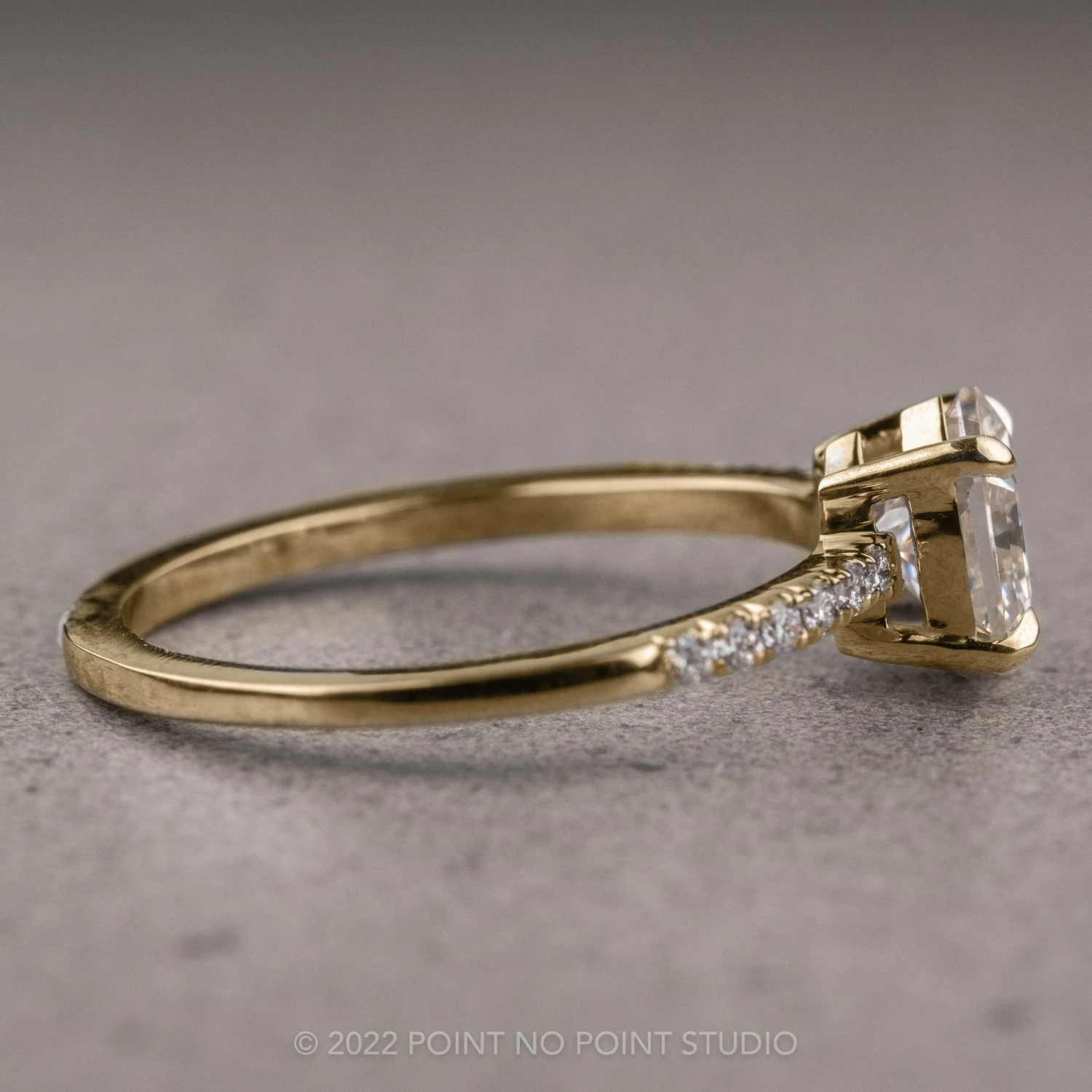 The moissanite is set in a low profile basket prong setting on a 1.7mm ring band. The entire ring is made of recycled yellow gold.