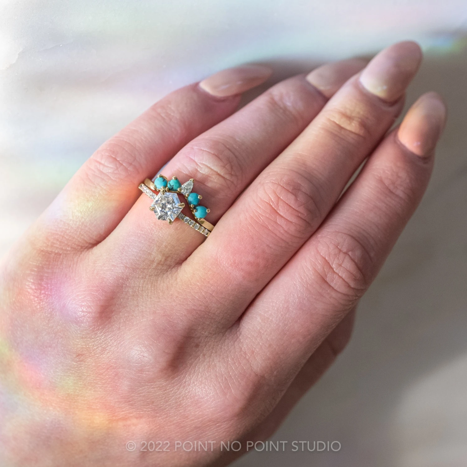 This ring features a beautiful, incredibly sparkly 1.46 carat hexagon moissanite, set in a simple white gold prong setting to show off the unique faceting of the stone. The ring has 6 diamonds set into the band on each side.