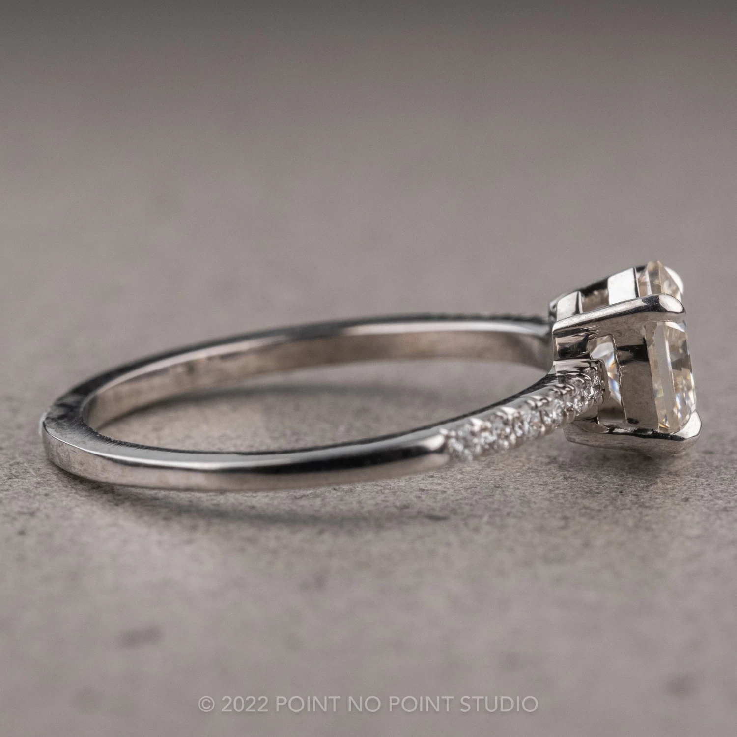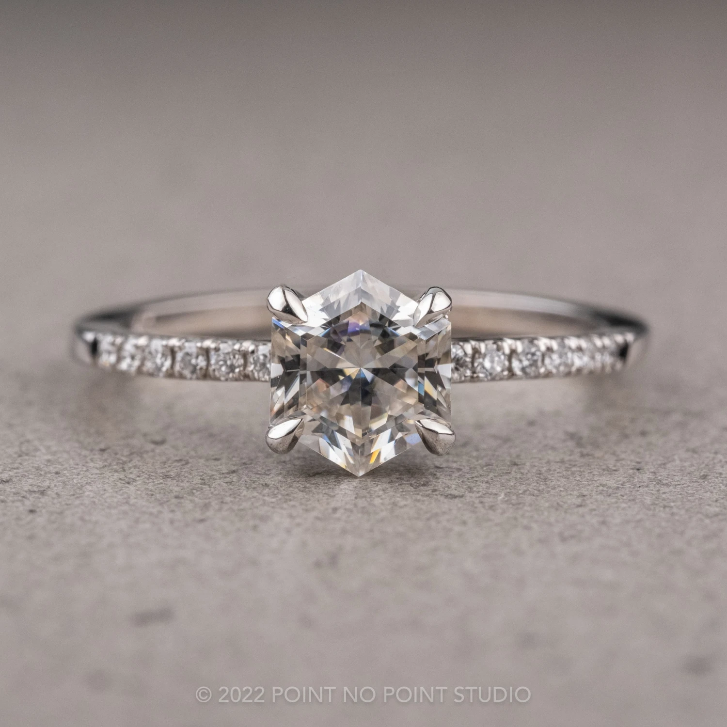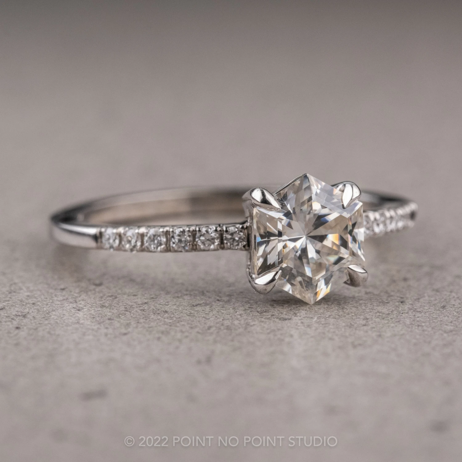 This ring features a beautiful, incredibly sparkly 1.46 carat hexagon moissanite, set in a simple white gold prong setting to show off the unique faceting of the stone. The ring has 6 diamonds set into the band on each side.