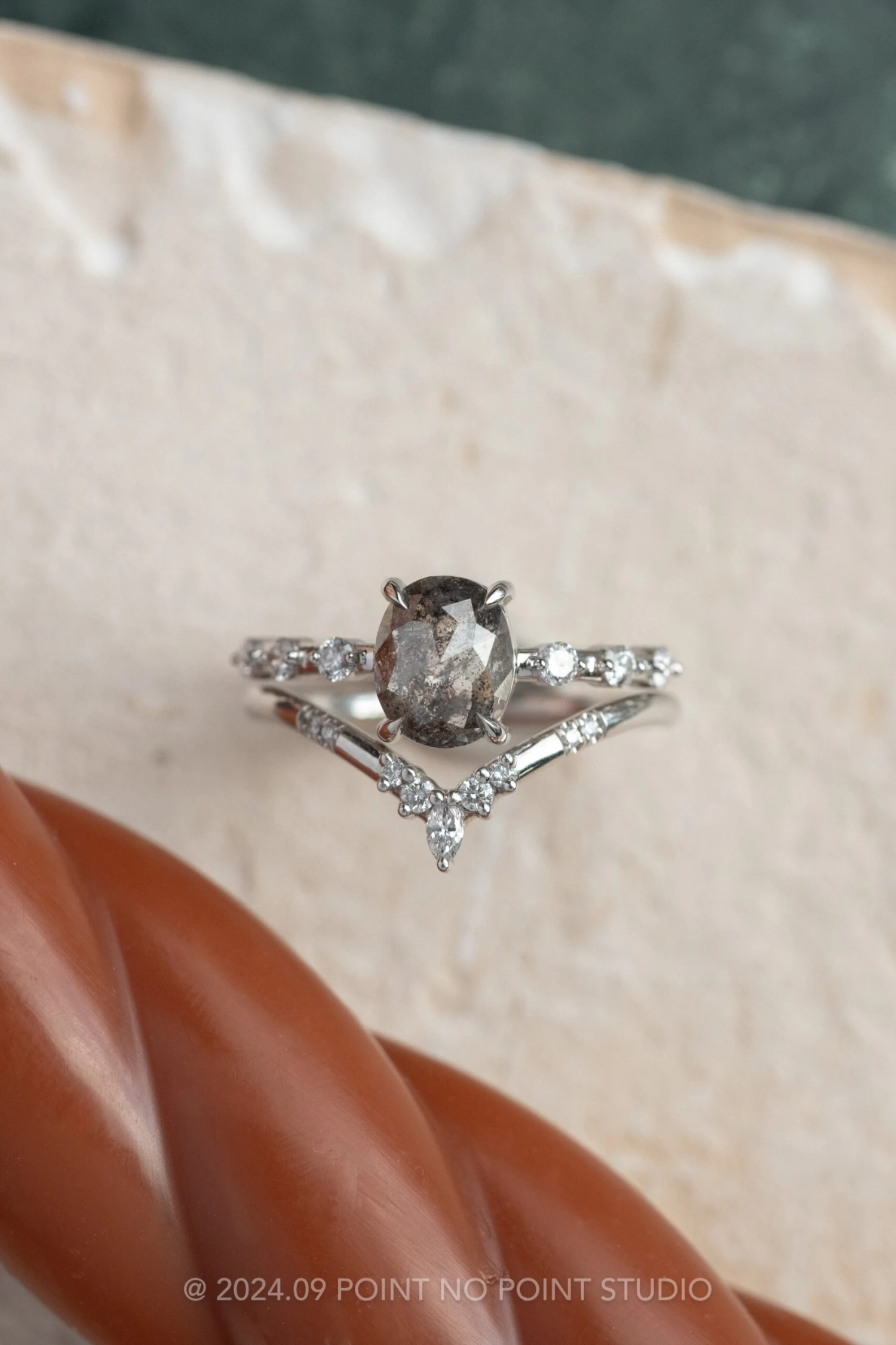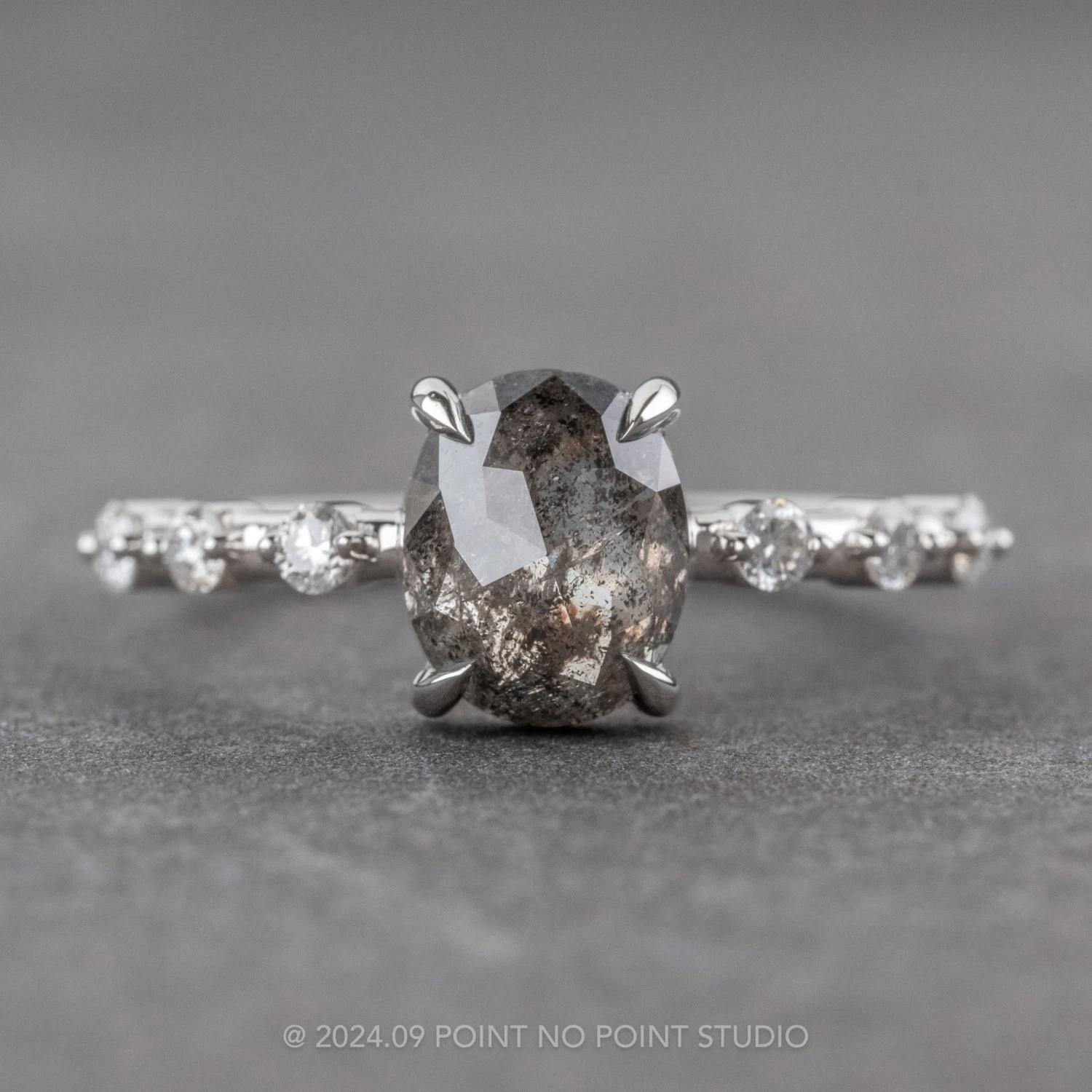 This engagement ring features a mesmerizing and incredibly sparkly 1.40 carat black speckled rose cut oval diamond. The diamond is a top quality natural diamond; it is semi-translucent with unique tones and facets that catch the light. The oval diamond is flanked on either side by sparkly GHSI white accent diamonds in the band for that extra sparkle!