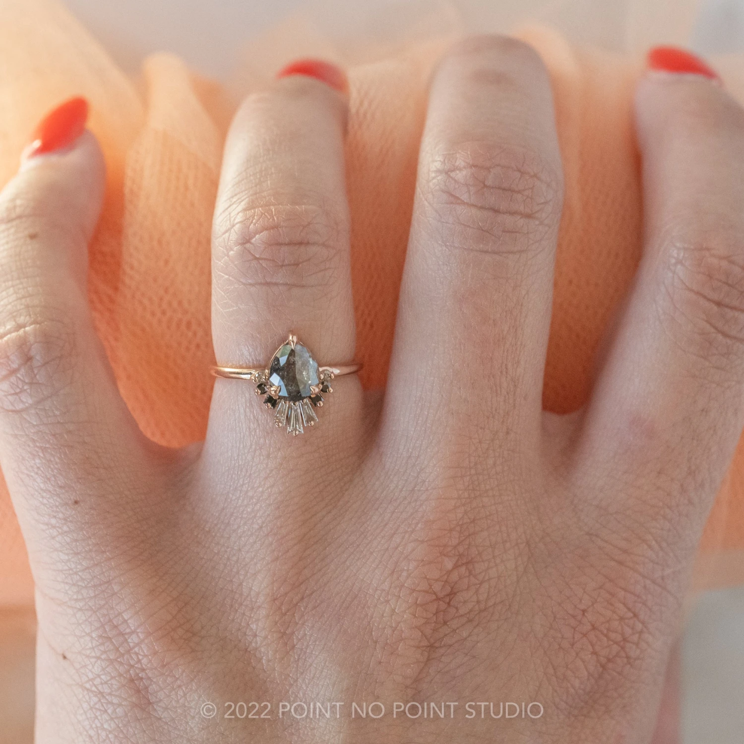 This timeless and unique engagement ring features a striking halo of black, grey, & white diamonds in various shapes. The half halo of diamonds sits nestled below a beautiful 1.38 carat salt and pepper pear rose cut diamond. The diamond is semi-translucent with salt and pepper speckles.
