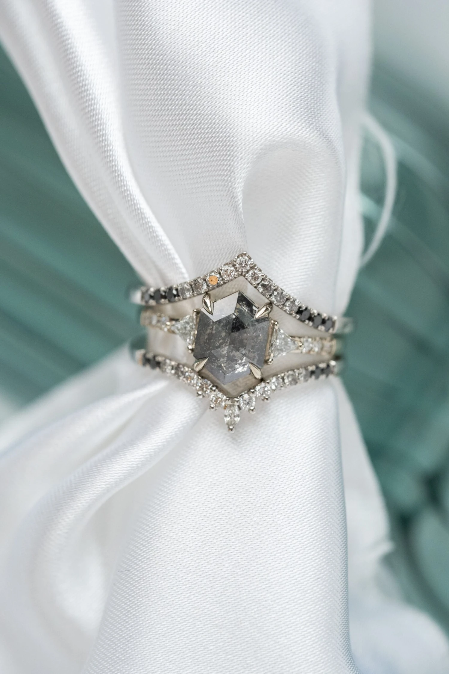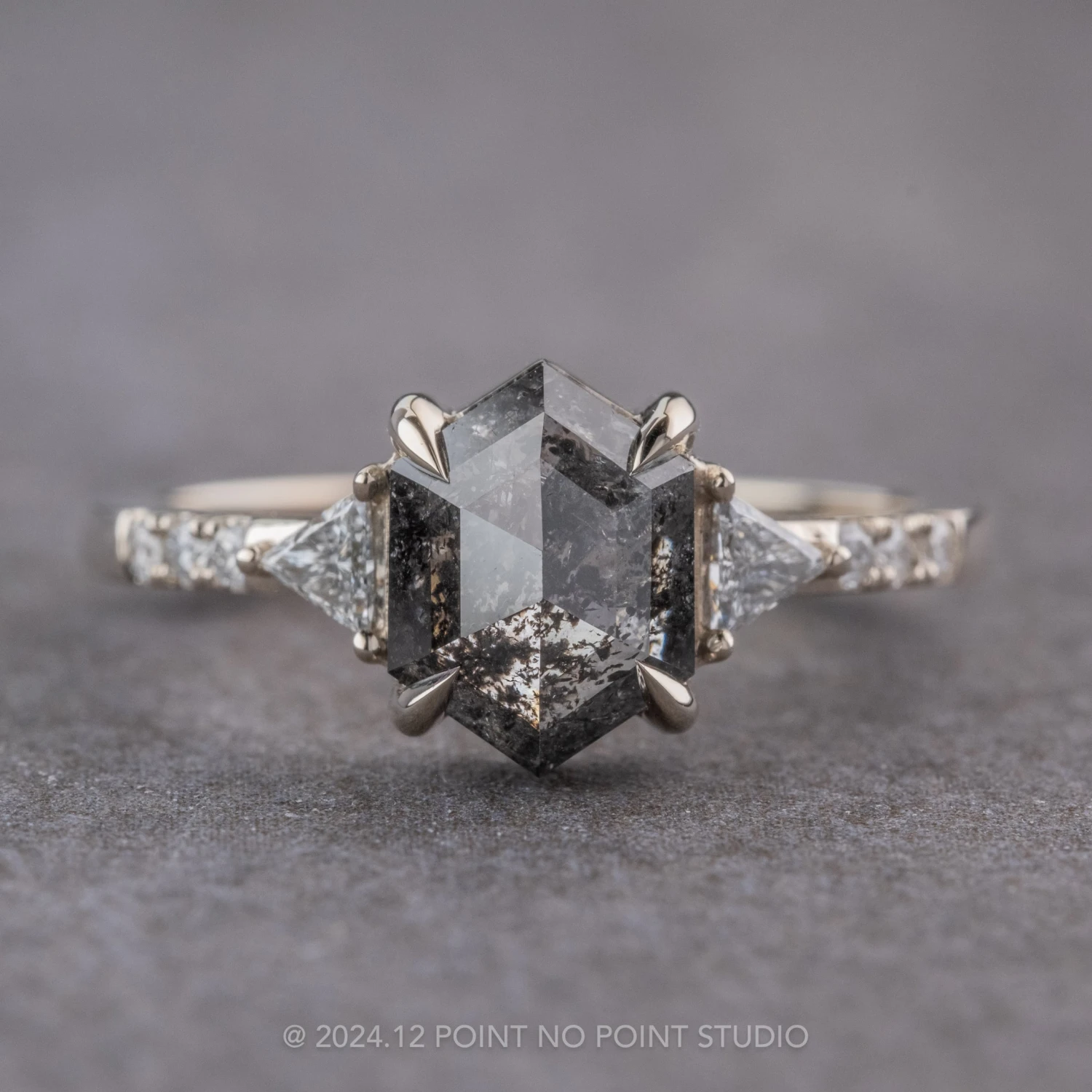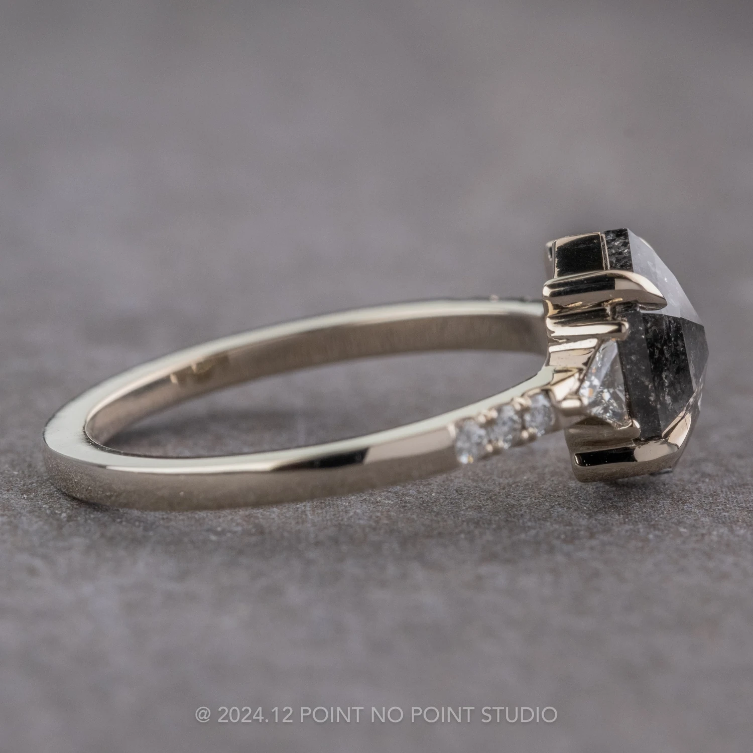 This engagement ring features a mesmerizing 1.50 carat black speckled rose cut hexagon diamond. The diamond is a top quality un-enhanced diamond; it is semi-translucent with unique tones and facets that catch the light. Flanked on either side by GHSI white triangle diamonds, followed by GHSI white round accent diamonds set into the band for that extra sparkle!