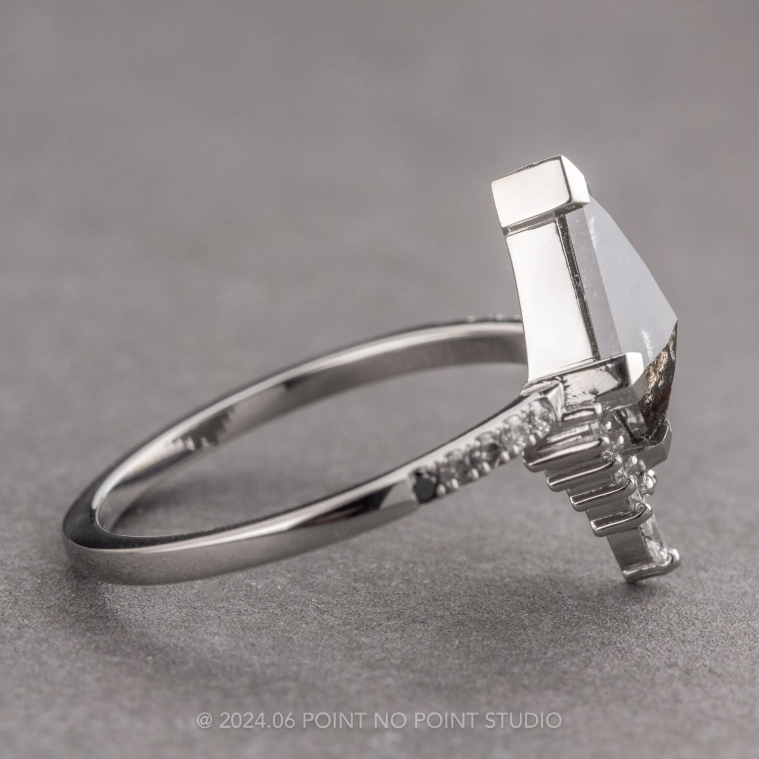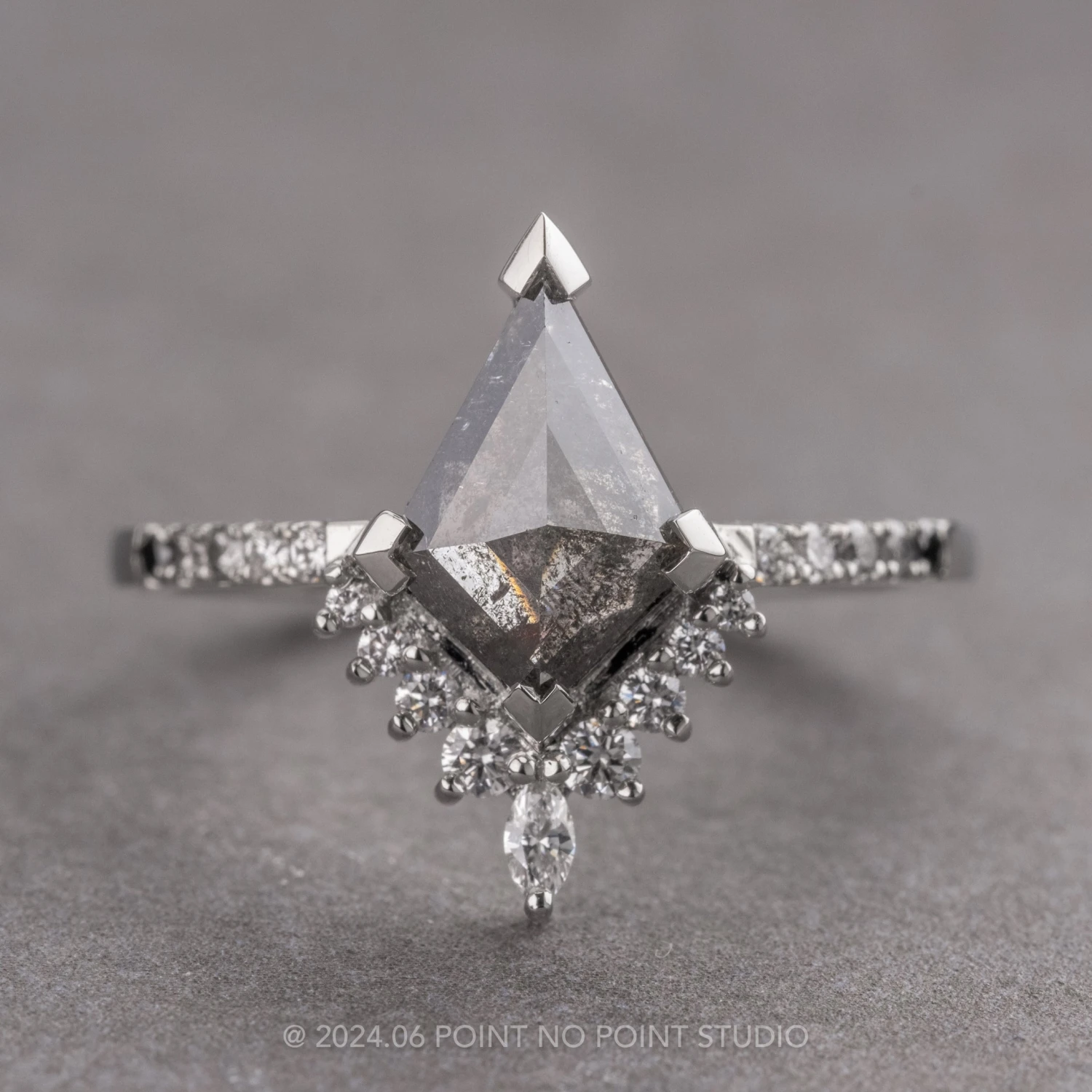 This timeless engagement ring features a striking 1.45 carat black speckled rose cut kite diamond. The diamond is a top quality natural diamond that has not been heated or treated in any way; it is semi-translucent with unique tones and facets that catch the light. The kite sits on top of a half-halo of faceted GHSI white diamonds with the focal point being a sparkly marquise diamond. Each side of the kite diamond has white, grey and black diamonds set into the ring band creating a gradient effect.