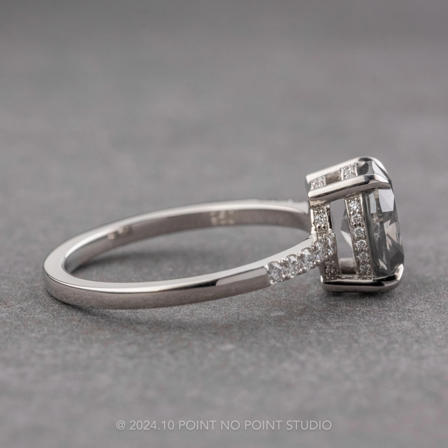 This engagement ring features a gorgeous 1.55 carat fancy grey brilliant cut oval diamond. The diamond is a top quality un-enhanced diamond; it is semi-translucent with unique tones and facets that catch the light. This setting has diamonds micro paved around the center diamond giving the ring an extra hidden sparkle! Down each side of the band are GHSI white brilliant cut diamonds to complete the look.