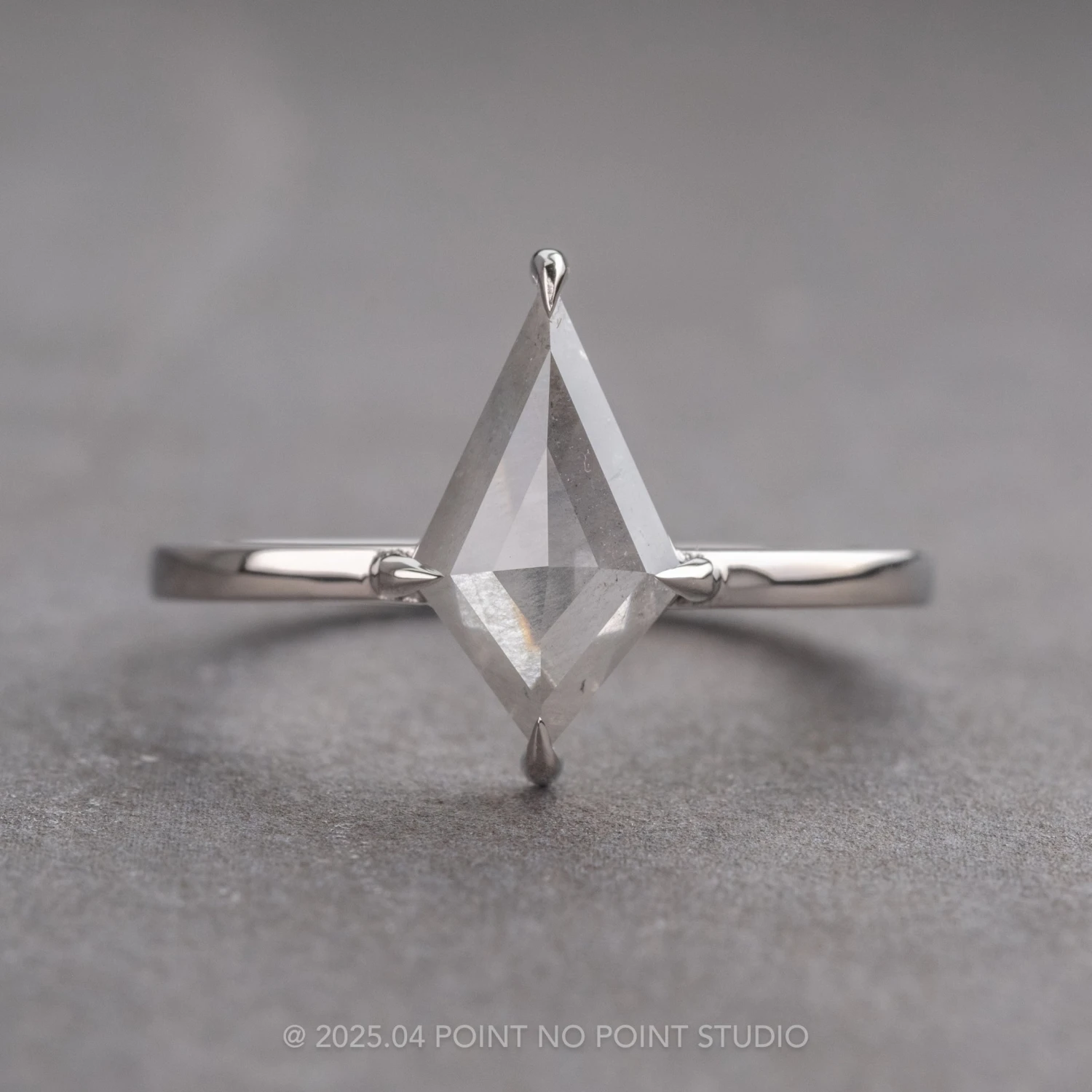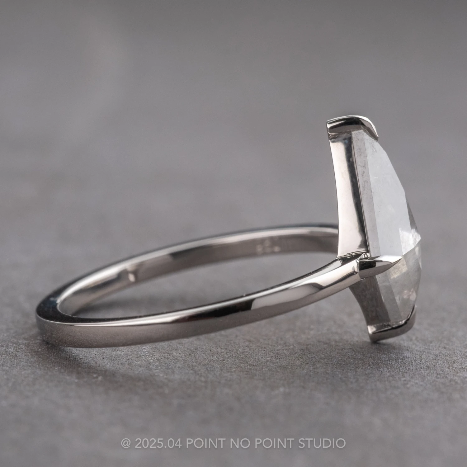 This engagement ring features a beautiful 1.72 carat icy grey kite shaped diamond. The diamond is a top quality natural diamond that has not been heated or treated in any way; it is semi-translucent with unique inner tones and facets that catch the light.