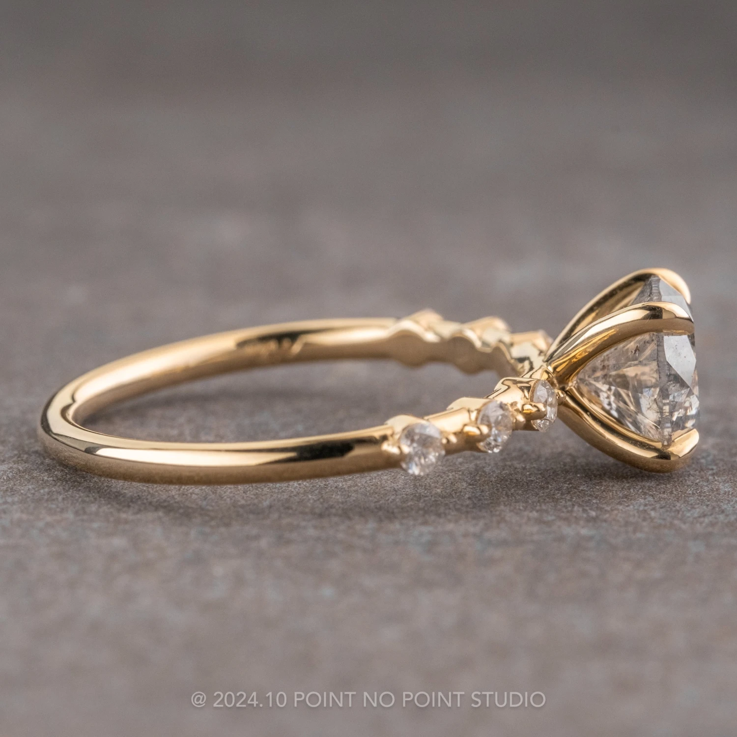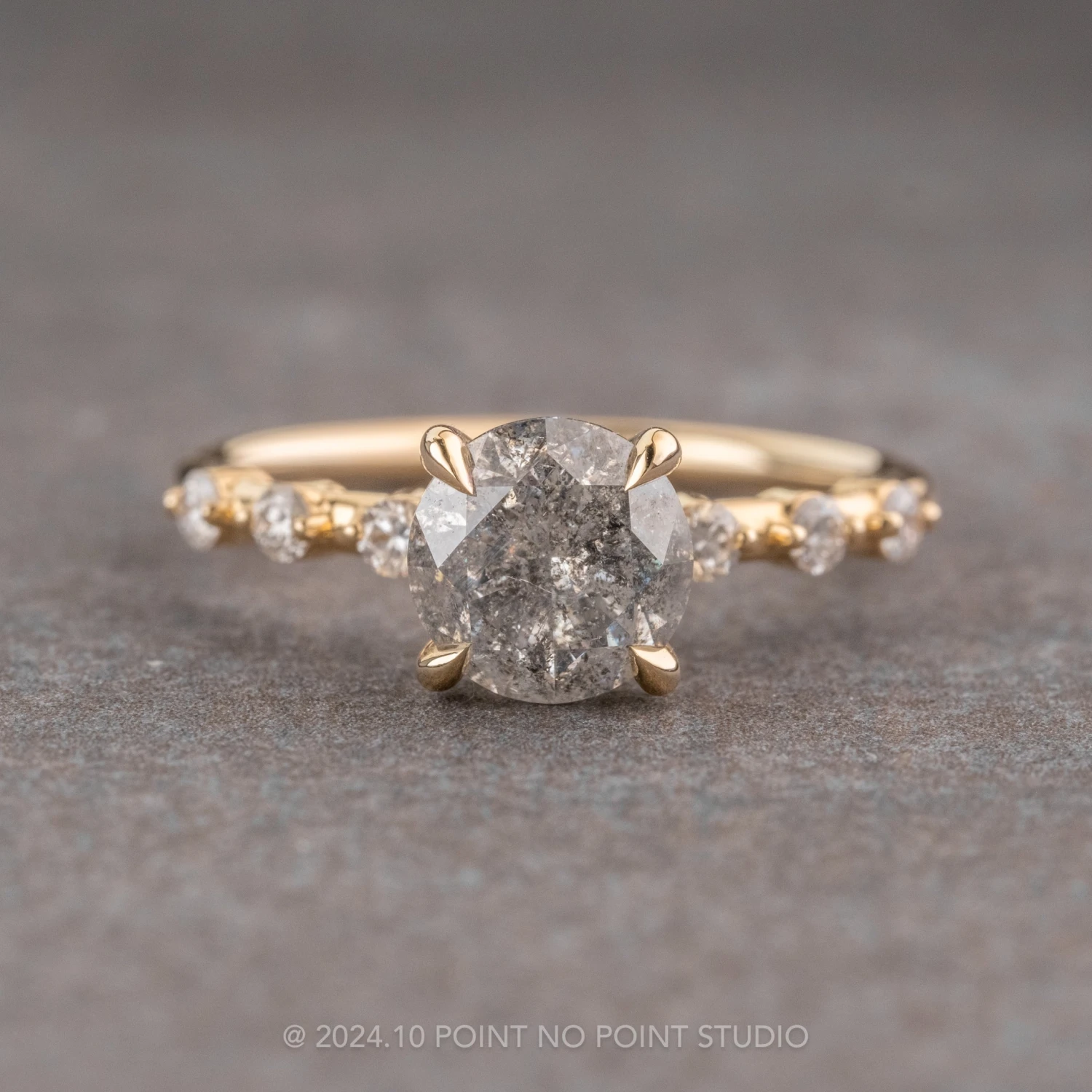 This engagement ring features a mesmerizing and incredibly sparkly 1.62 carat salt and pepper round brilliant cut diamond. The diamond is a top quality natural diamond; it is semi-translucent with unique tones and facets that catch the light. The diamond is flanked on either side by sparkly GHSI white accent diamonds in the band for that extra sparkle!