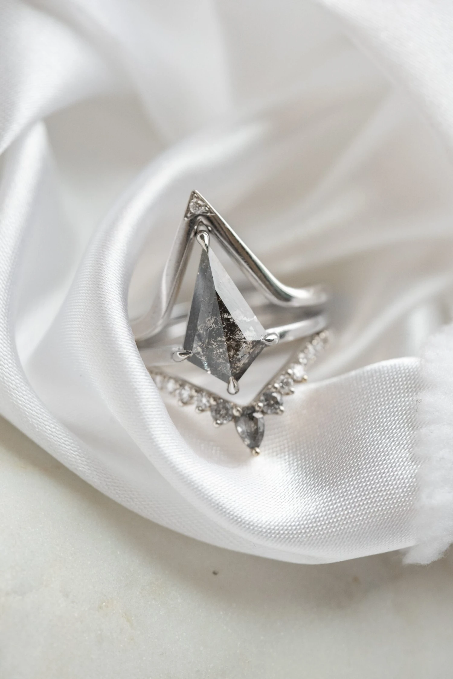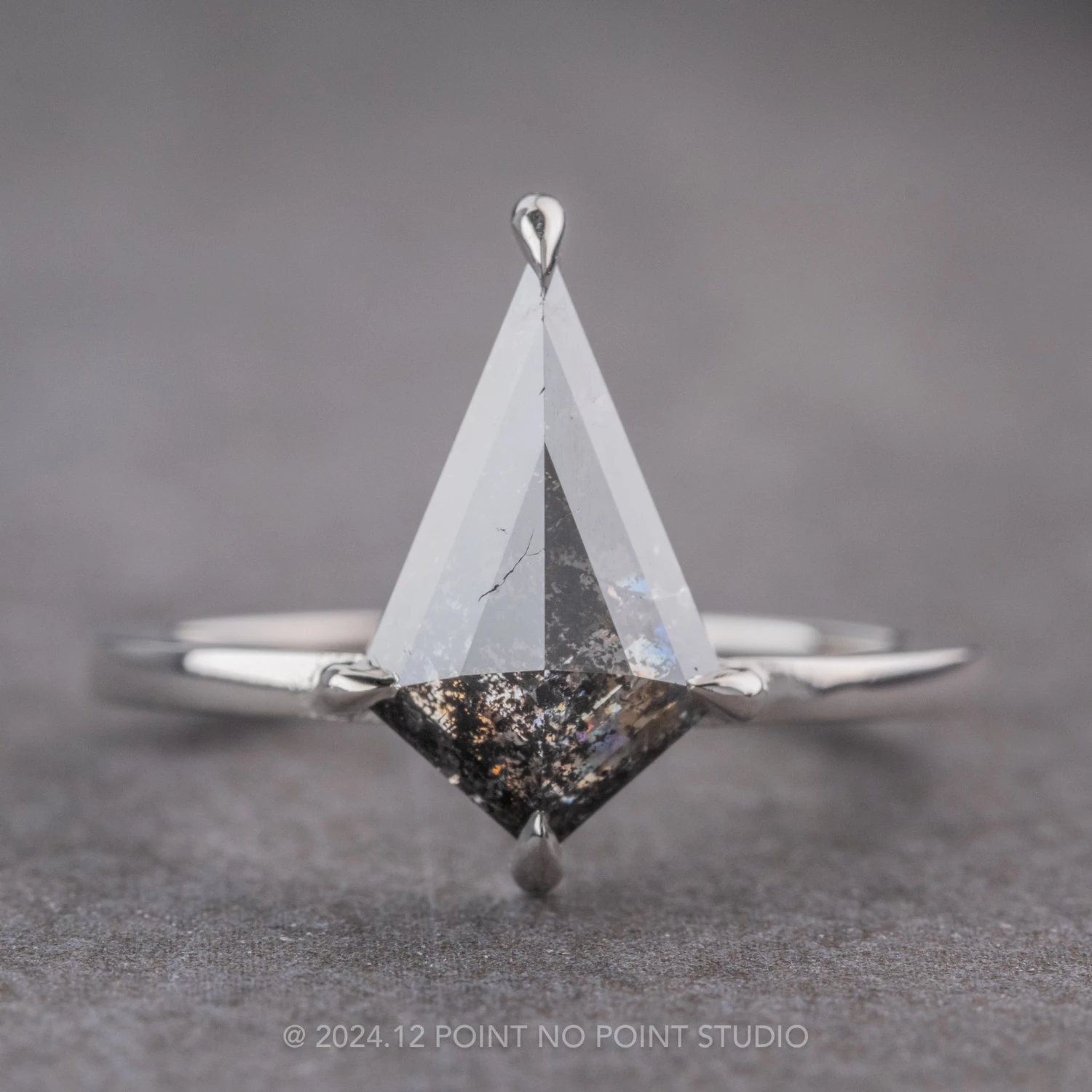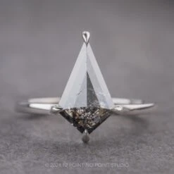 This ring features a striking 1.81 carat black speckled rose cut kite diamond. The semi-translucent diamond is a top quality, un-enhanced natural diamond. The kite sits in an open back setting that allows light to shine through so you can admire the beautiful inclusions in the stone.