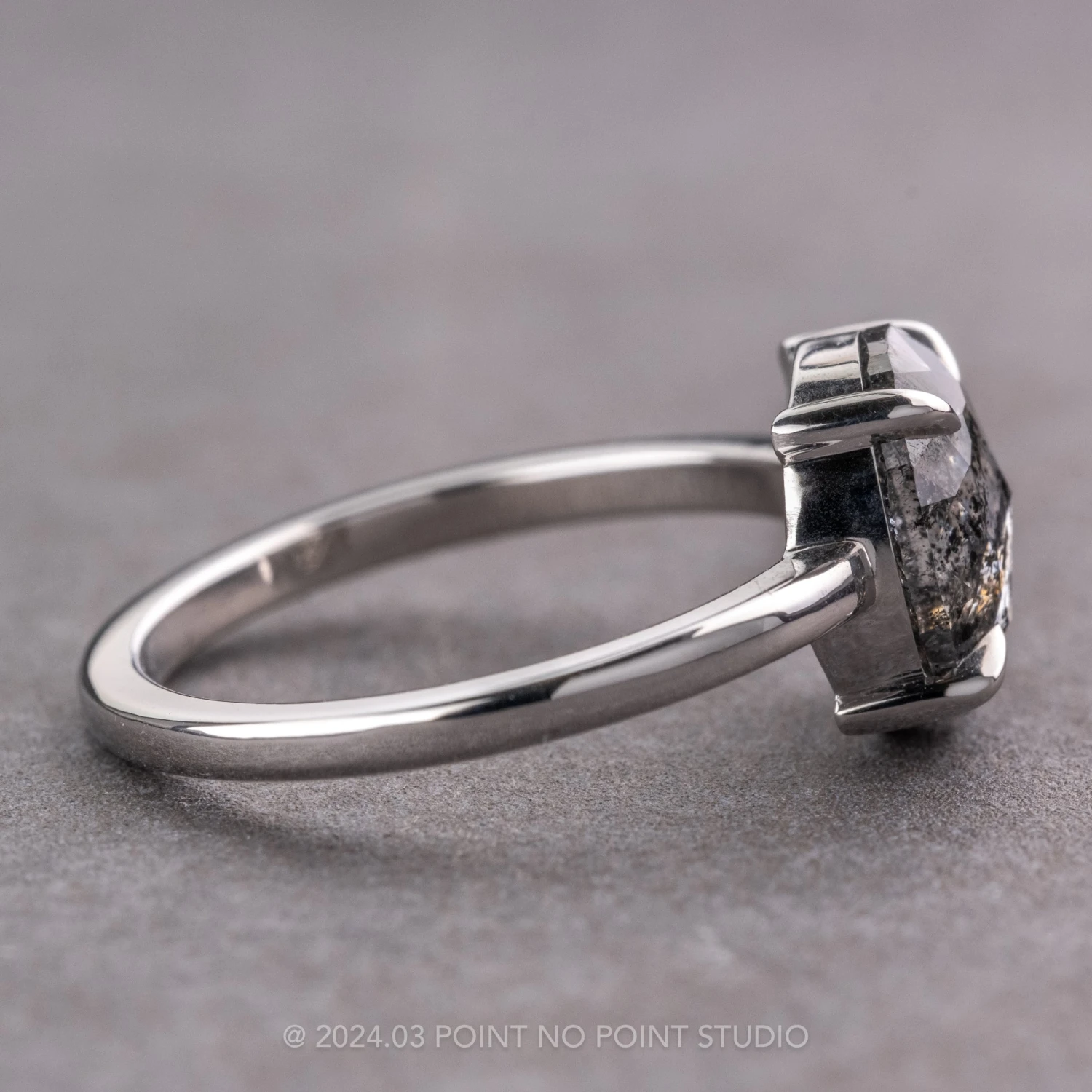 The ring features a beautiful 1.86 carat black speckled rose cut oval shaped diamond. The diamond is a top quality all-natural diamond that is not heat treated or enhanced. The backplate of the diamond has a window cut-out that allows light to illuminate through beautifully.