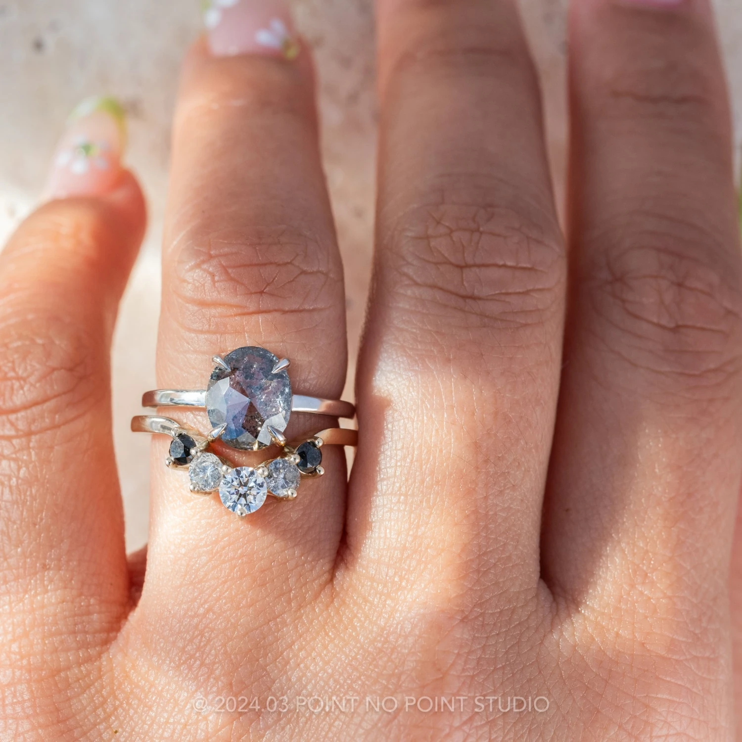 Shown pictured with our Large Ombre Catherine and Salt and Pepper Cassiopeia wedding bands, sold separately here.