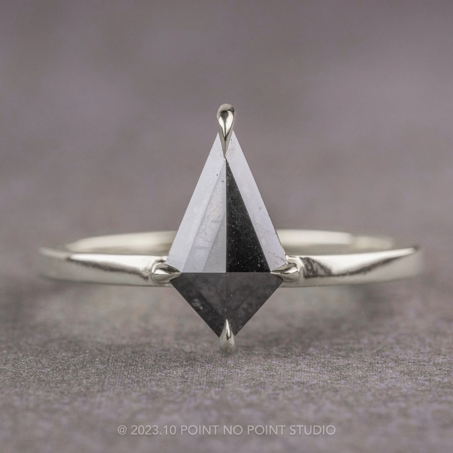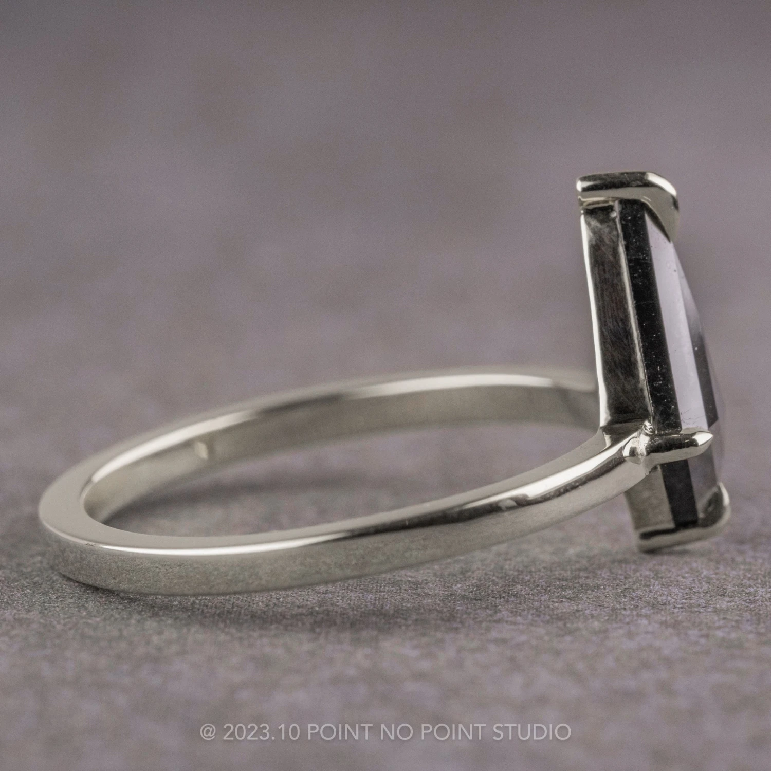 The ring features a beautiful 1.89 carat black rose cut kite diamond. The diamond is a top quality natural diamond, and has been set in a very low profile 4 prong setting. The diamond is set in an open back setting which allows you to see and admire the unique structure, tones, and facets of the diamond.