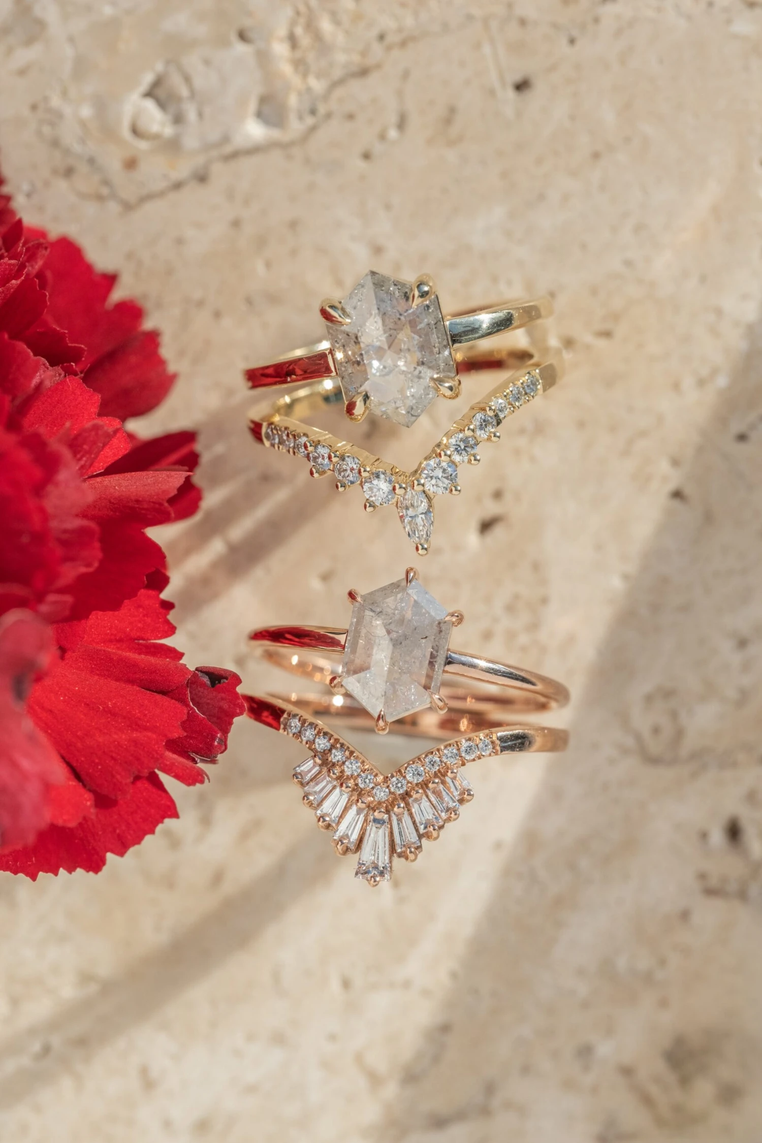 Shown pictured with our Vintage Diamond Vivian, Icy Flora and Margot wedding bands, sold separately here.
