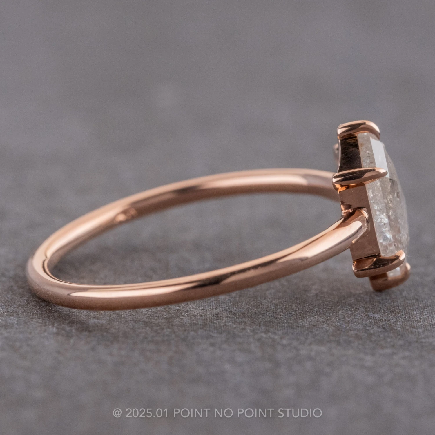 The rose cut diamond is set into a low profile, open back, 6 prong setting which allows you to see and admire the unique inner structure, tones, and marbling of the diamond. The entire ring is made of recycled 14k rose gold with a round ring band measuring 1.7mm wide.