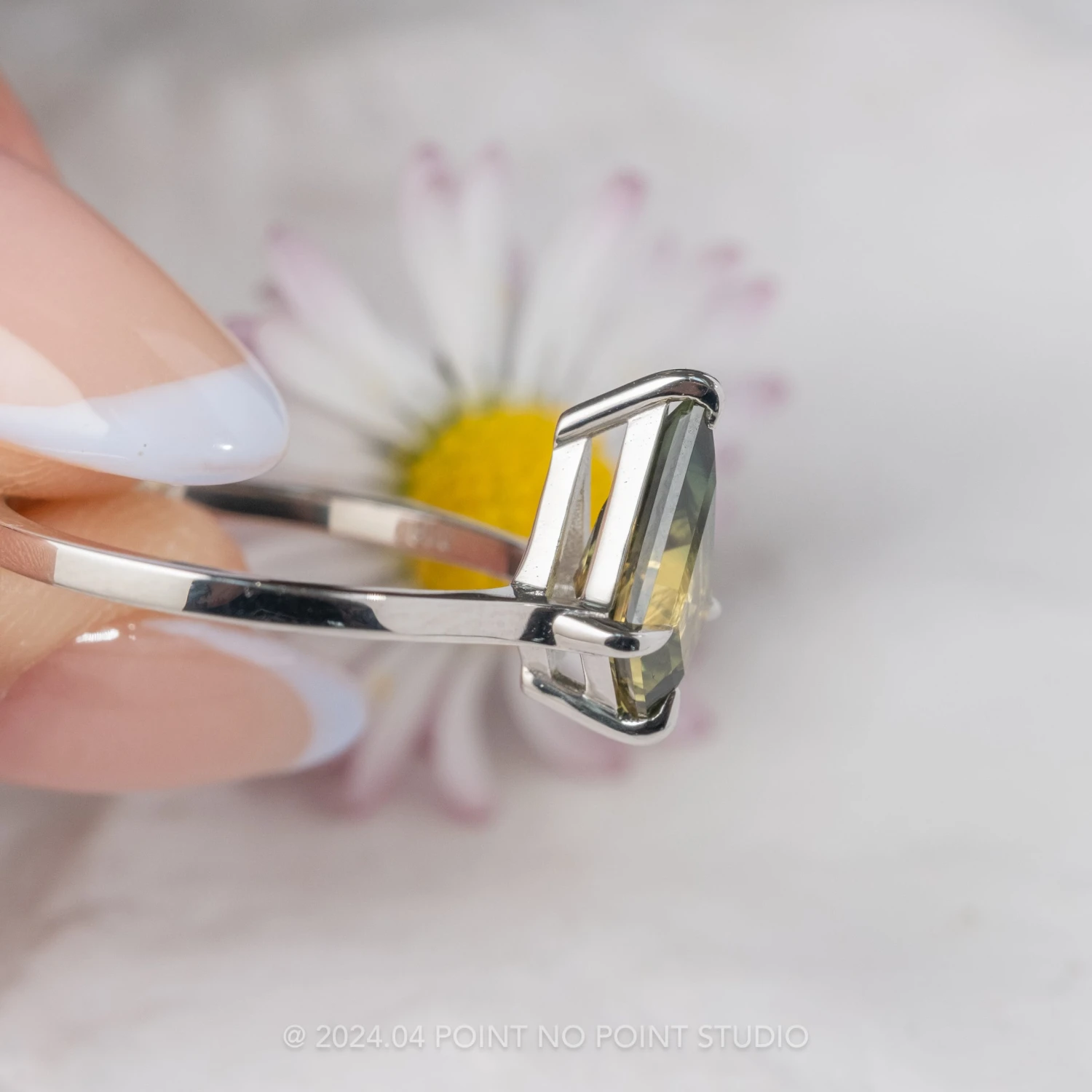 The ring features a gorgeous 1.95 carat brilliant cut parti kite sapphire that ranges in tone from yellow to teal. The Australian sapphire is a natural stone that has not been treated or heated in any way. The entire ring is made of eco-friendly recycled platinum. The band is 1.7mm wide and is very comfortable to wear. The stone sits in a slightly elevated basket and is secured by 4 prongs.