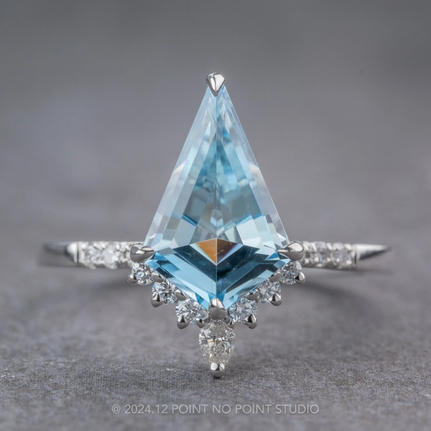 This timeless engagement ring features a 1.76 carat step cut kite shaped aquamarine. The aquamarine is a top quality natural stone that sits within a half-halo of GHSI faceted white diamonds with the focal point being a stunning pear shaped diamond. Set into the band are three GHSI white round accent diamonds for that extra sparkle!