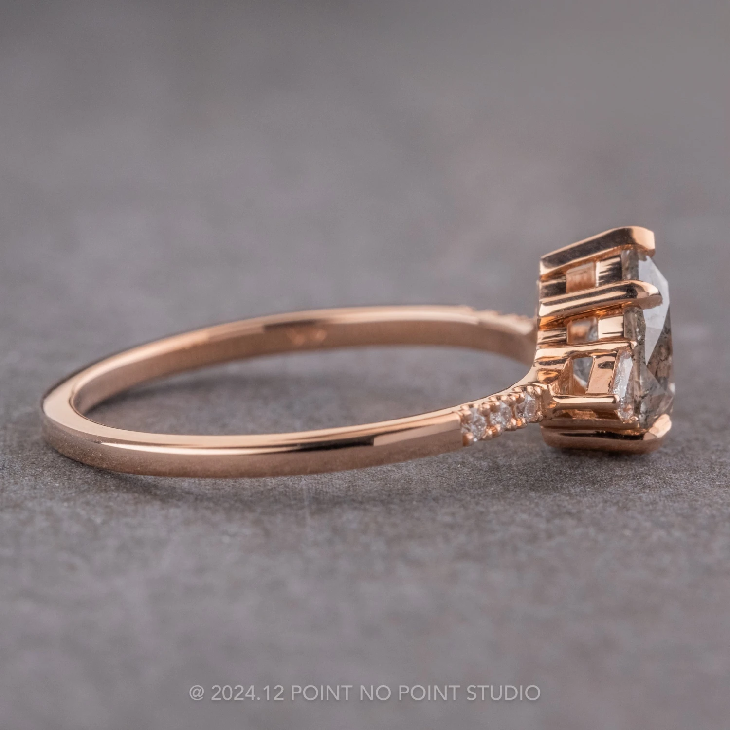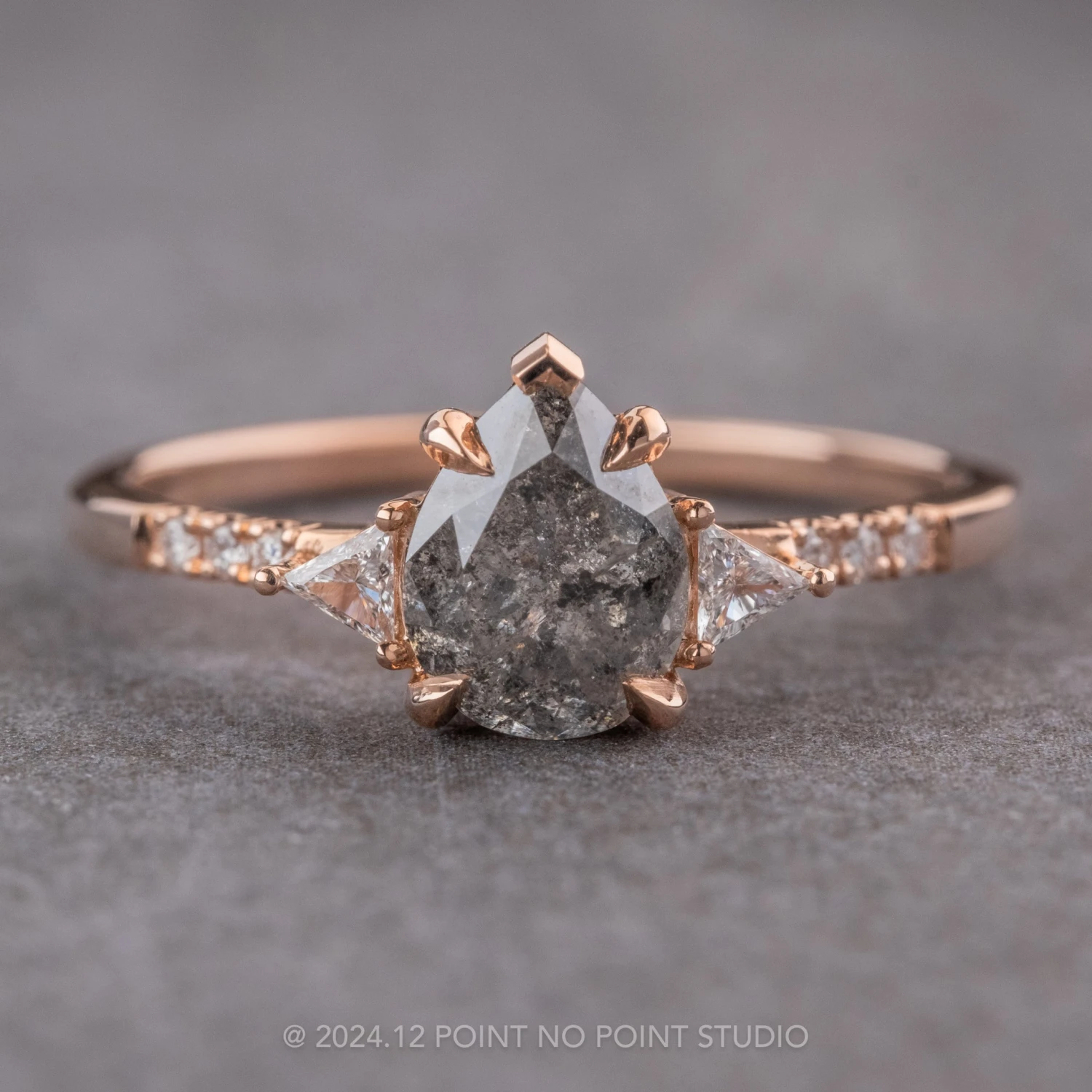 This engagement ring features a mesmerizing and incredibly sparkly 1.90 carat salt and pepper pear shaped brilliant cut diamond. The pear diamond is a top quality natural diamond; it is semi-translucent with unique tones and facets that catch the light. Flanked on both sides by a GHSI white triangle brilliant cut accent diamond, followed by three smaller GHSI white round brilliant cut diamonds set into the ring band to complete the look!