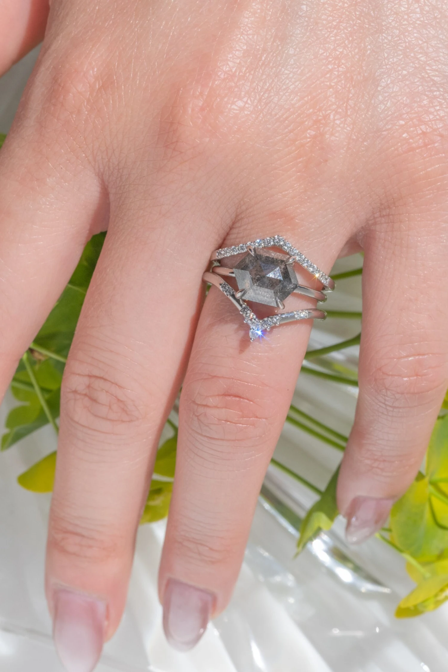 This engagement ring features a stunning 2.10 carat hexagon shaped rose cut diamond. The diamond is a top quality all-natural diamond that is not heat treated or enhanced in anyway – it it naturally semi-translucent with unique inner black speckling.