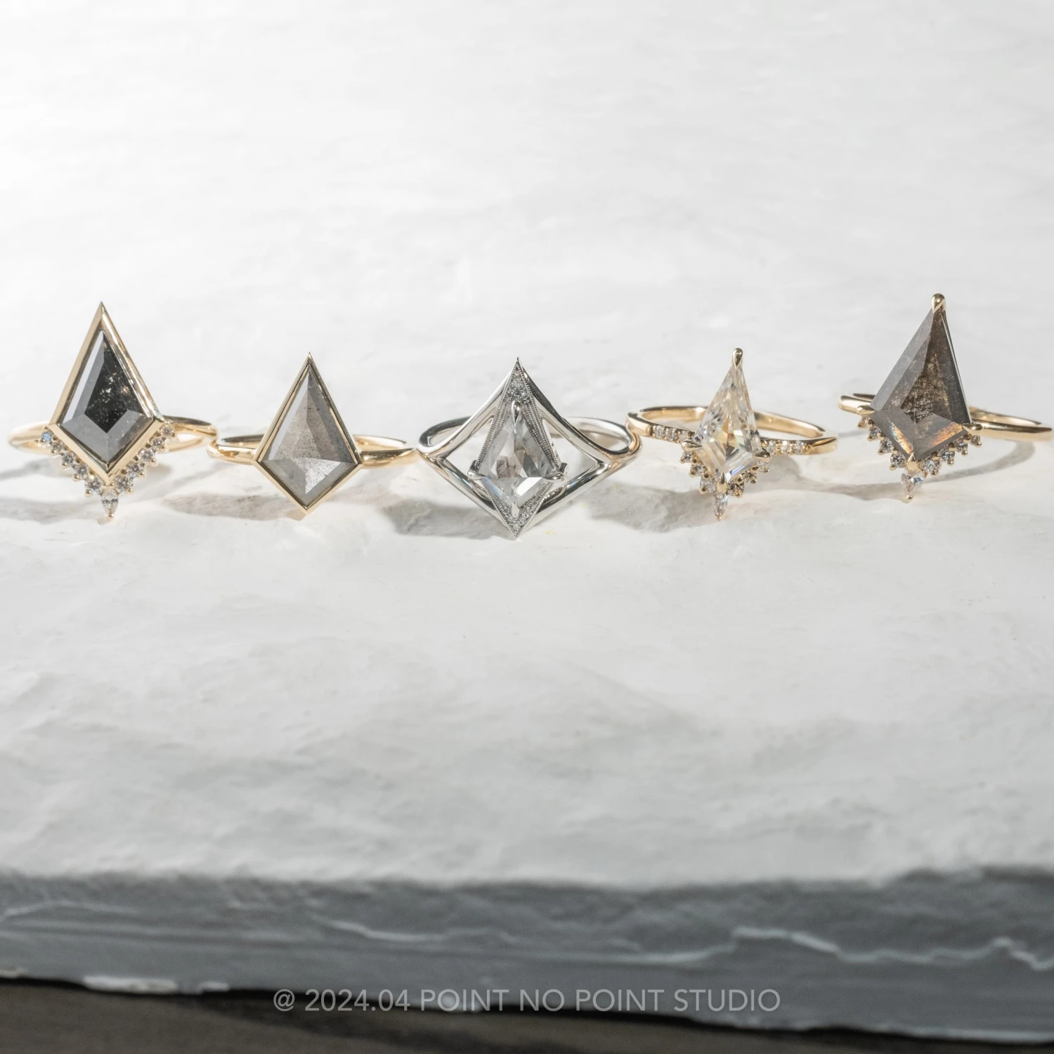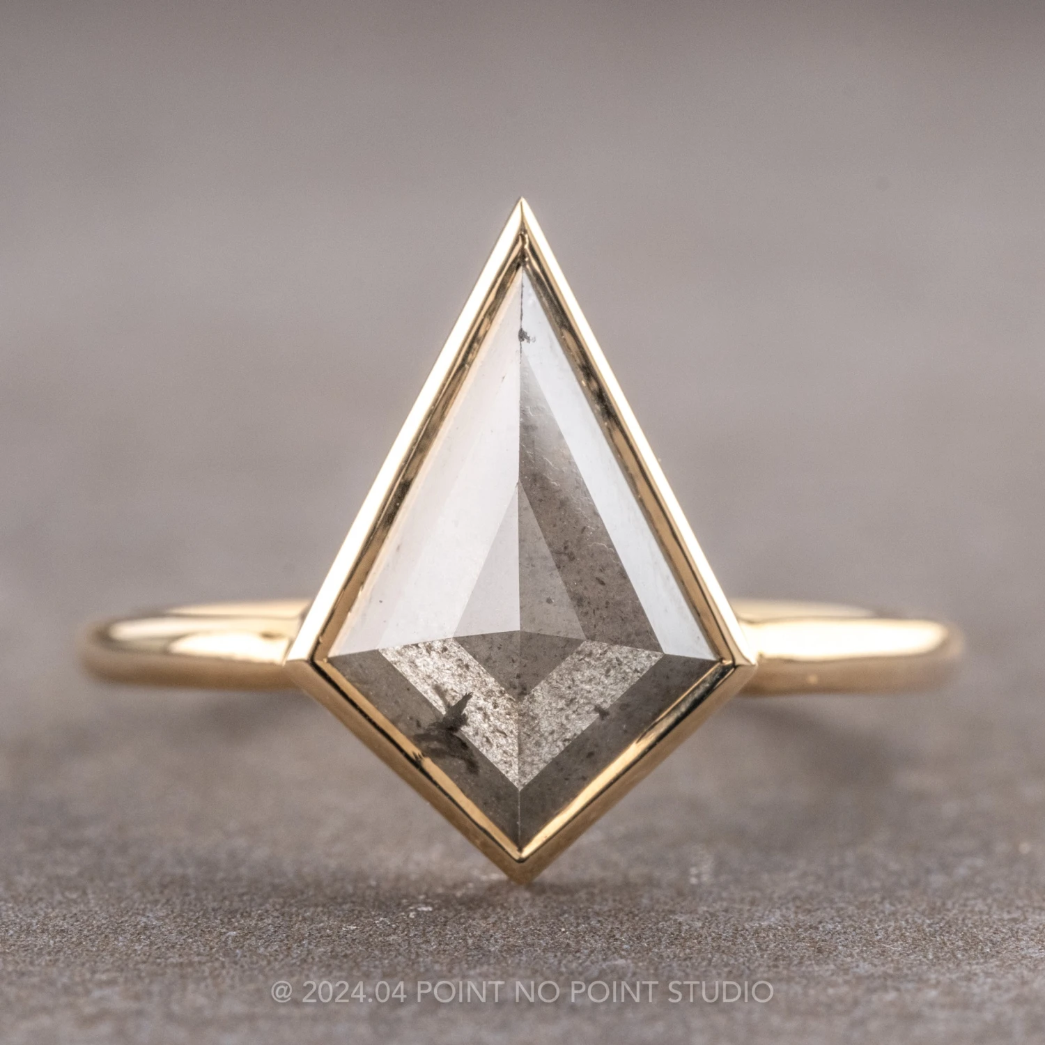 This ring features a striking 2.23 carat salt and pepper rose cut kite diamond. This diamond sits in a bezel setting with an open back that allows light to shine through so you can admire the beautiful inclusions in the stone.