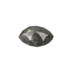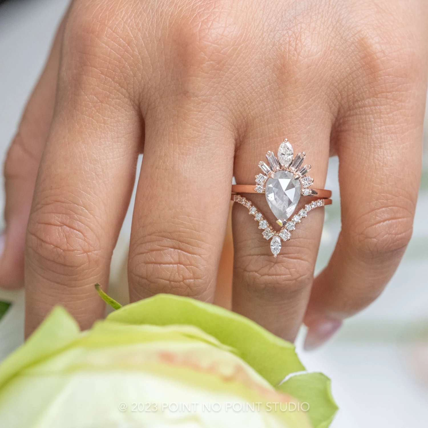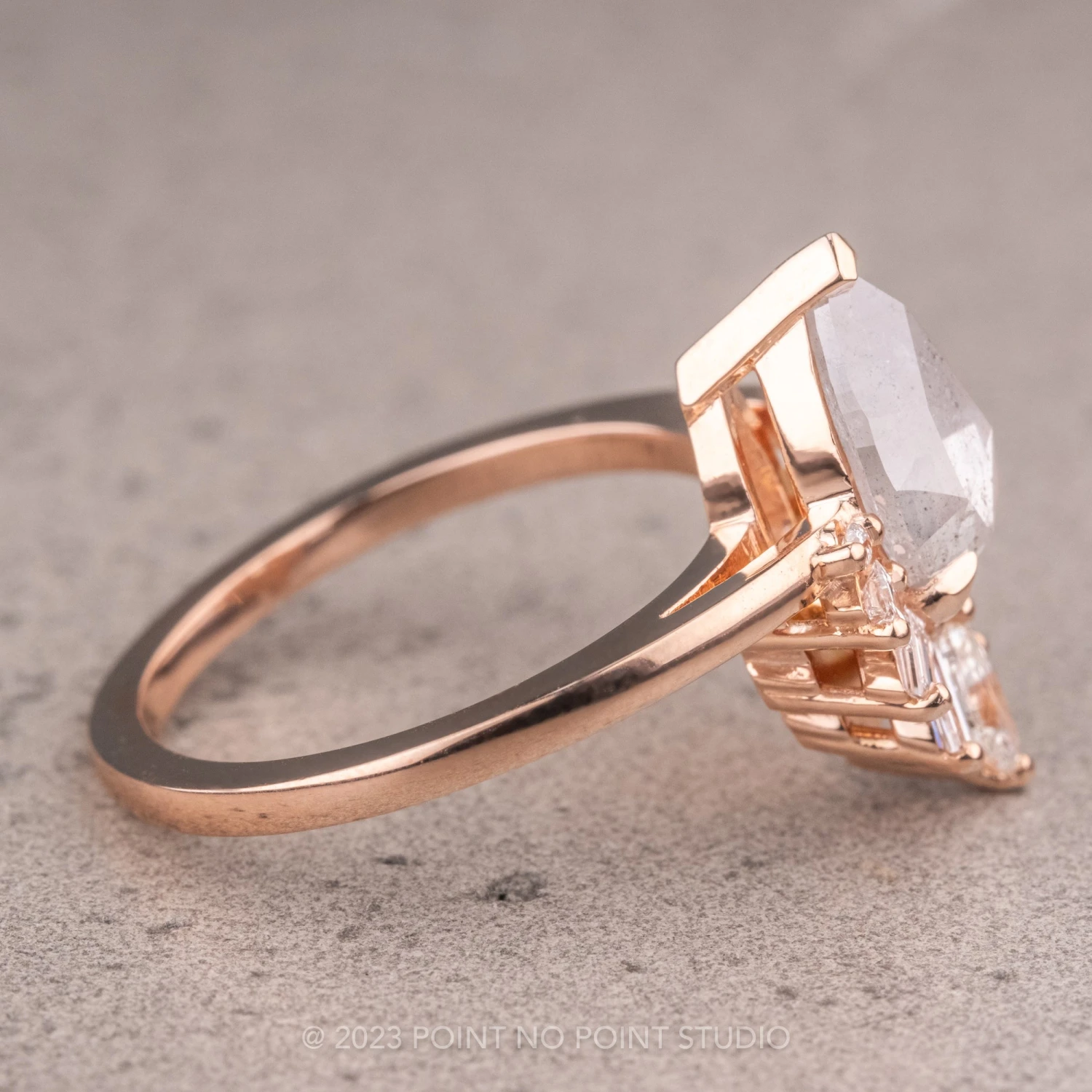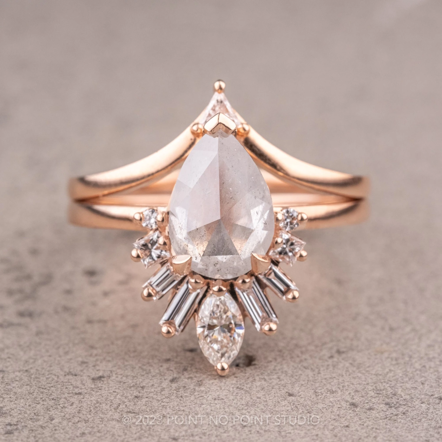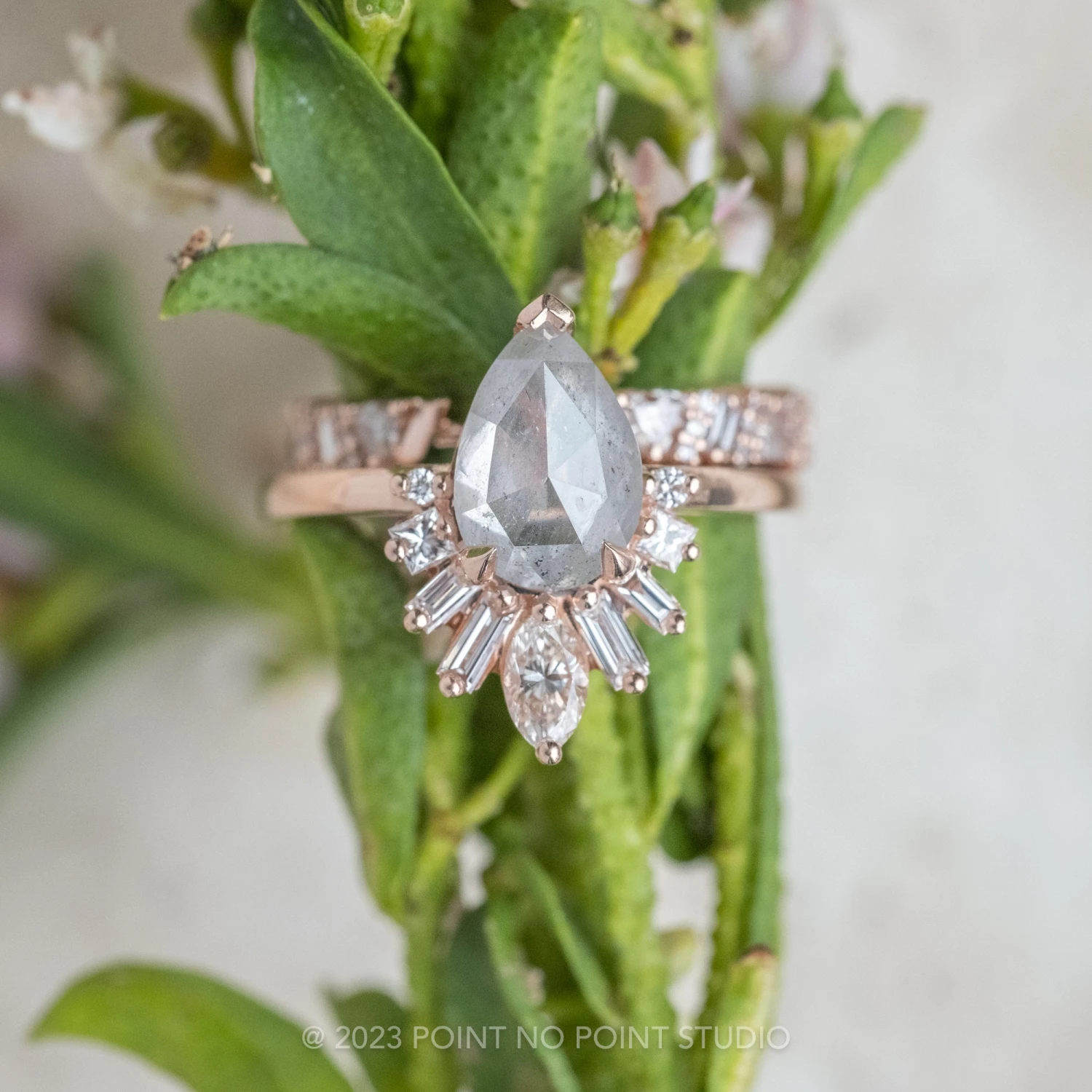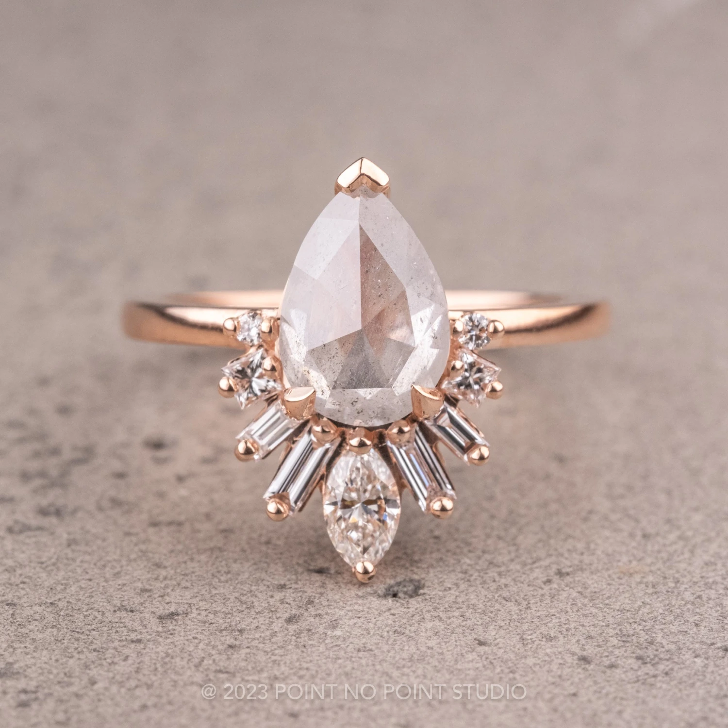 This timeless and unique engagement ring features a striking halo of sparkly GHSI white diamonds in various shapes. The half halo of diamonds sits nestled below a stunning 1.90 carat icy grey salt and pepper rose cut pear shaped diamond. The diamond is a top quality un-enhanced diamond; it is semi-translucent with unique speckling and facets that catch the light.