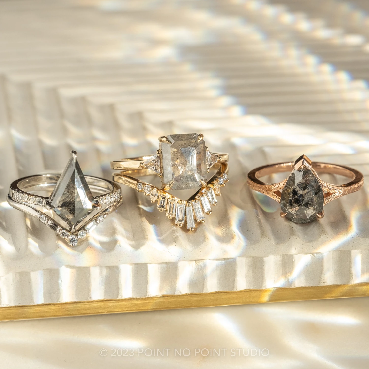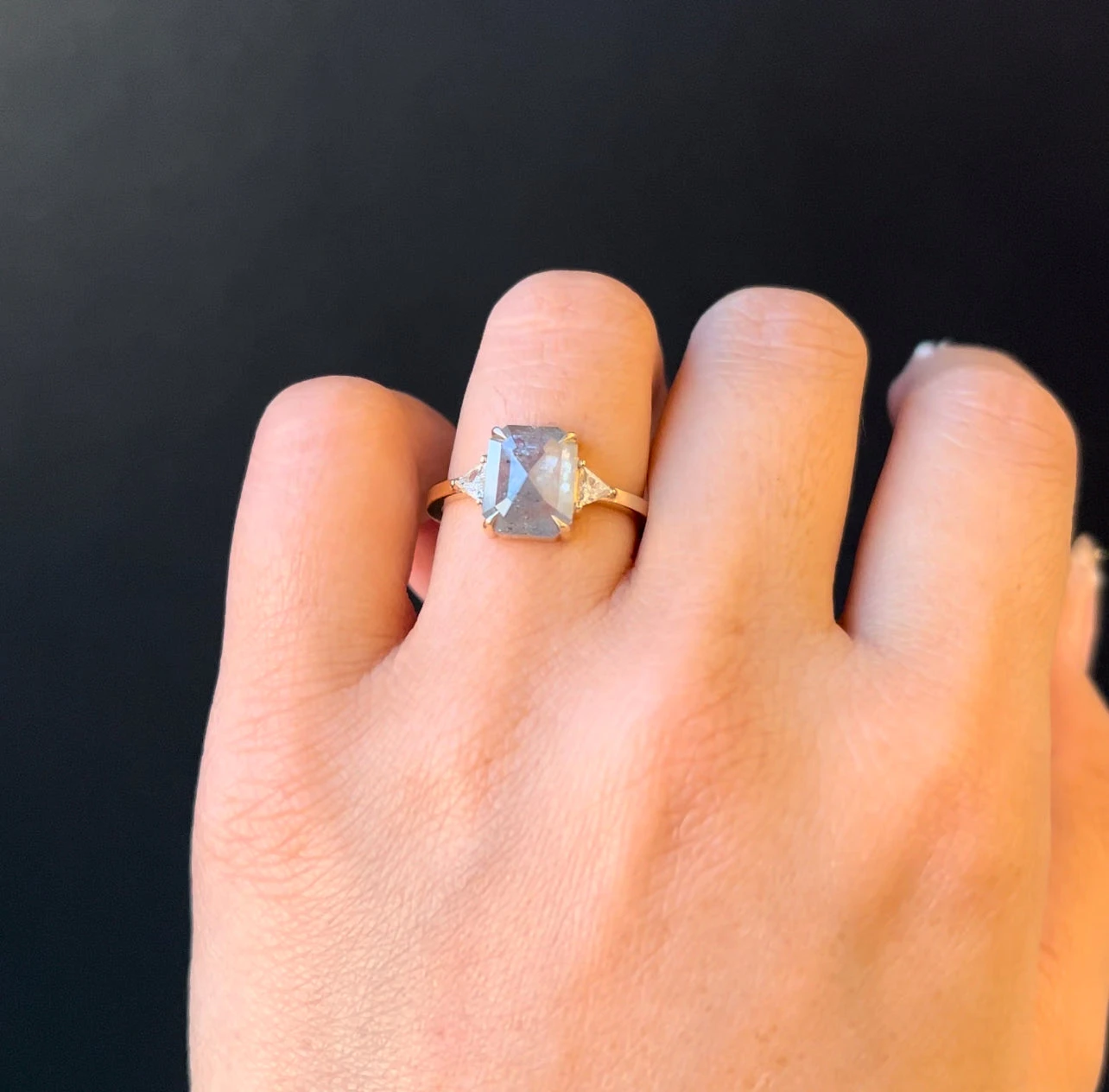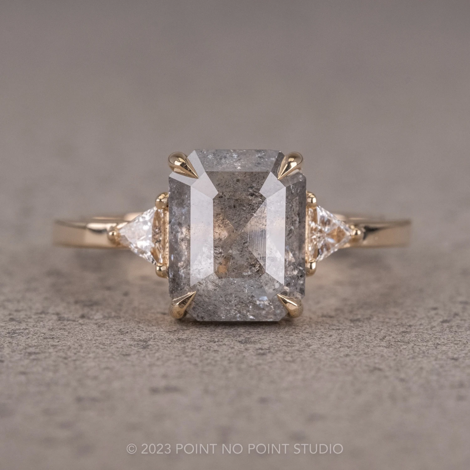 This ring features a beautiful salt and pepper emerald rose cut diamond. The diamond is a top quality, un-enhanced, semi translucent natural grey speckled diamond; set on either side of the center stone are white brilliant cut triangle accent diamonds. The diamond is set into an open back setting which allows you to see and admire the unique inner structure, tones, and marbling of the diamond.