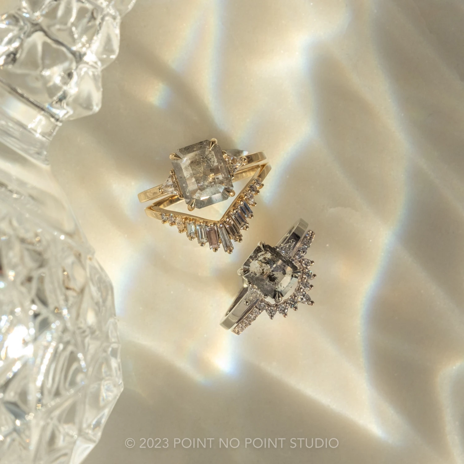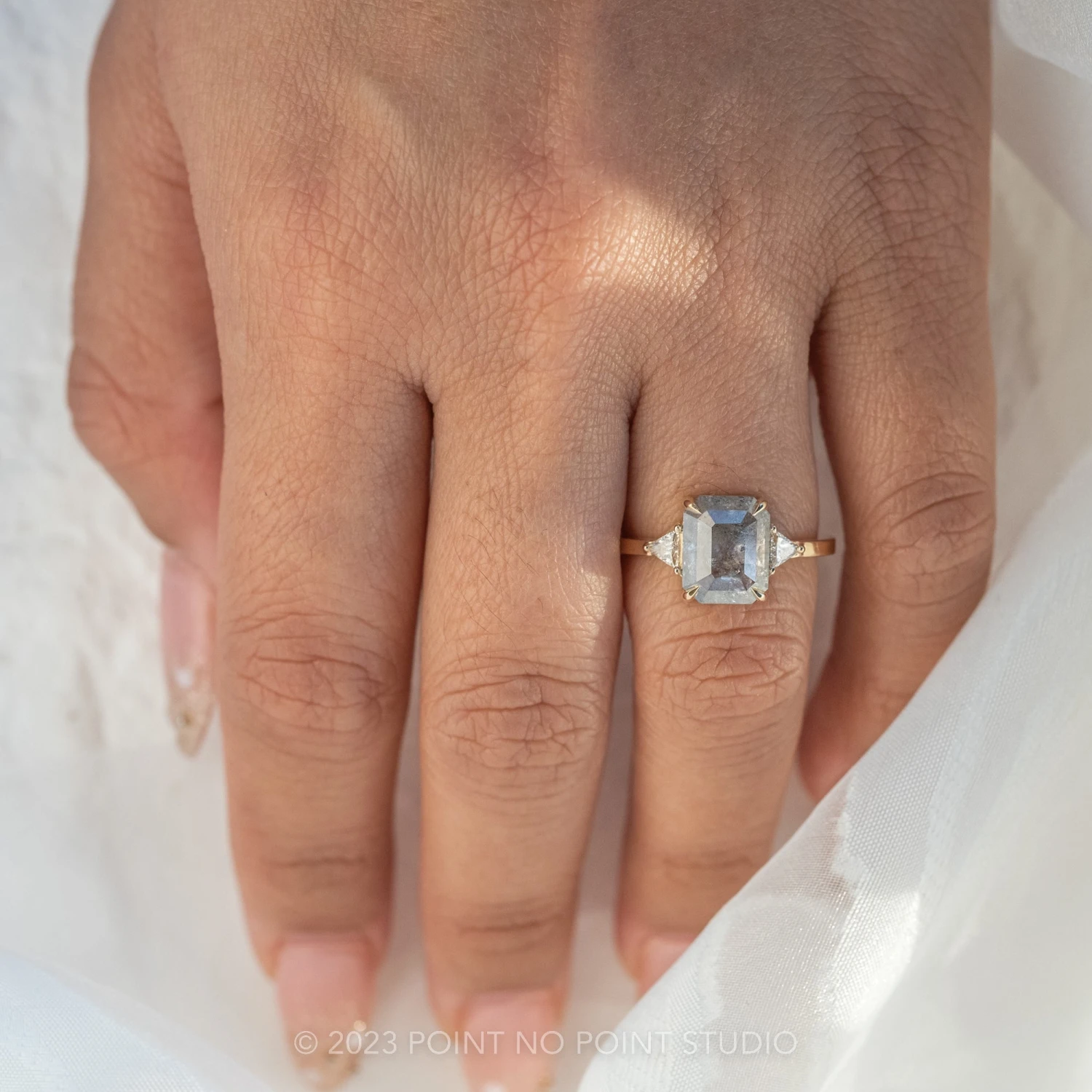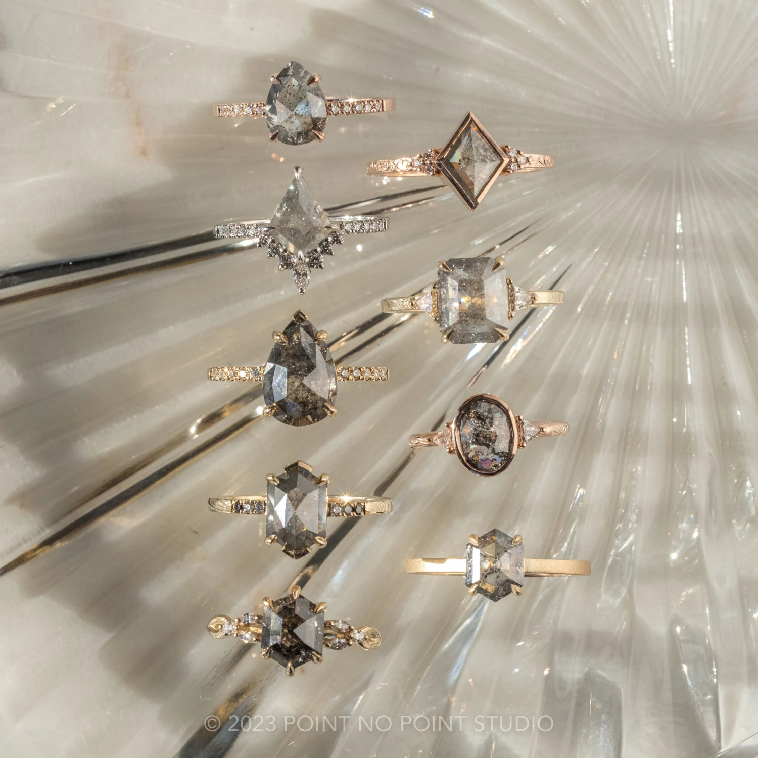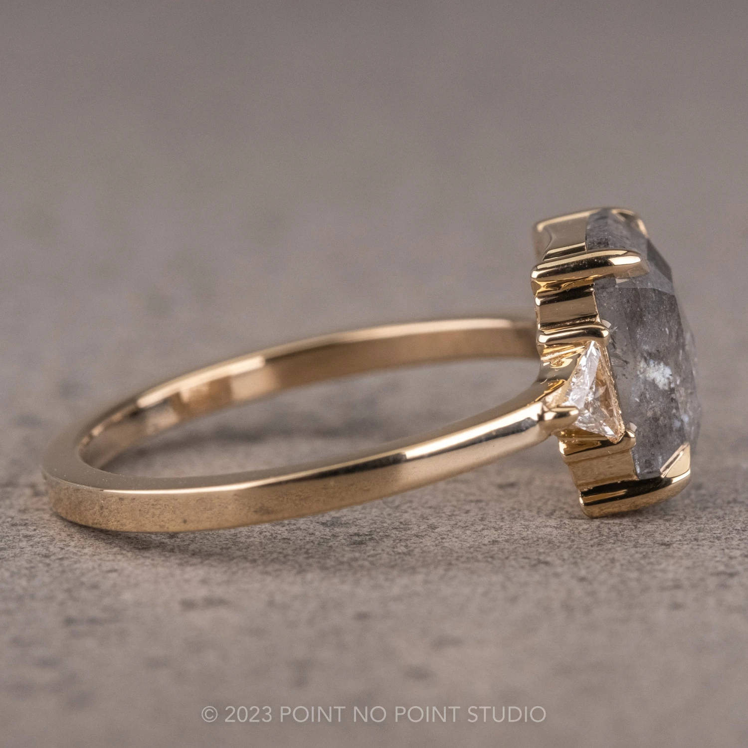 This ring features a beautiful salt and pepper emerald rose cut diamond. The diamond is a top quality, un-enhanced, semi translucent natural grey speckled diamond; set on either side of the center stone are white brilliant cut triangle accent diamonds. The diamond is set into an open back setting which allows you to see and admire the unique inner structure, tones, and marbling of the diamond.