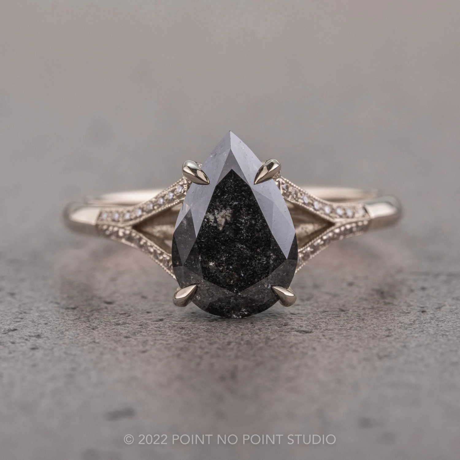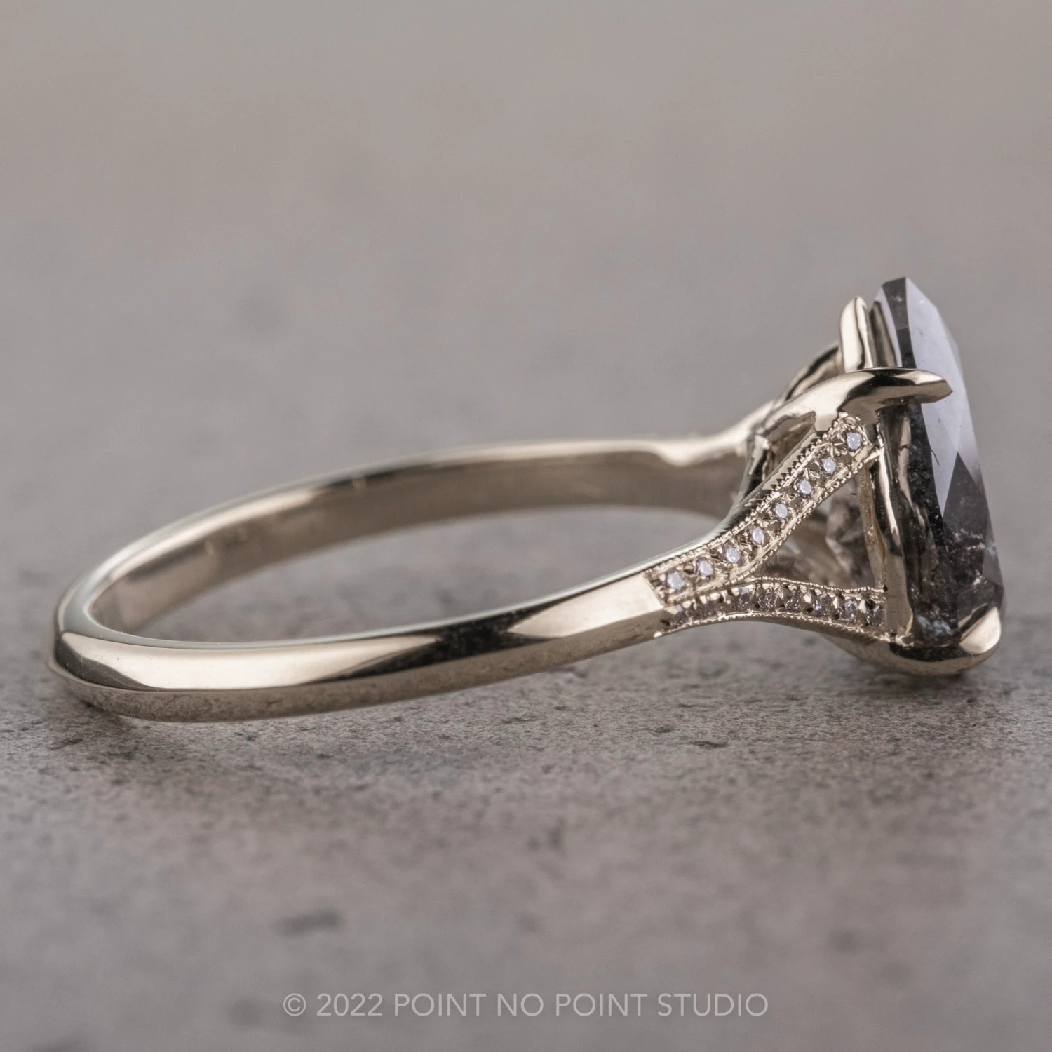 This ring features a stunning natural 2.30 carat black speckled diamond. The hand cut diamond is a top quality natural, non enhanced or treated diamond and is semi-translucent with speckled tones of black and dark charcoal grey.