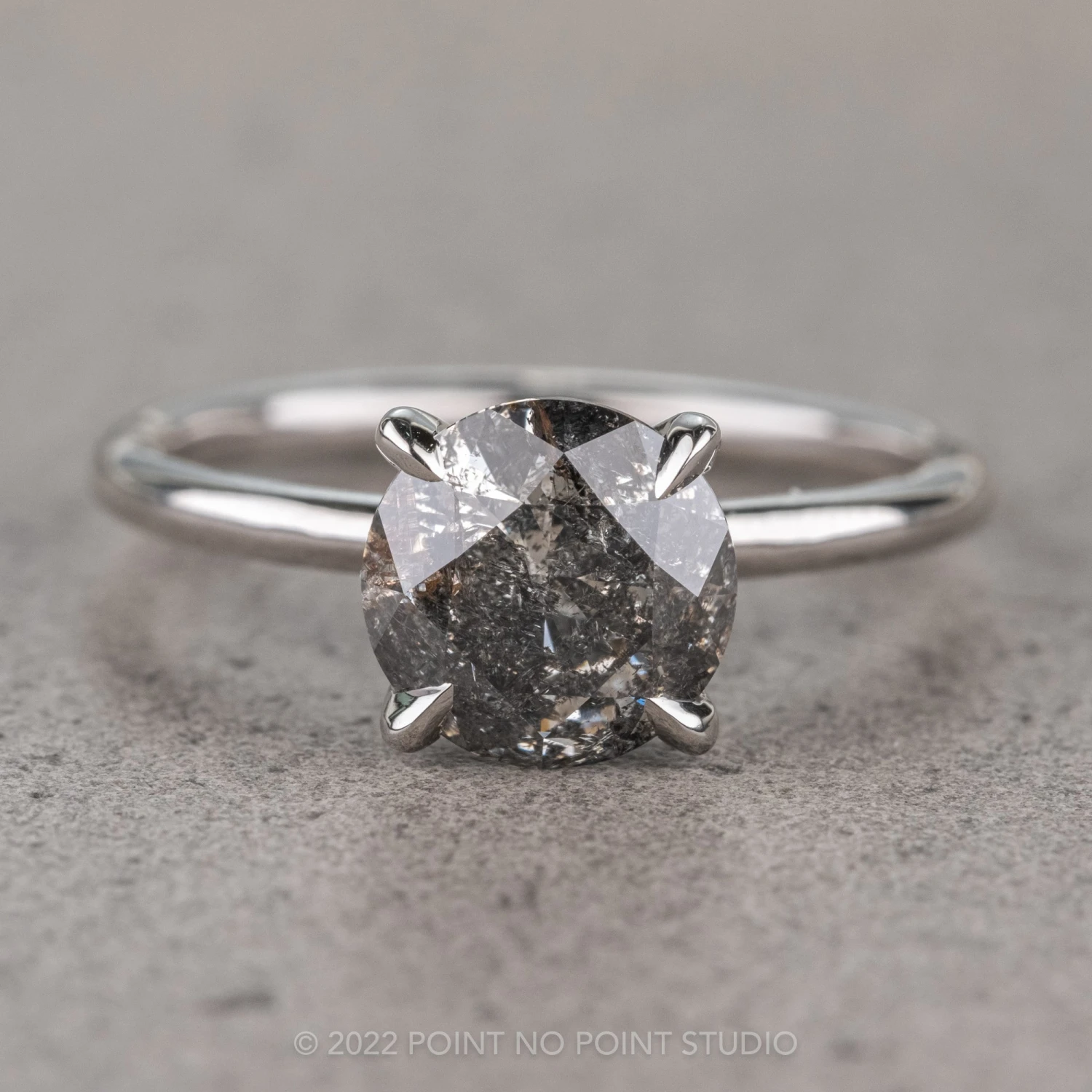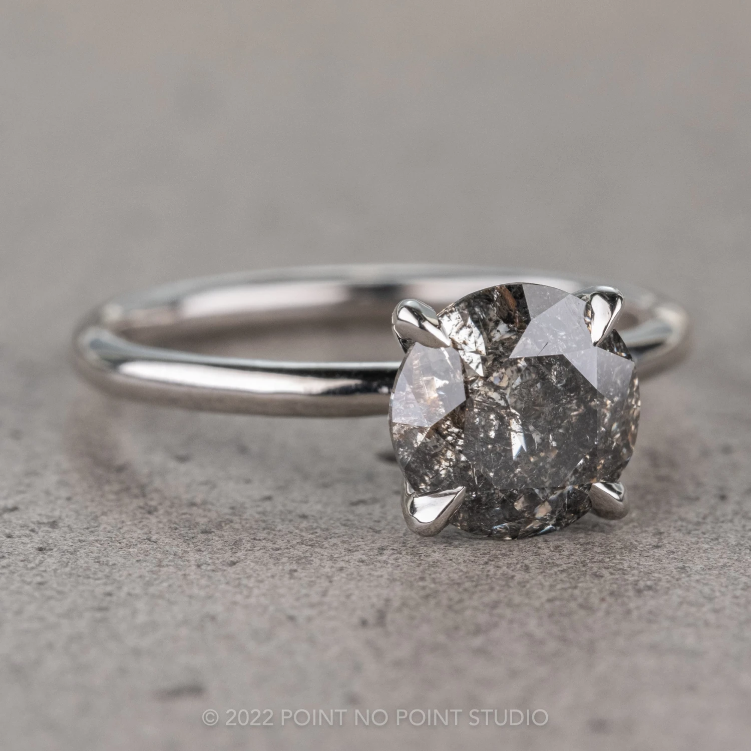 The ring features a beautiful salt and pepper brilliant cut diamond. The diamond sits in a beautiful tulip setting. The setting surrounds and securely grasps the diamond from all angles. The setting has been cut away on the sides so it allows you to view and admire the diamond.