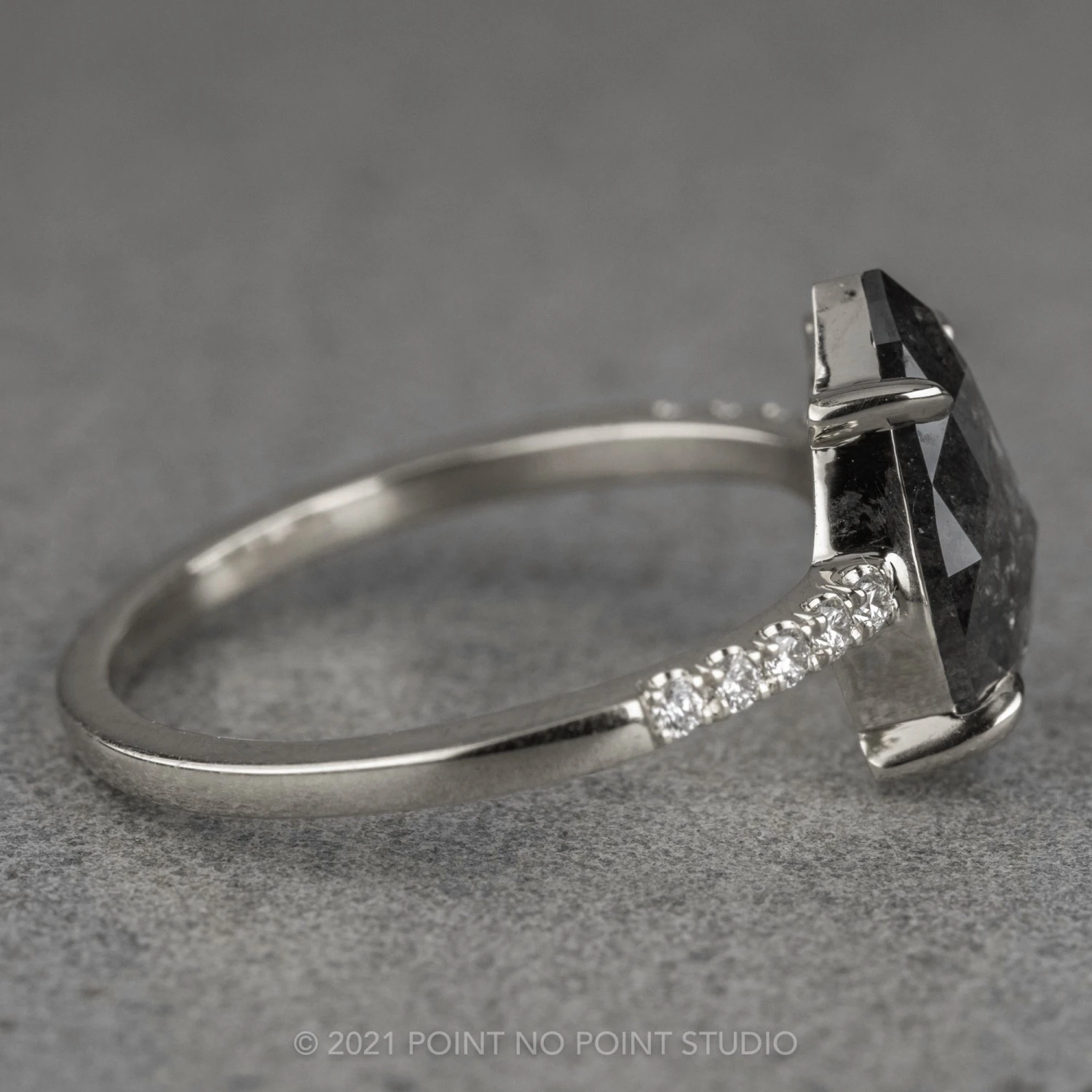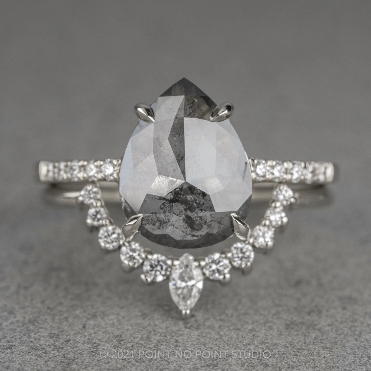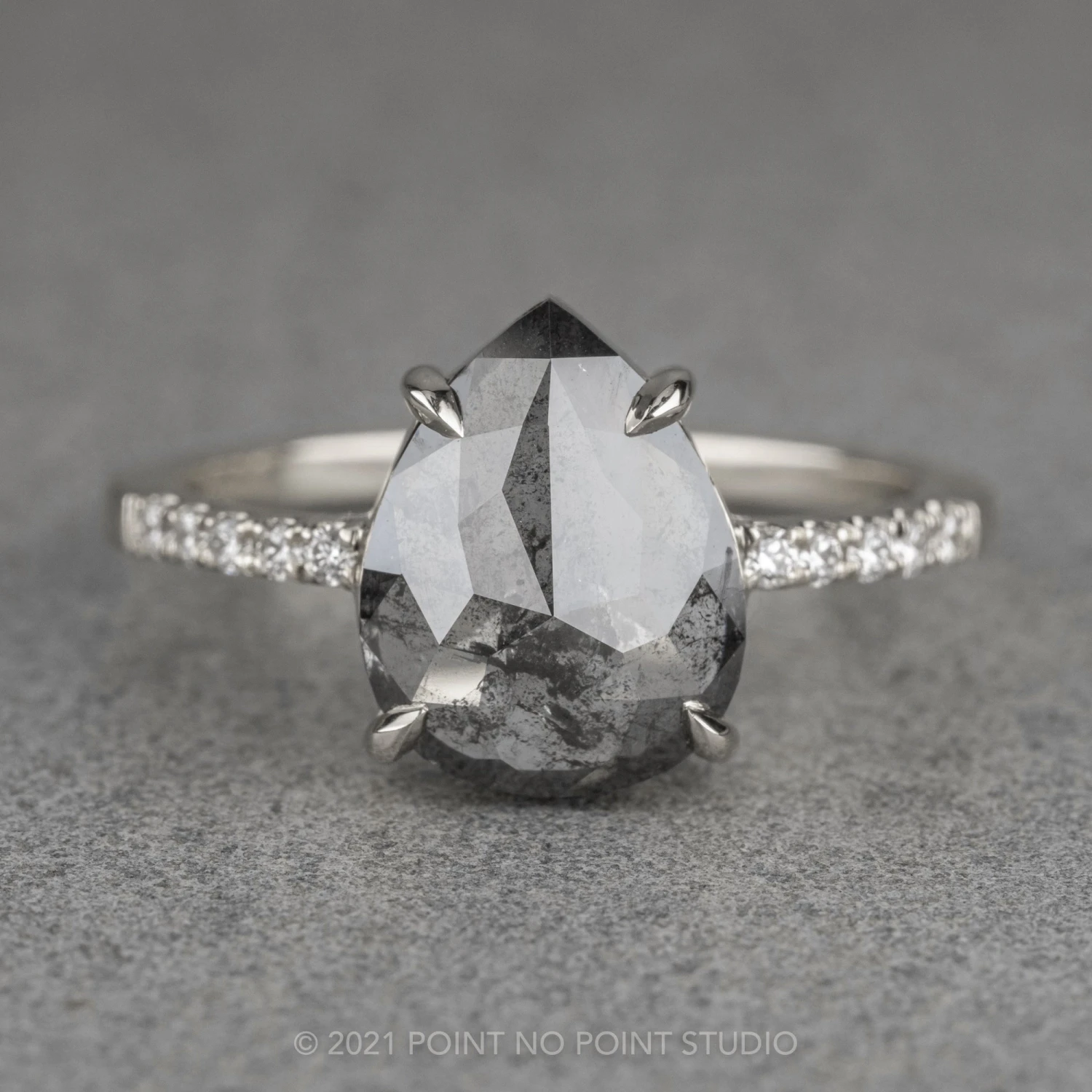 This captivating salt and pepper diamond ring is a stunner! The ring features a 2.39 carat rose cut salt and pepper pear shaped diamond. The diamond is a top quality natural stone, the color of the diamond is semi-translucent with salt and pepper like speckles. Set into the band are white round brilliant cut diamonds for that extra sparkle!