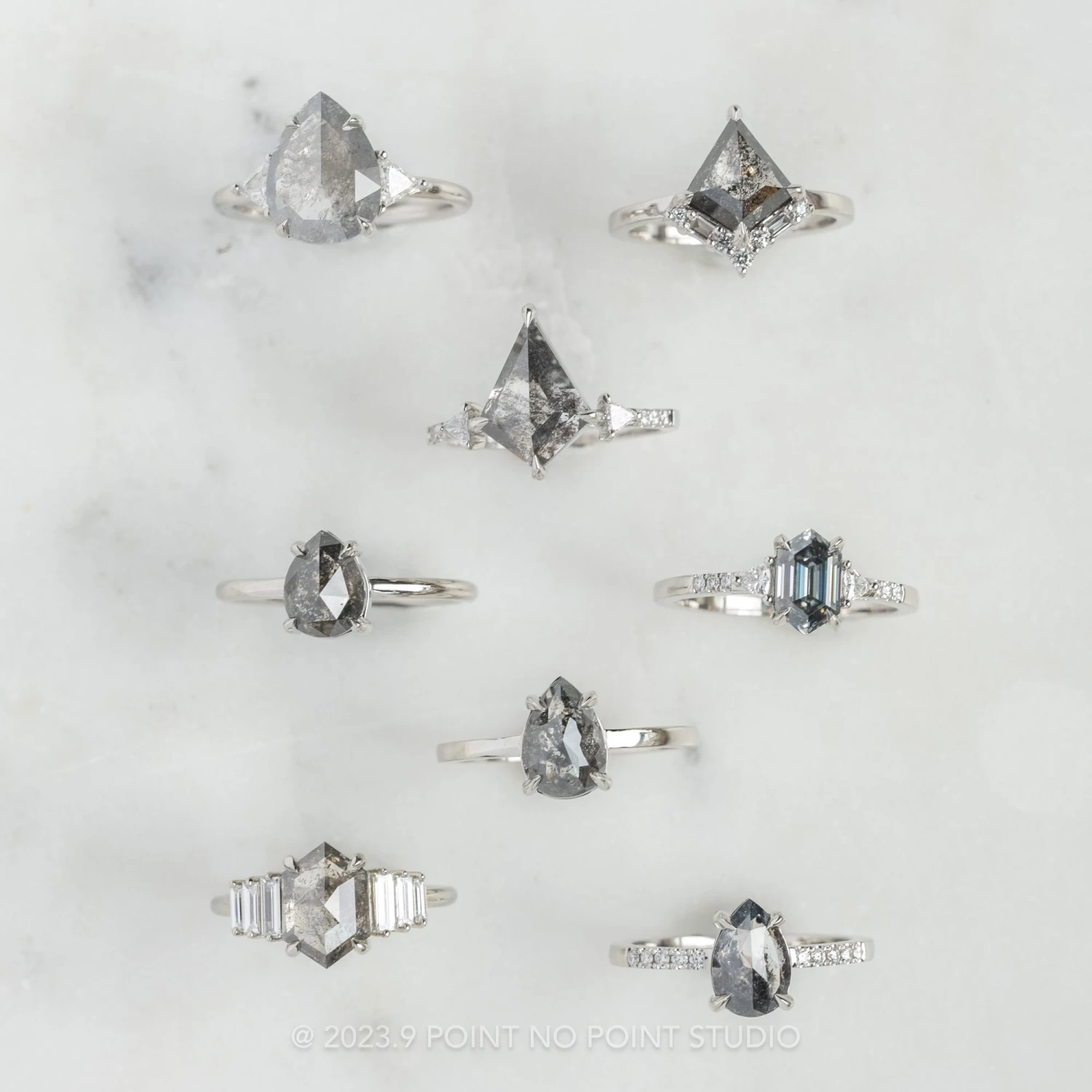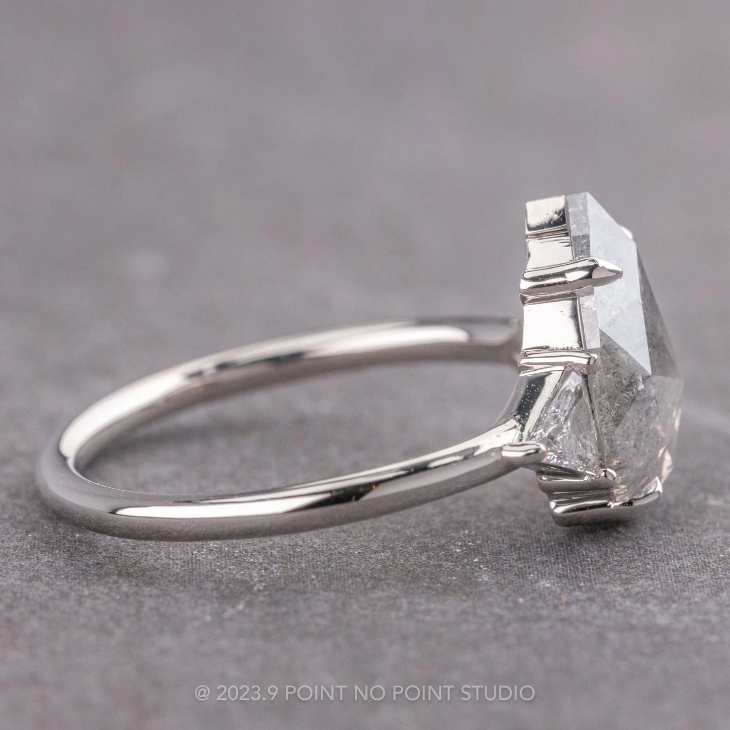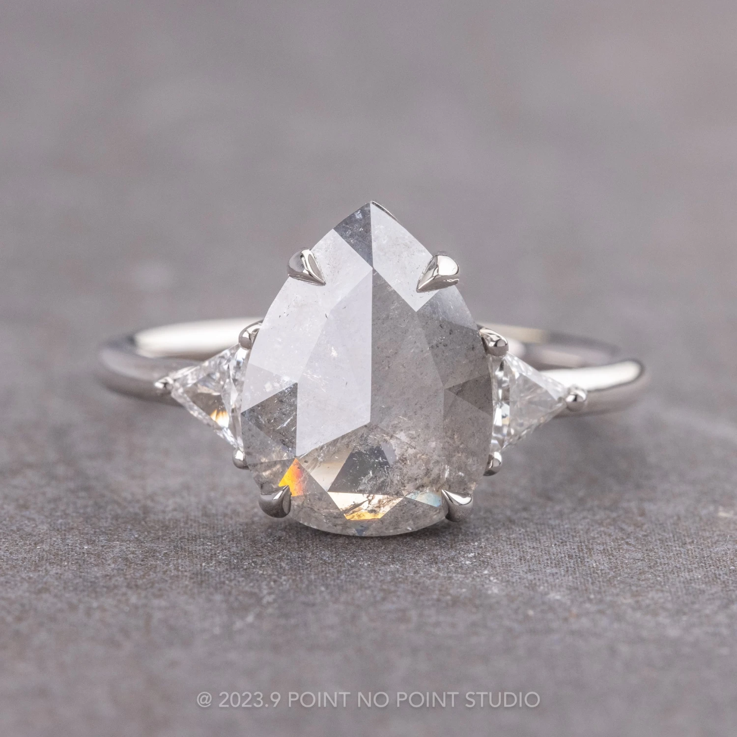 This ring features a beautiful 2.29 carat grey toned salt and pepper rose cut pear shaped diamond. The diamond is a top quality, un-enhanced diamond; it is semi translucent with unique tones and facets that catch the light. Set on either side of the center stone are sparkly white triangle diamonds.