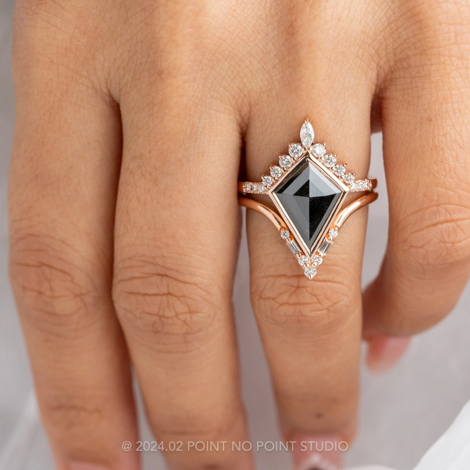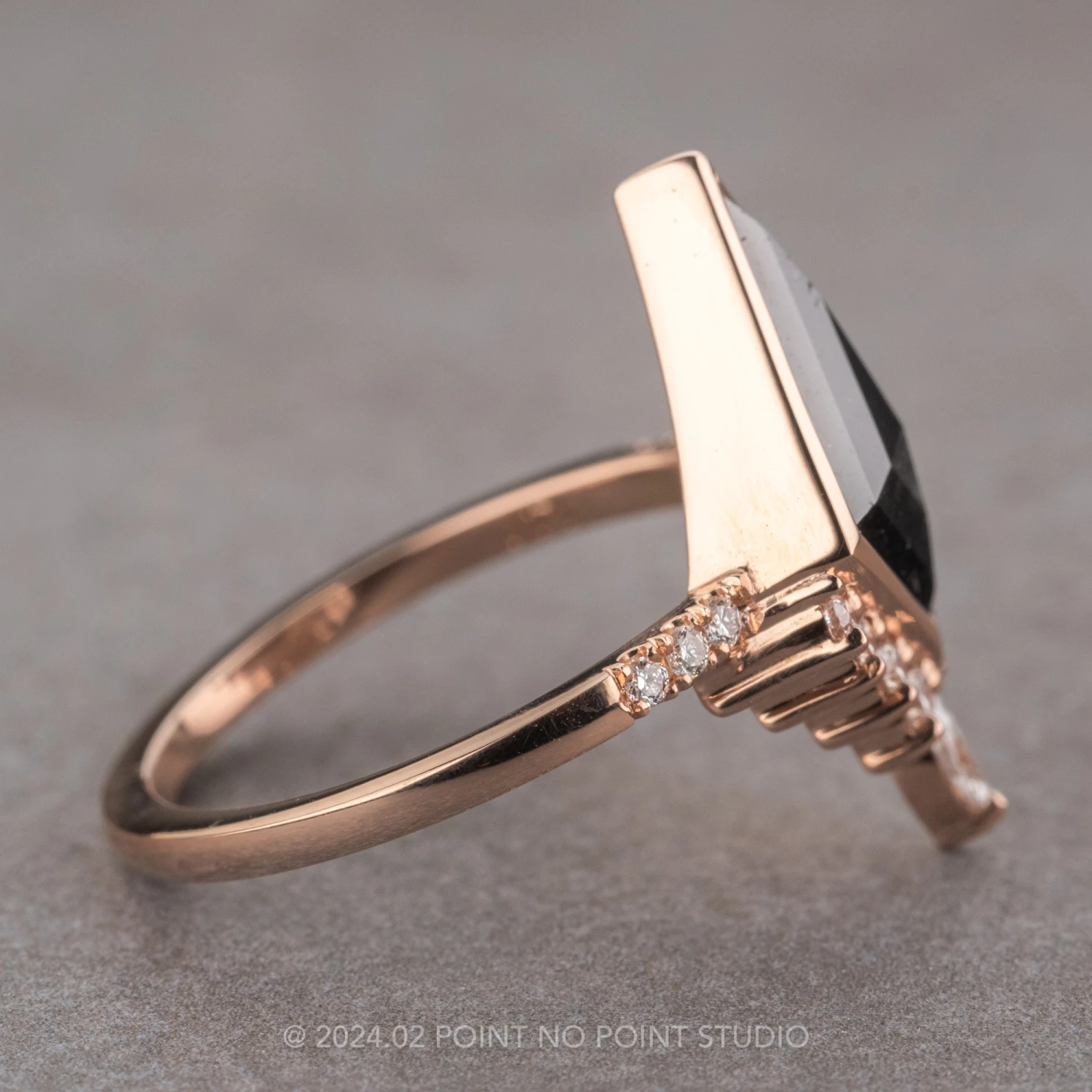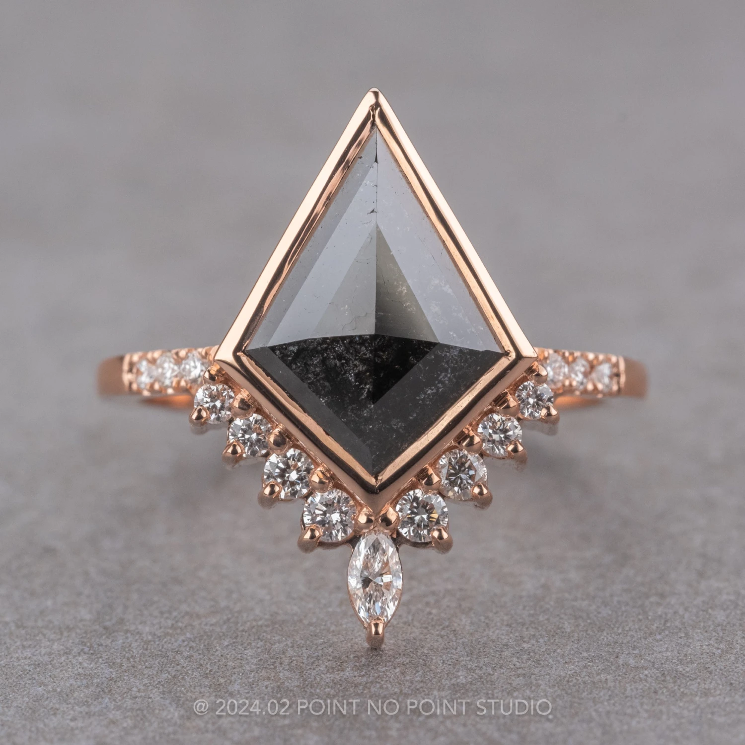This timeless engagement ring features a 2.29 carat black speckled kite rose cut diamond. The diamond is a top-quality, all-natural stone that has not been heat treated or enhanced in any way; it is semi-translucent with unique tones and facets that catch the light. The diamond sits within a half-halo of GHSI faceted white diamonds with the focal point being a white marquise diamond. Set into the band are three GHSI white round accent diamonds for that extra sparkle!