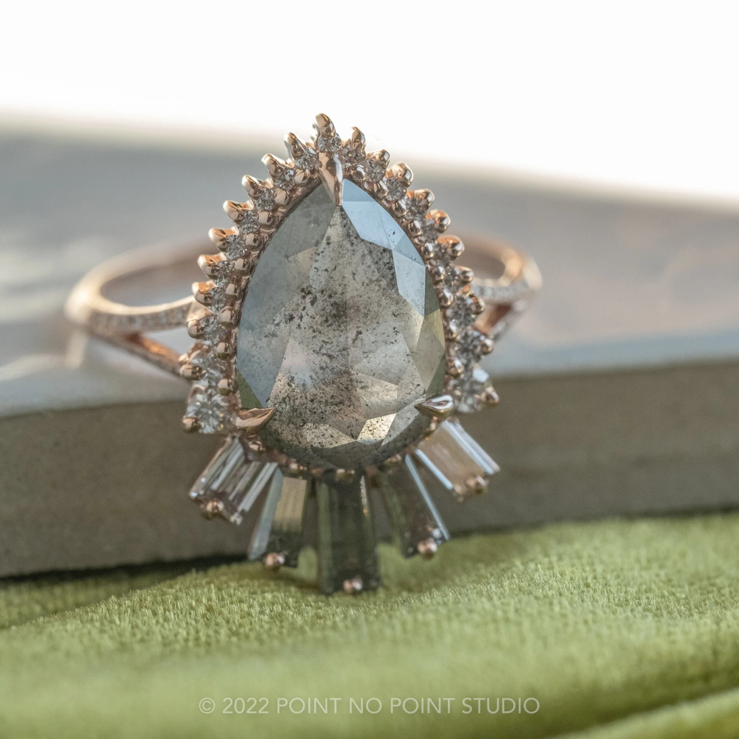 An engagement ring that has it all; with the focal point being an incredible 2.21 carat semi-translucent smokey grey and black speckled rose cut pear shaped center diamond. The pear diamond is an all-natural top-quality stone that has not been heat treated or enhanced in any way!