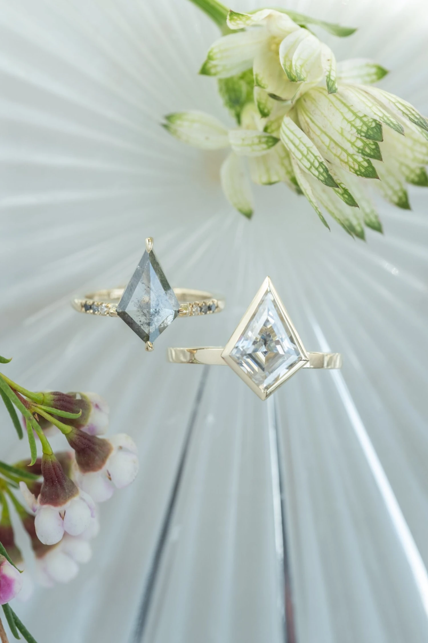 This timeless engagement ring features a stunning kite shaped moissanite. Moissanites are a great alternative to diamonds, they are man-made and conflict-free. They have almost the same hardness as a diamond as well as similar coloring if not better. Moissanites have an E-F coloring with VVS2 clarity.