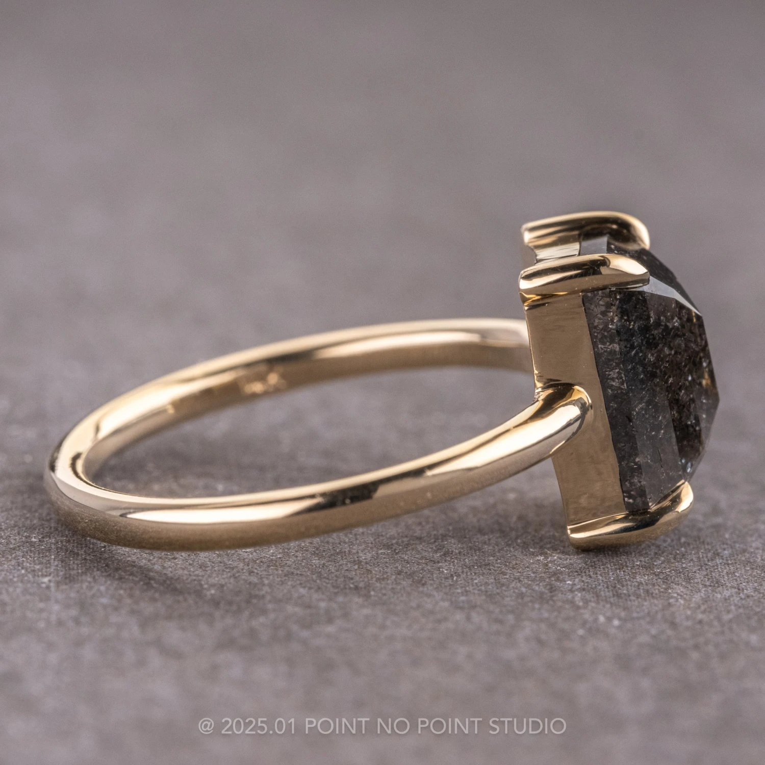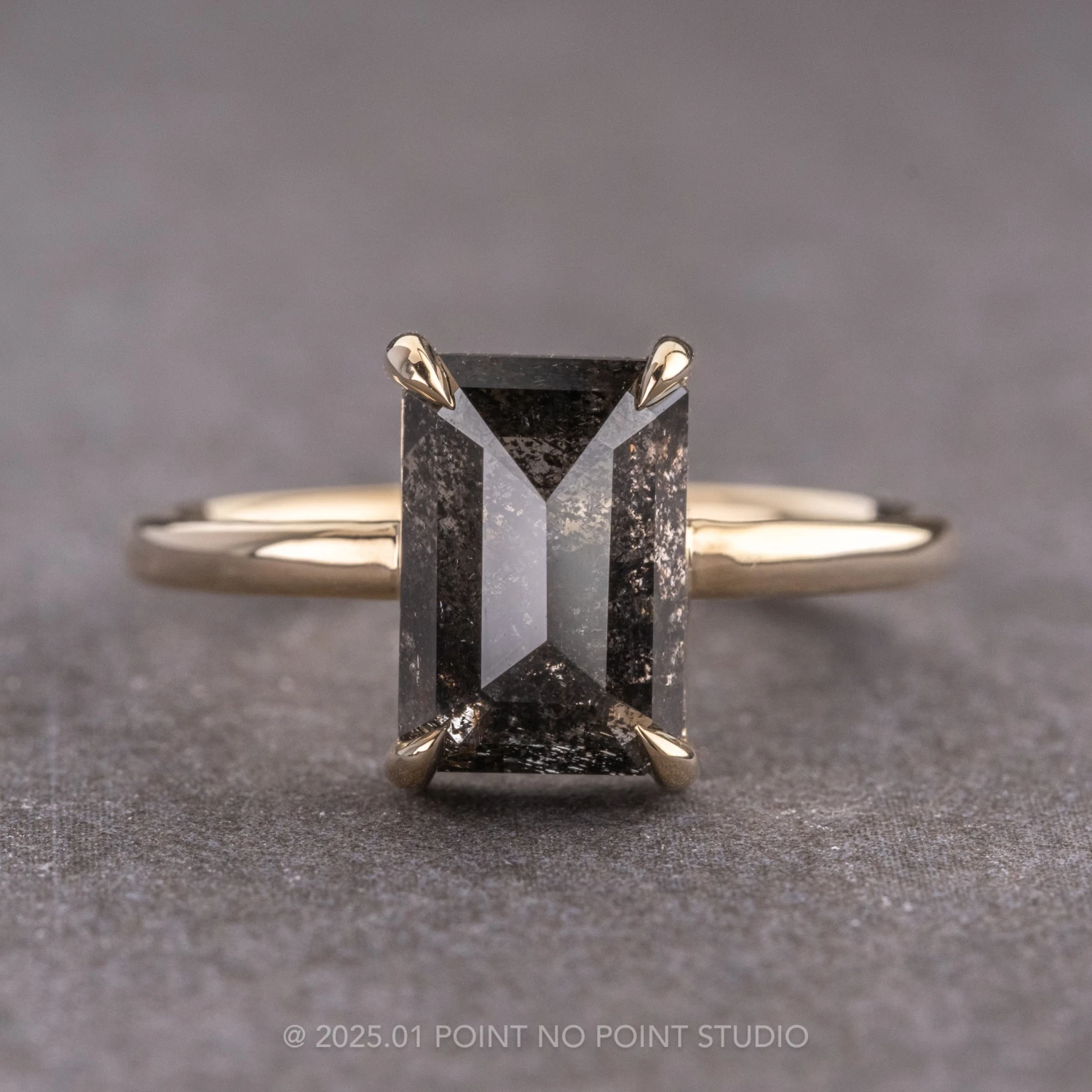 The ring features a stunning 2.85 carat emerald shaped rose cut diamond. The diamond is a top quality all-natural diamond that is not heat treated or enhanced in anyway – it it naturally semi-translucent with unique inner black speckling.